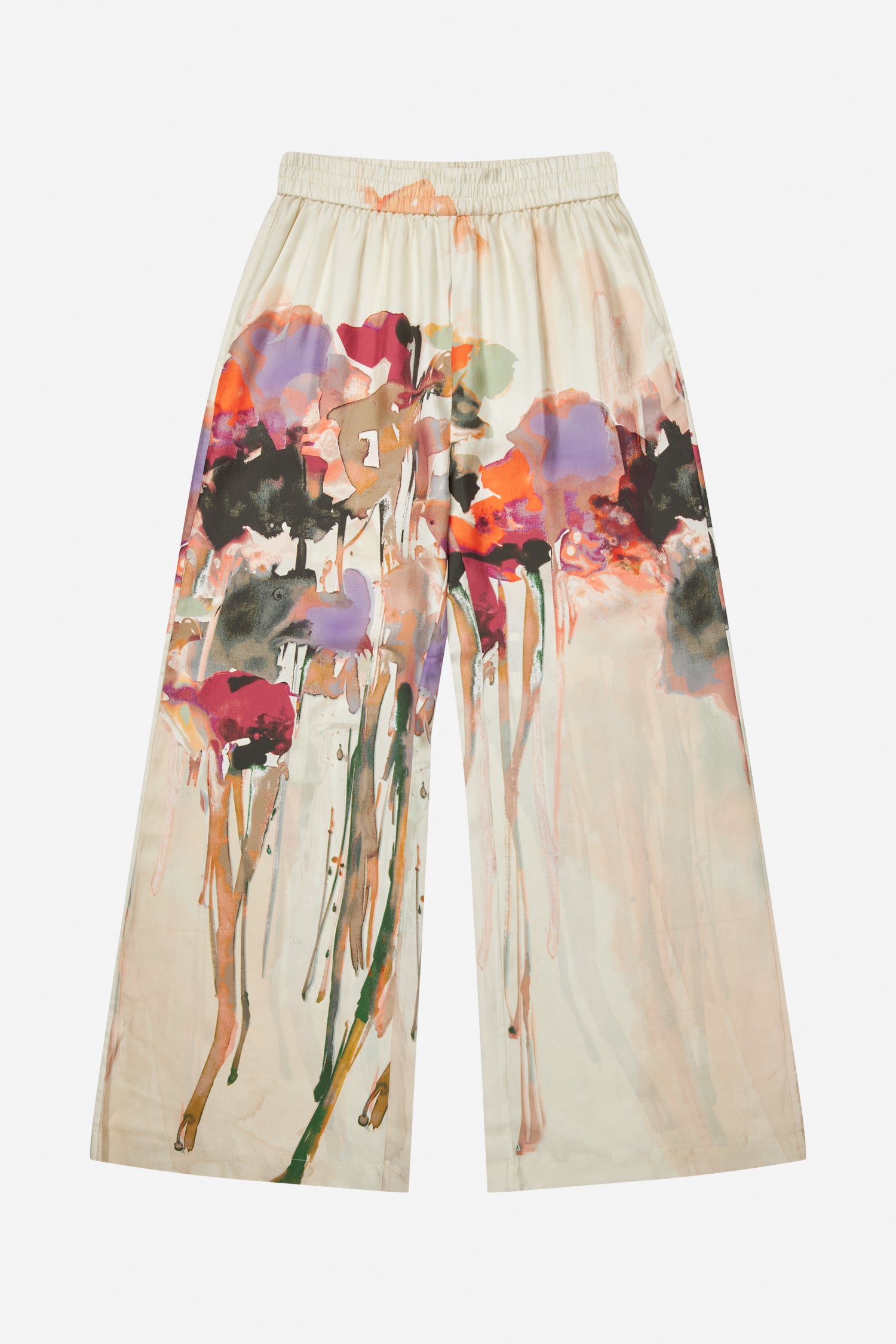 Beautiful pants made of 100% silk, with an elegant art print. These pants are designed with an elastic waist and elegant side pockets.