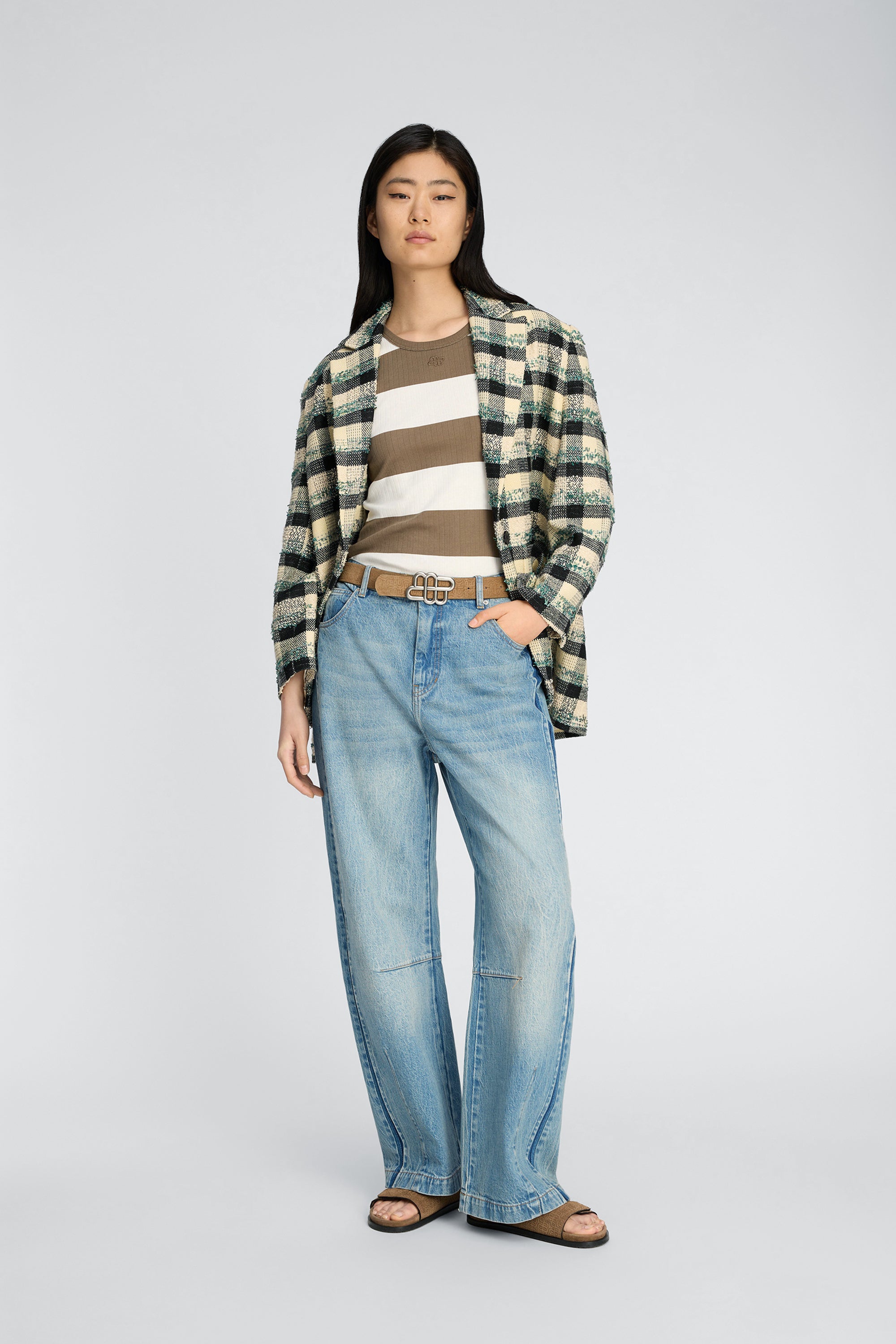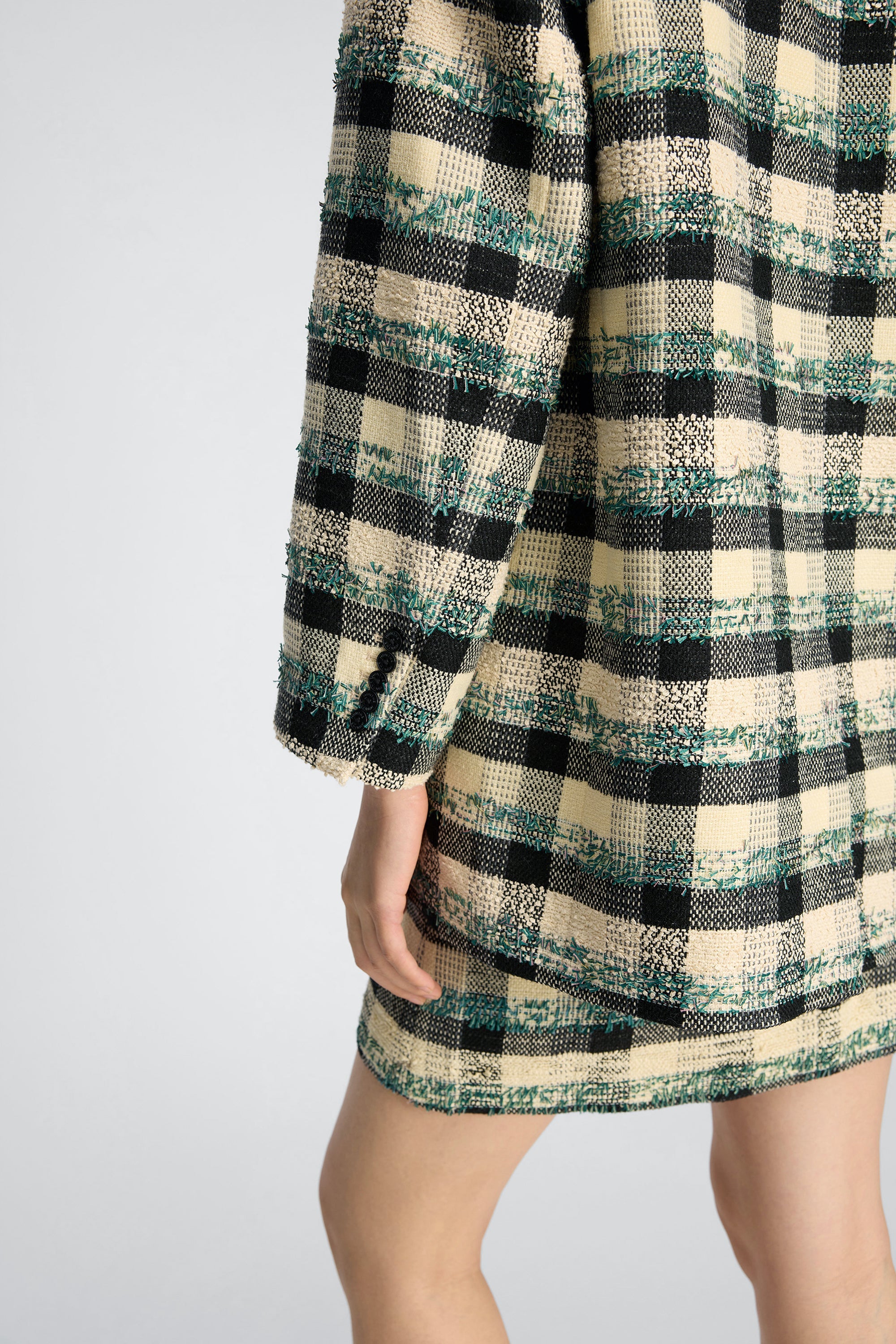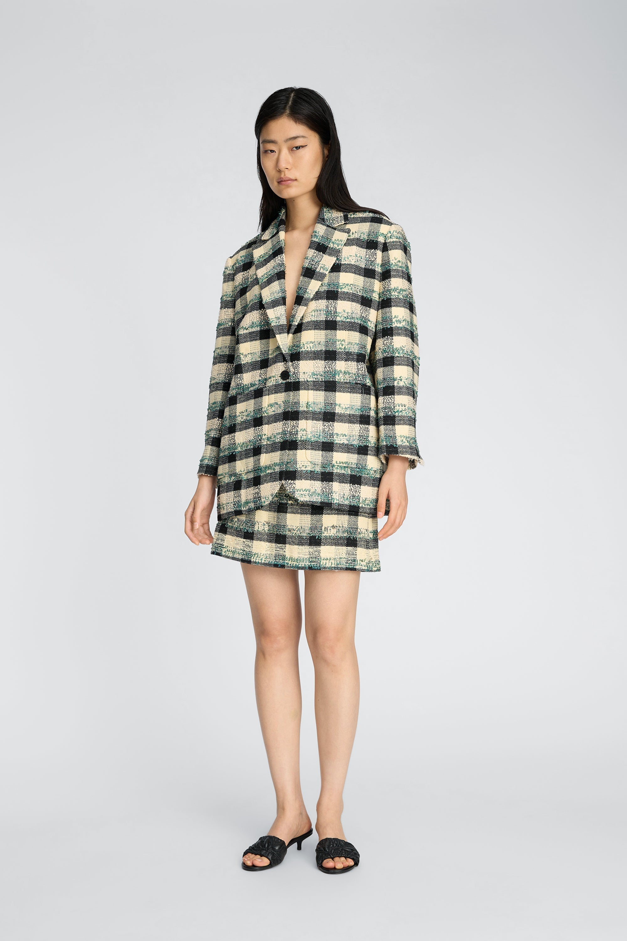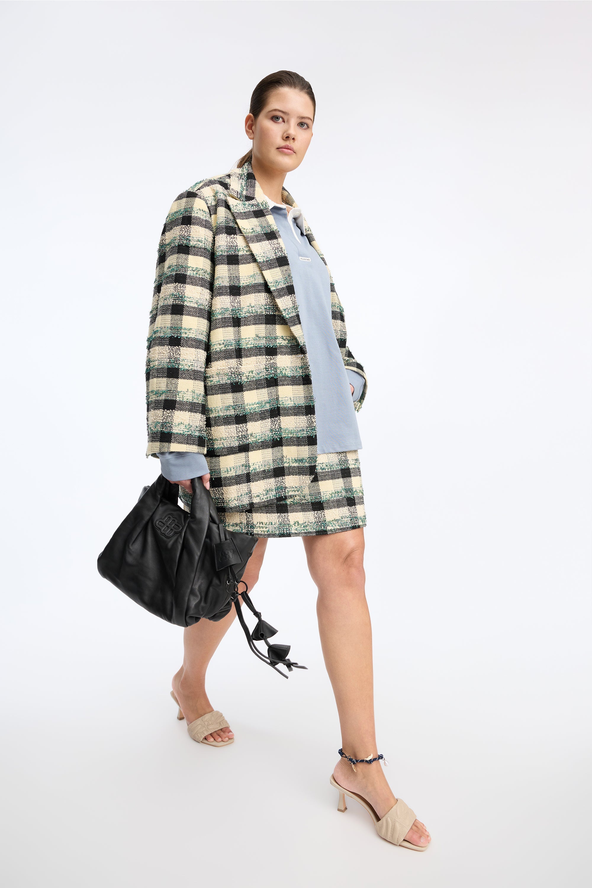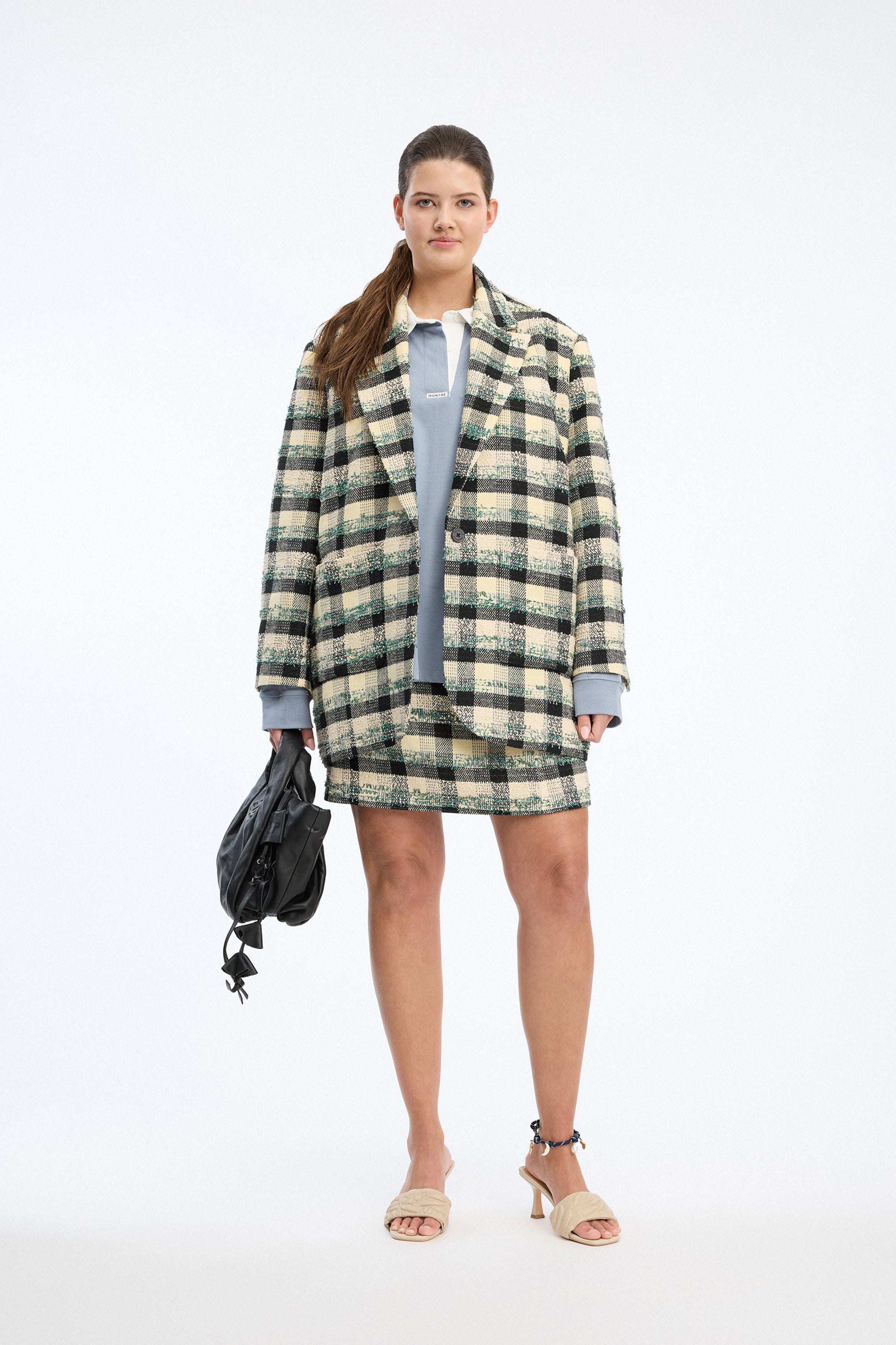 This blazer is made from a soft woven fabric featuring a distinctive check pattern. It offers a slightly oversized silhouette, a single-button closure, and two welt pockets for a relaxed yet polished look.