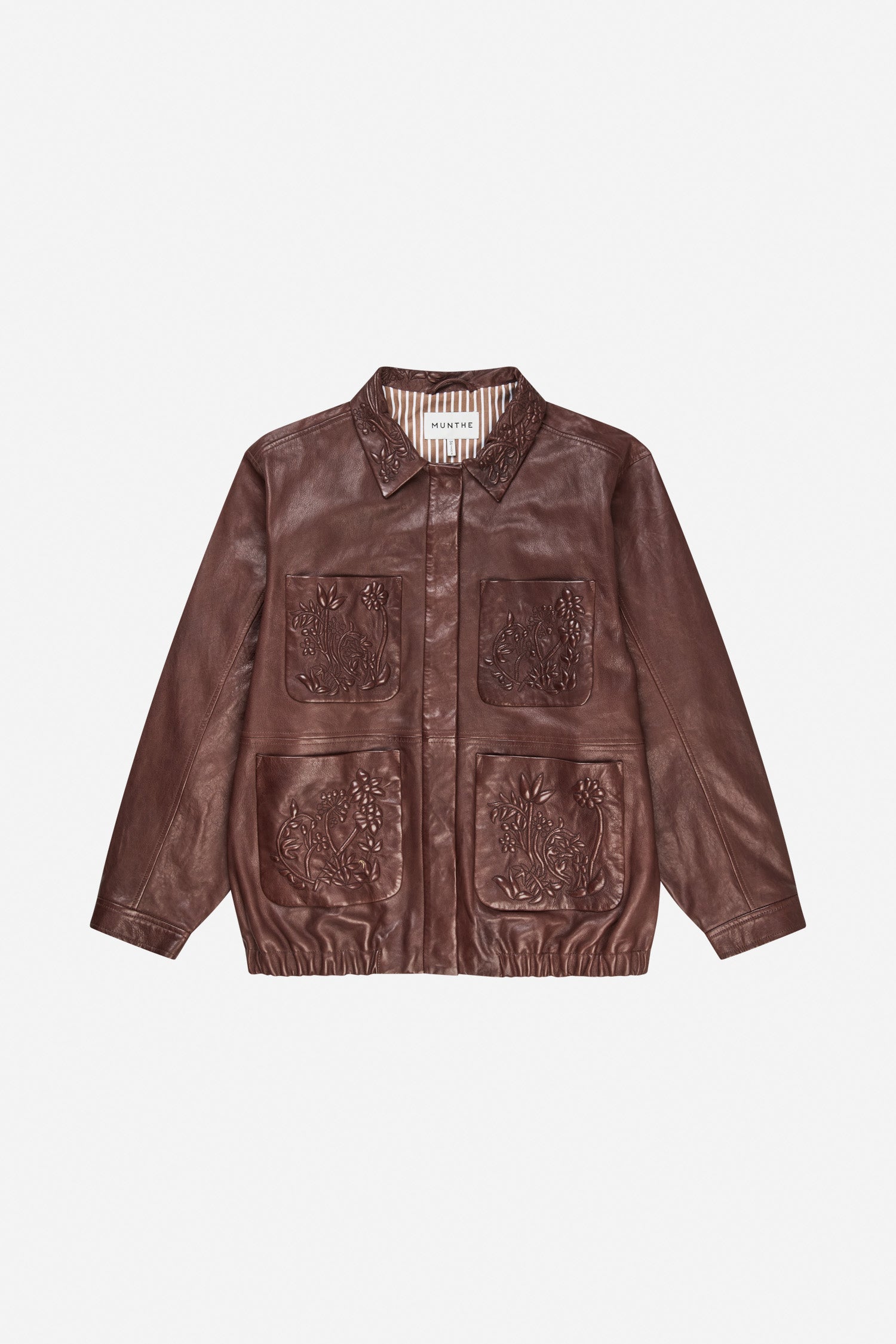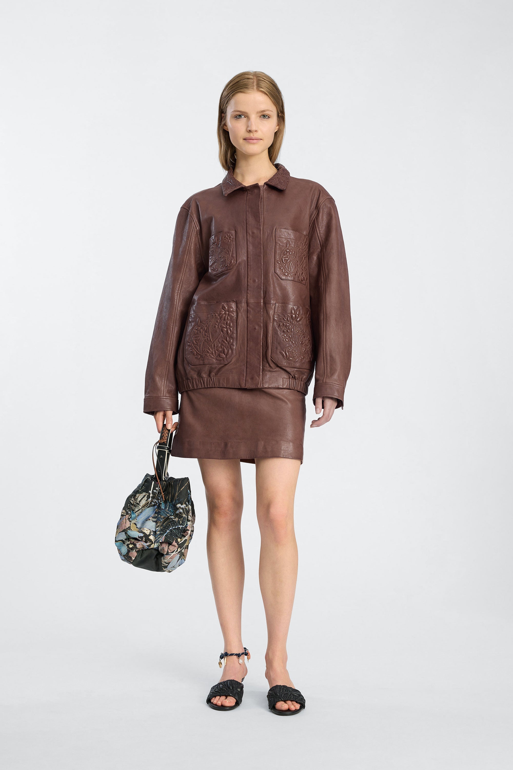This jacket is crafted from soft lamb leather in a loose, relaxed fit. The embossed pocket details has an elegant, botanical texture. It features a concealed zipper and elasticated edges that gently shape the silhouette.