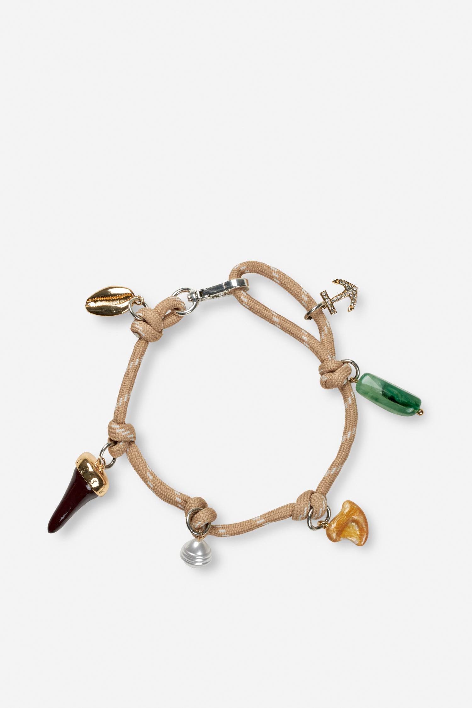 The BAYU anklet is crafted from a soft rope material and detailed with charms including pearls, stones, an anchor charm and a shell charm.