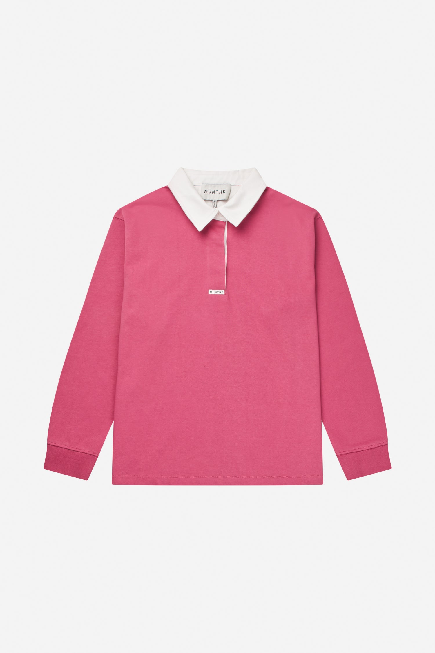 This polo top features a contrasting white collar and long sleeves, all in a stunning berry color. Add a pop of color to your wardrobe with this statement piece.