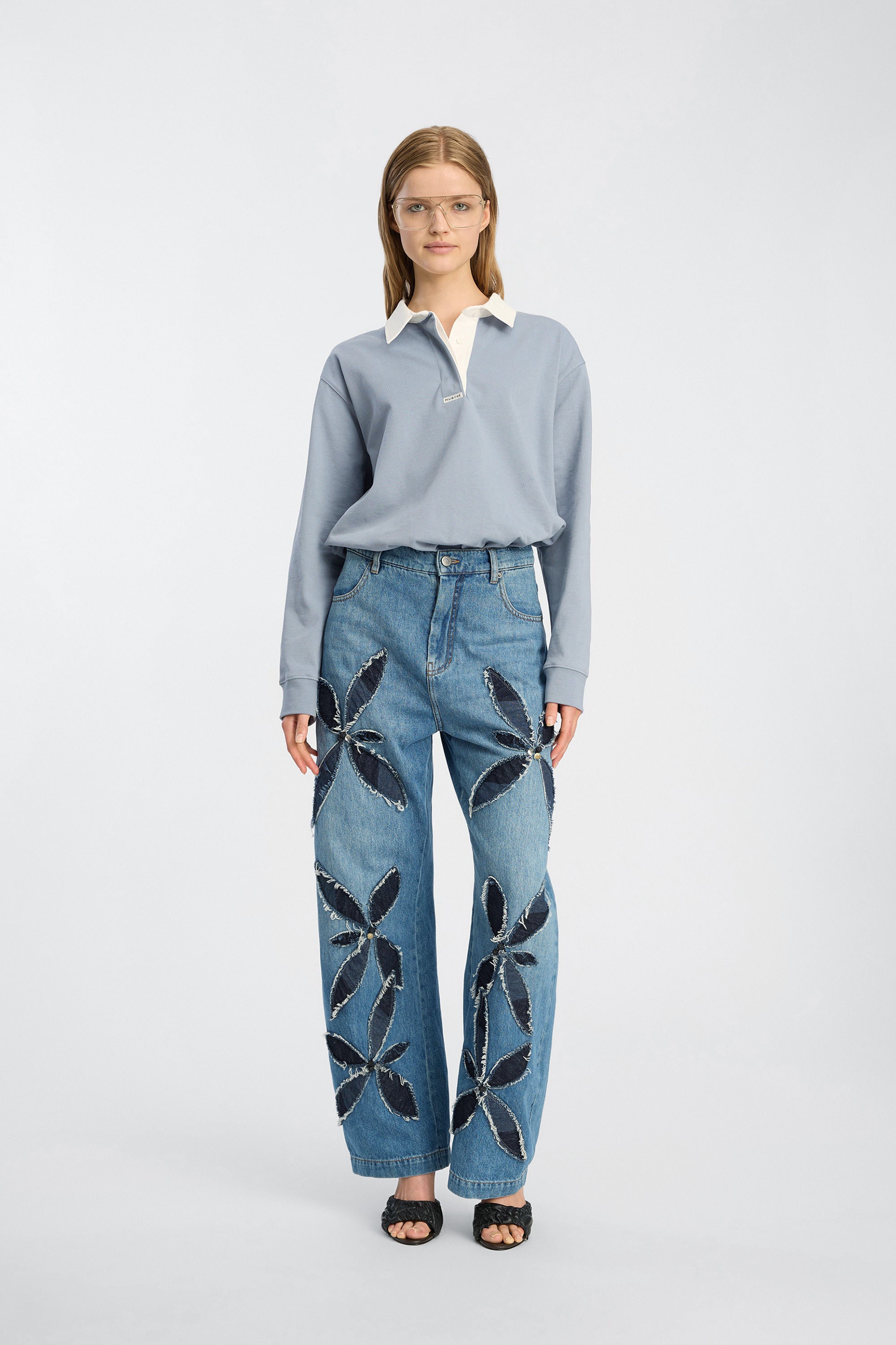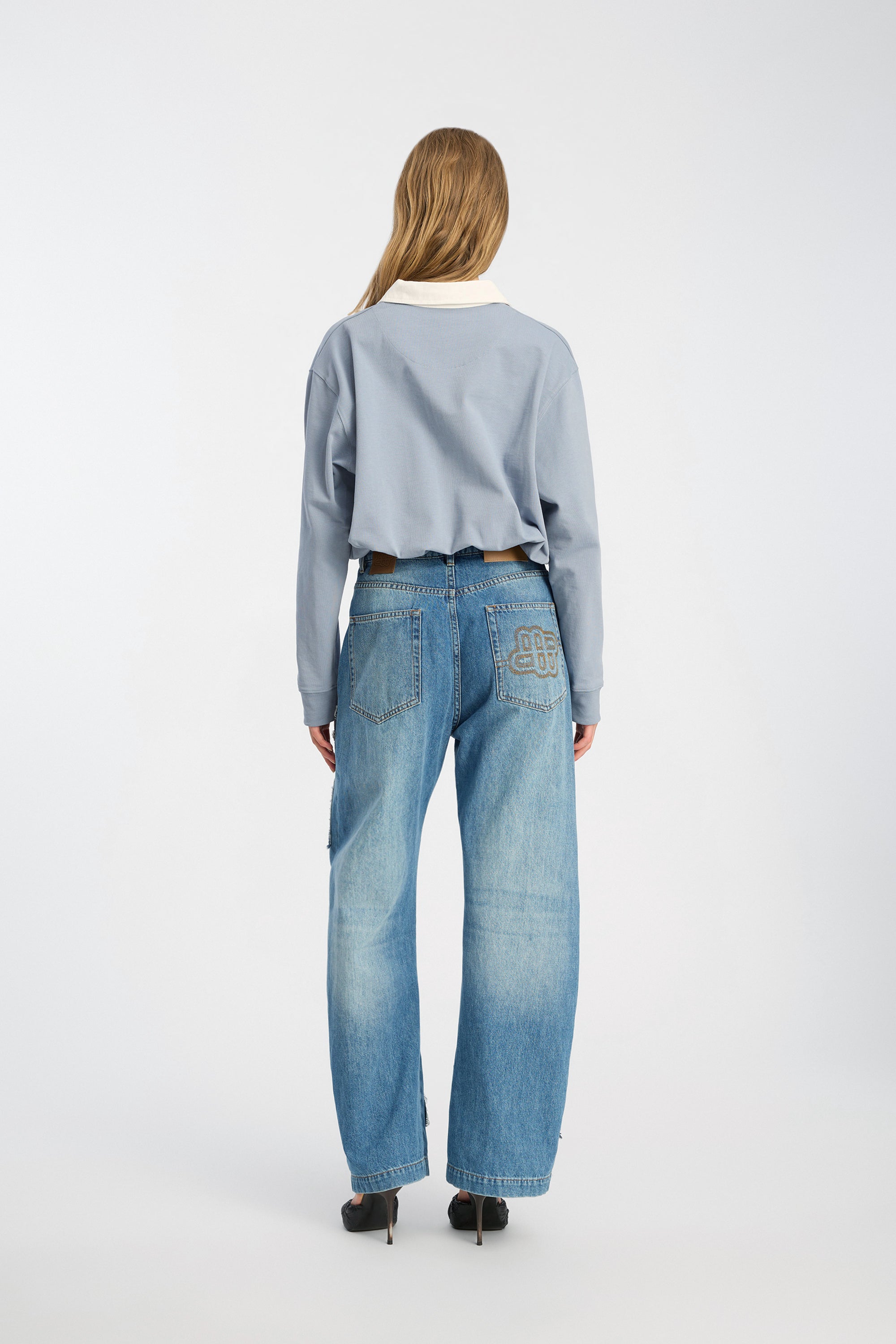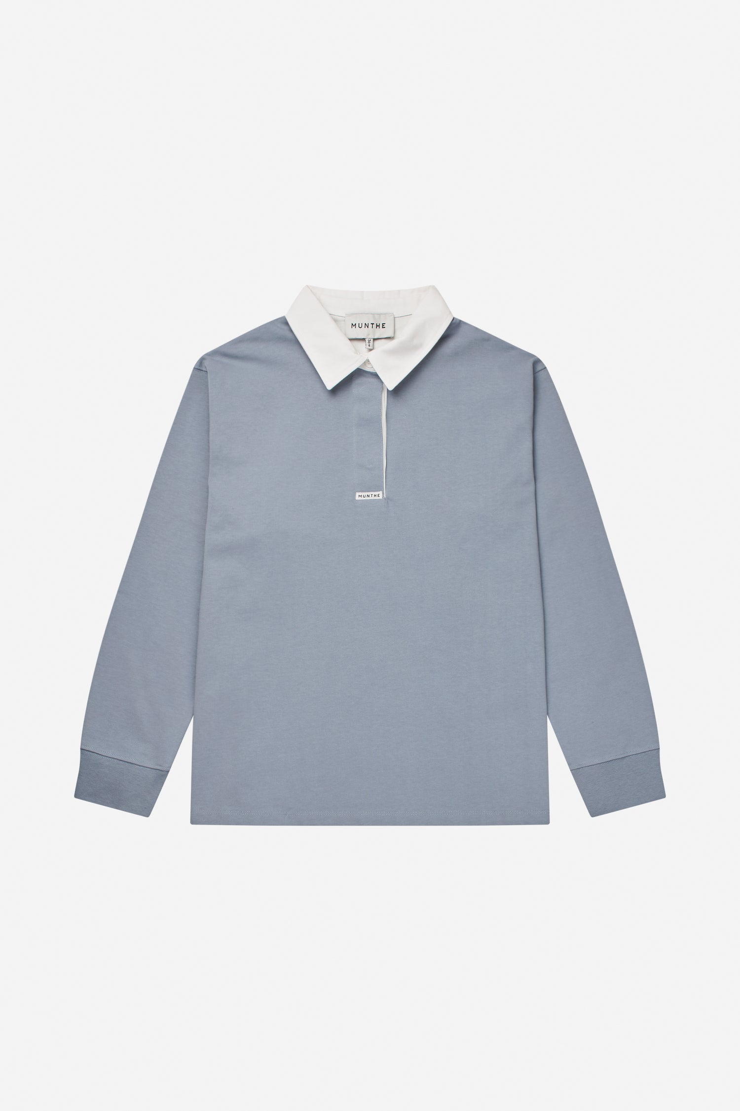This polo top features a contrasting white collar and long sleeves, all in a stunning dusty blue color. A beautiful stable to add to any outfit.