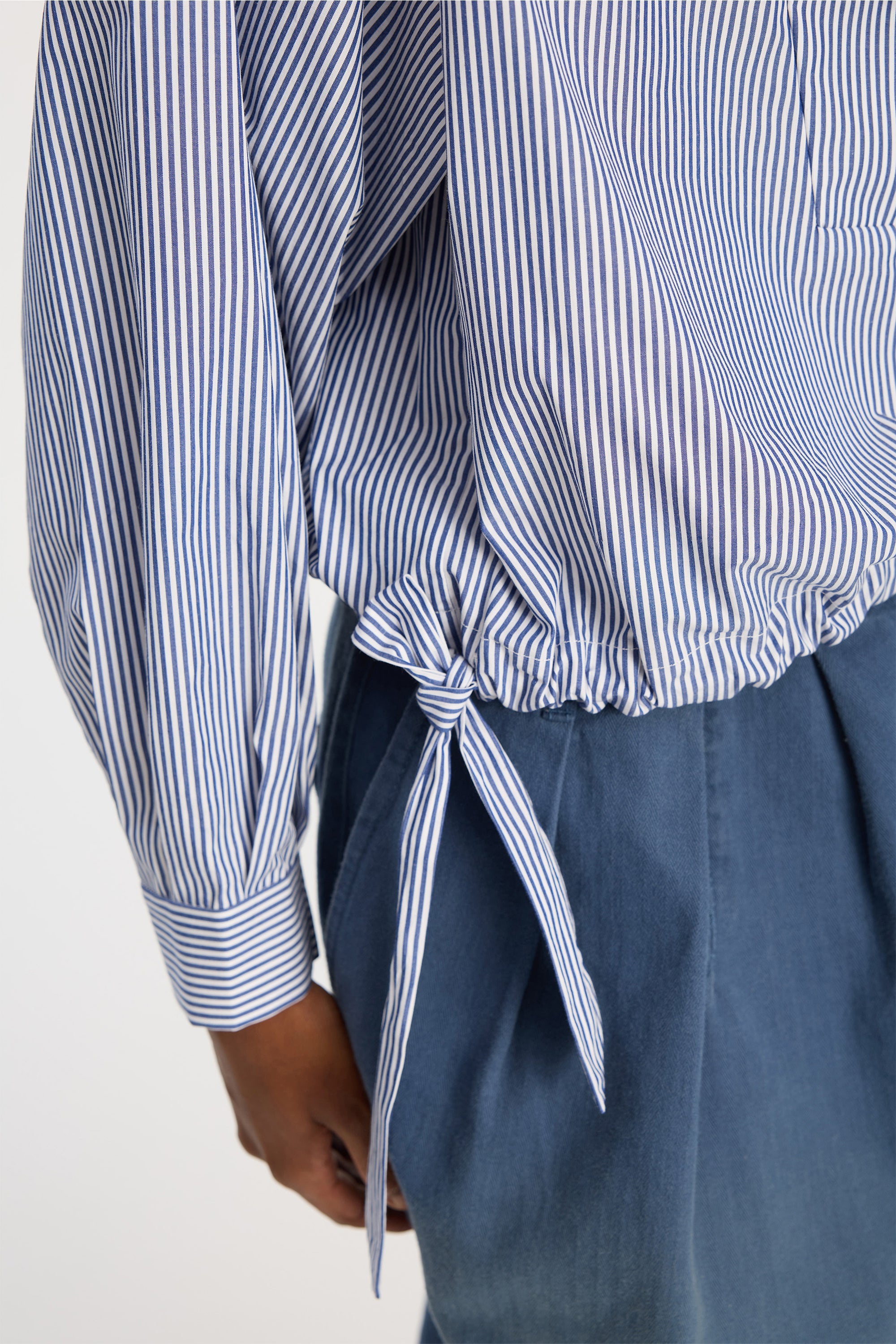 The blouse is crafted from a striped fabric, a wide, draped neckline and collar. It features long sleeves and a side tie detail that adds a subtly relaxed silhouette.