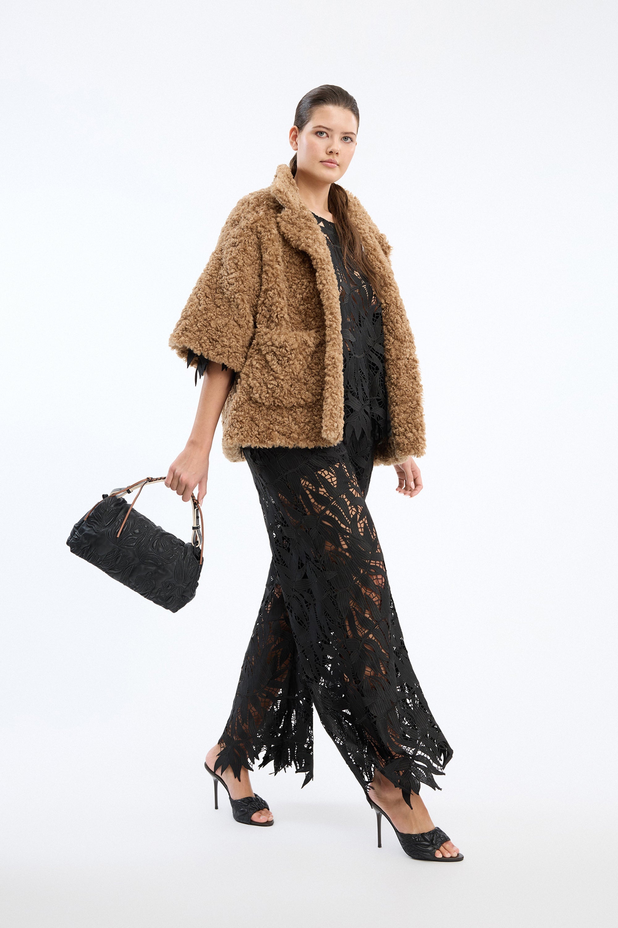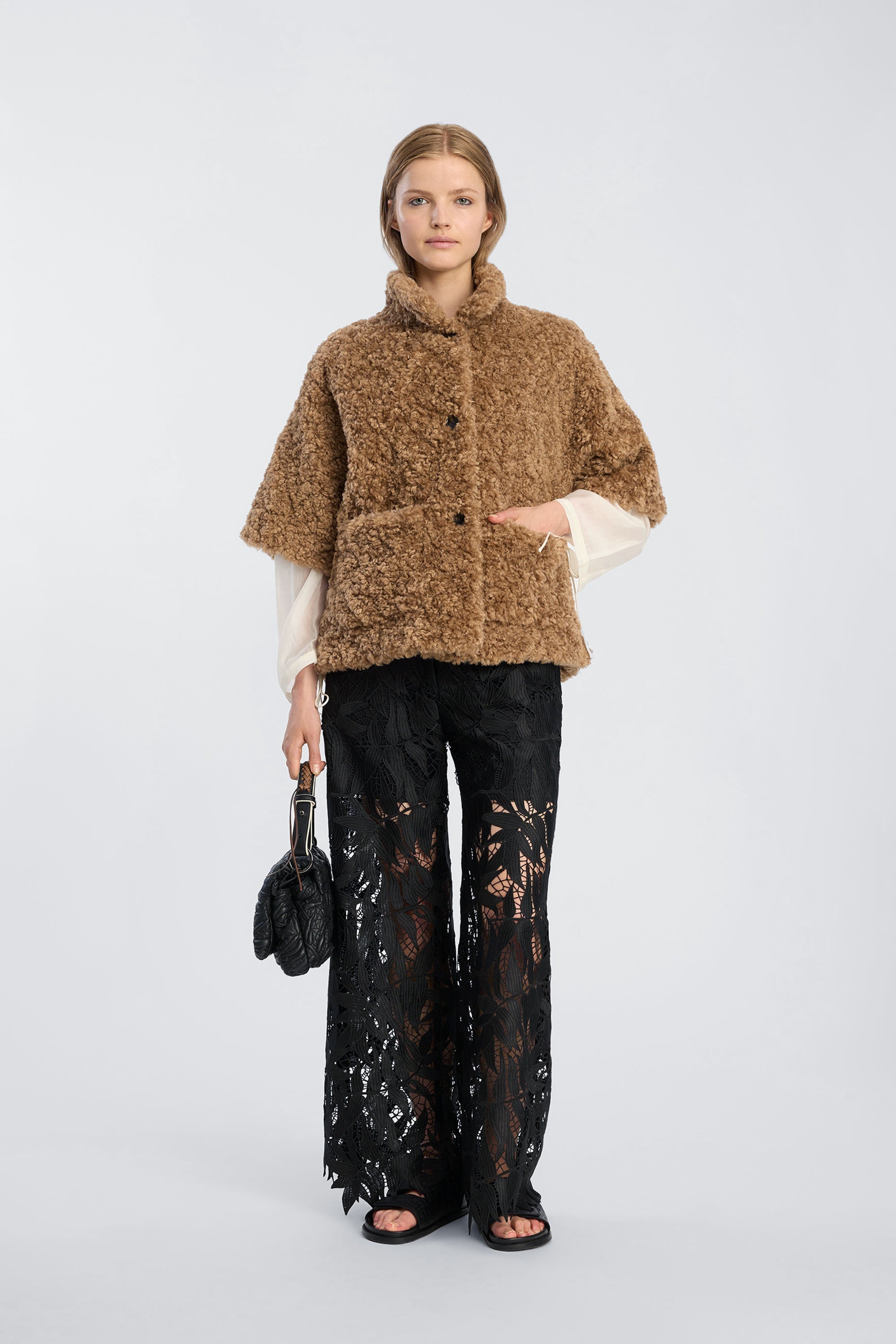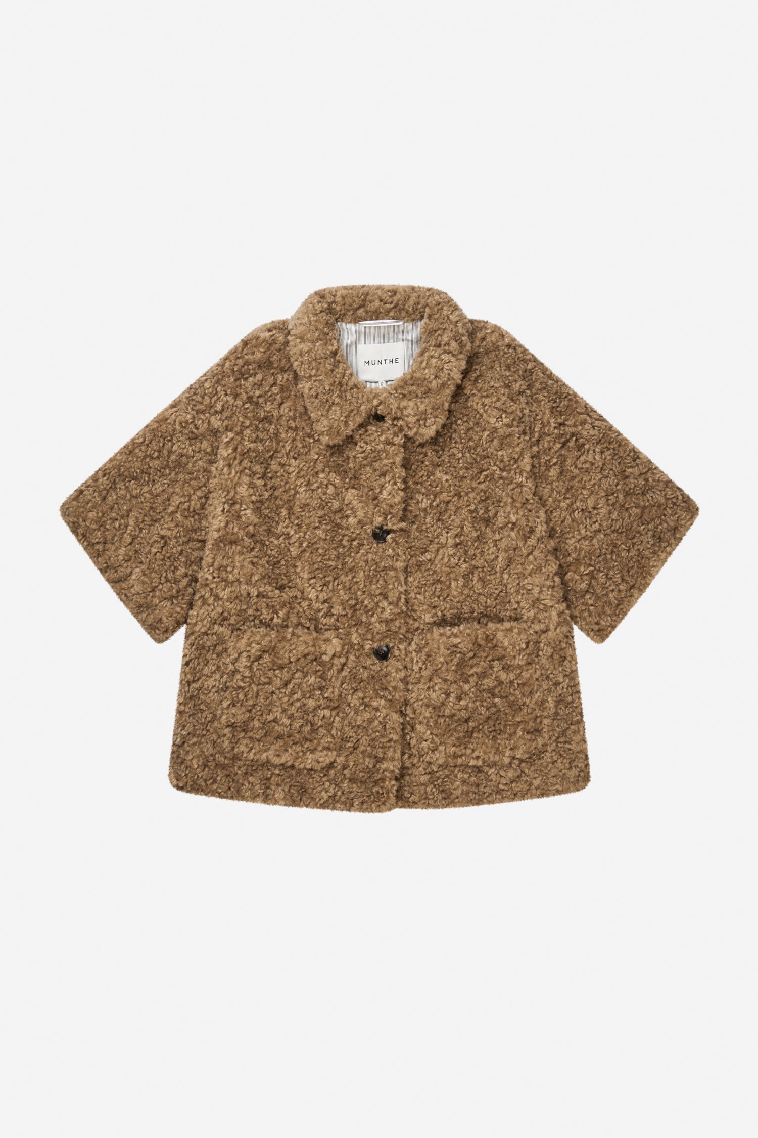 This jacket is crafted in a soft teddy texture and designed with a relaxed, slightly boxy silhouette. It features short, wide sleeves, a classic collar, two front pockets, and a simple button closure. The textured surface bring depth to the design, while the roomy fit makes it an easy layering piece throughout the season.