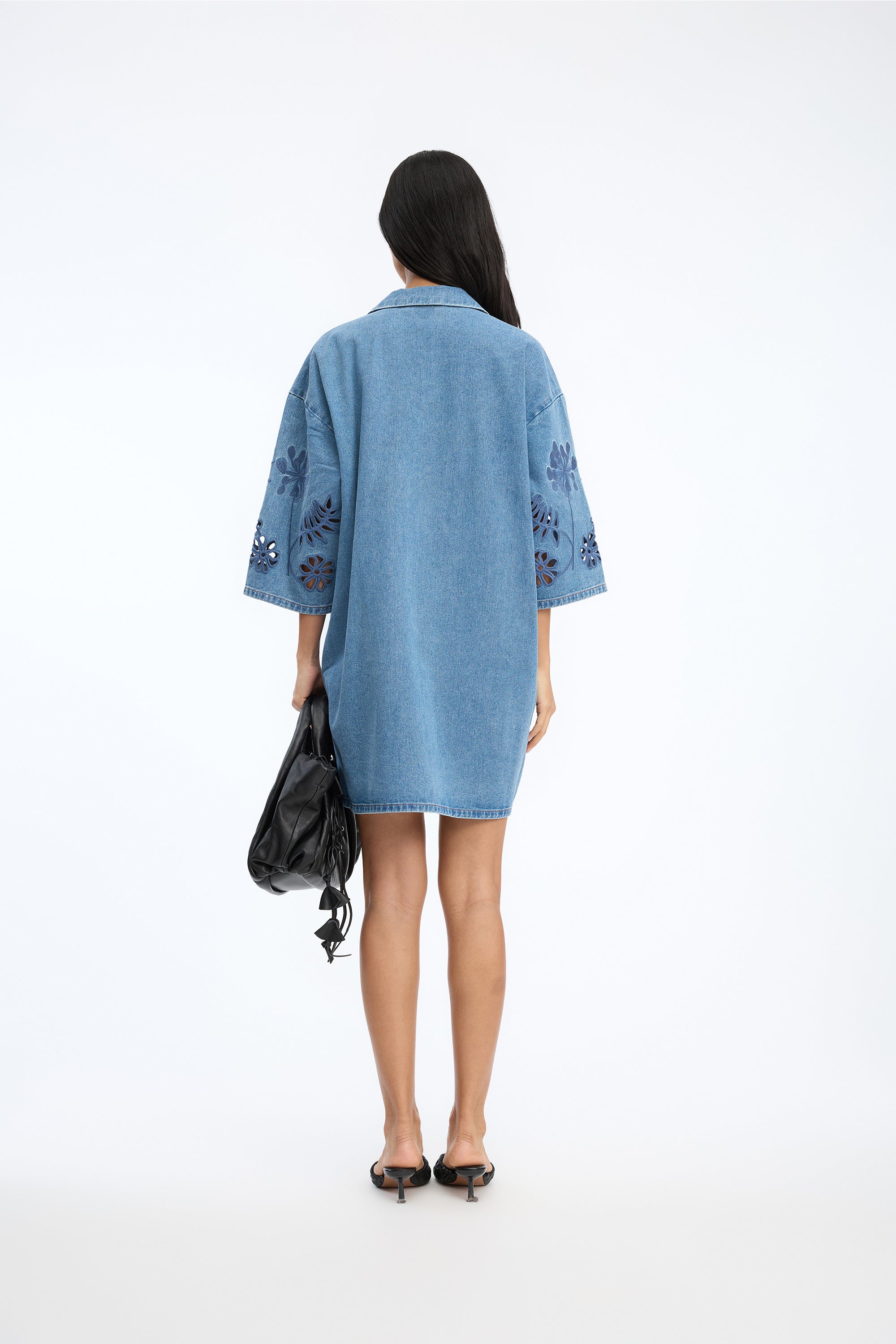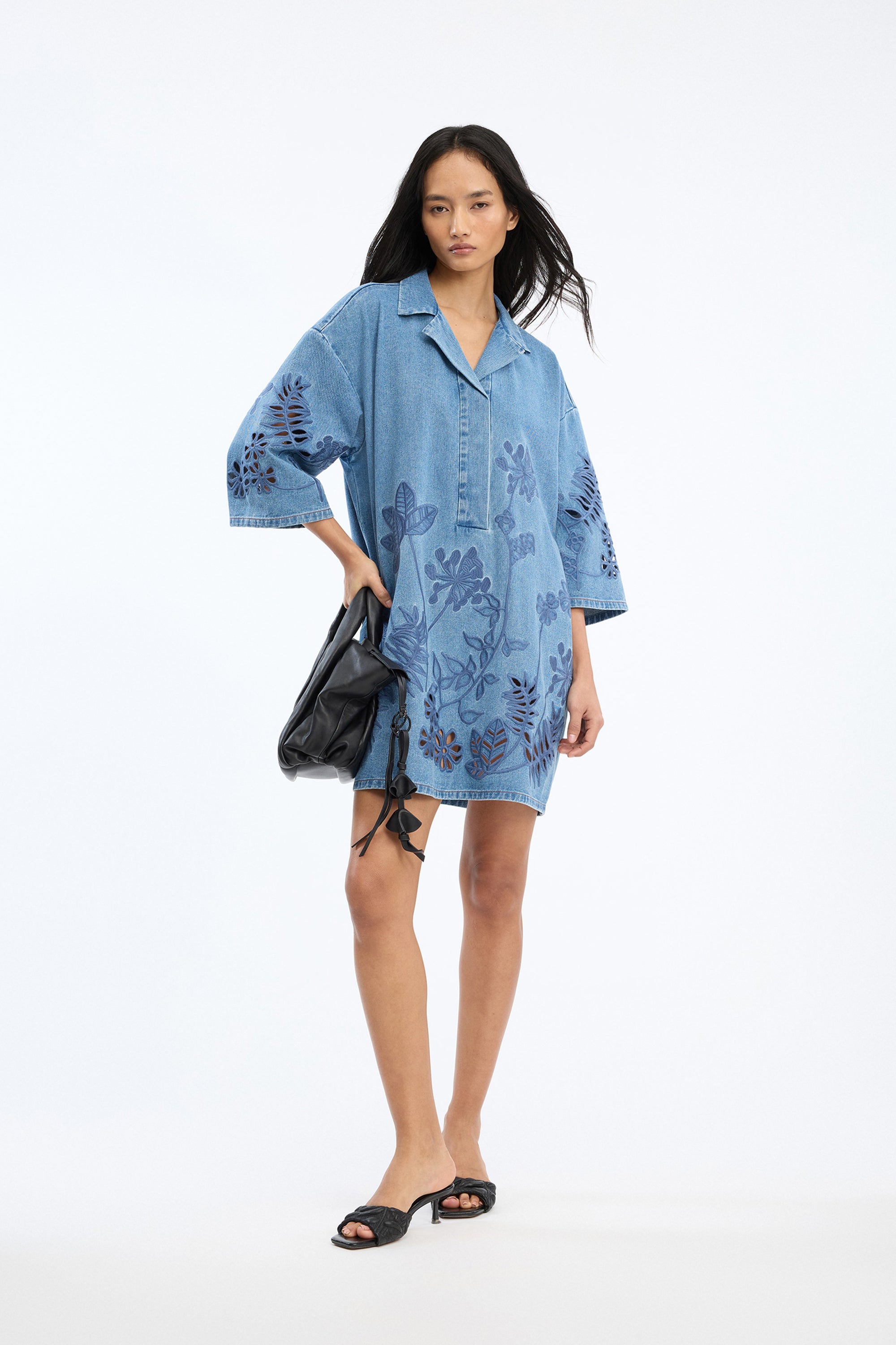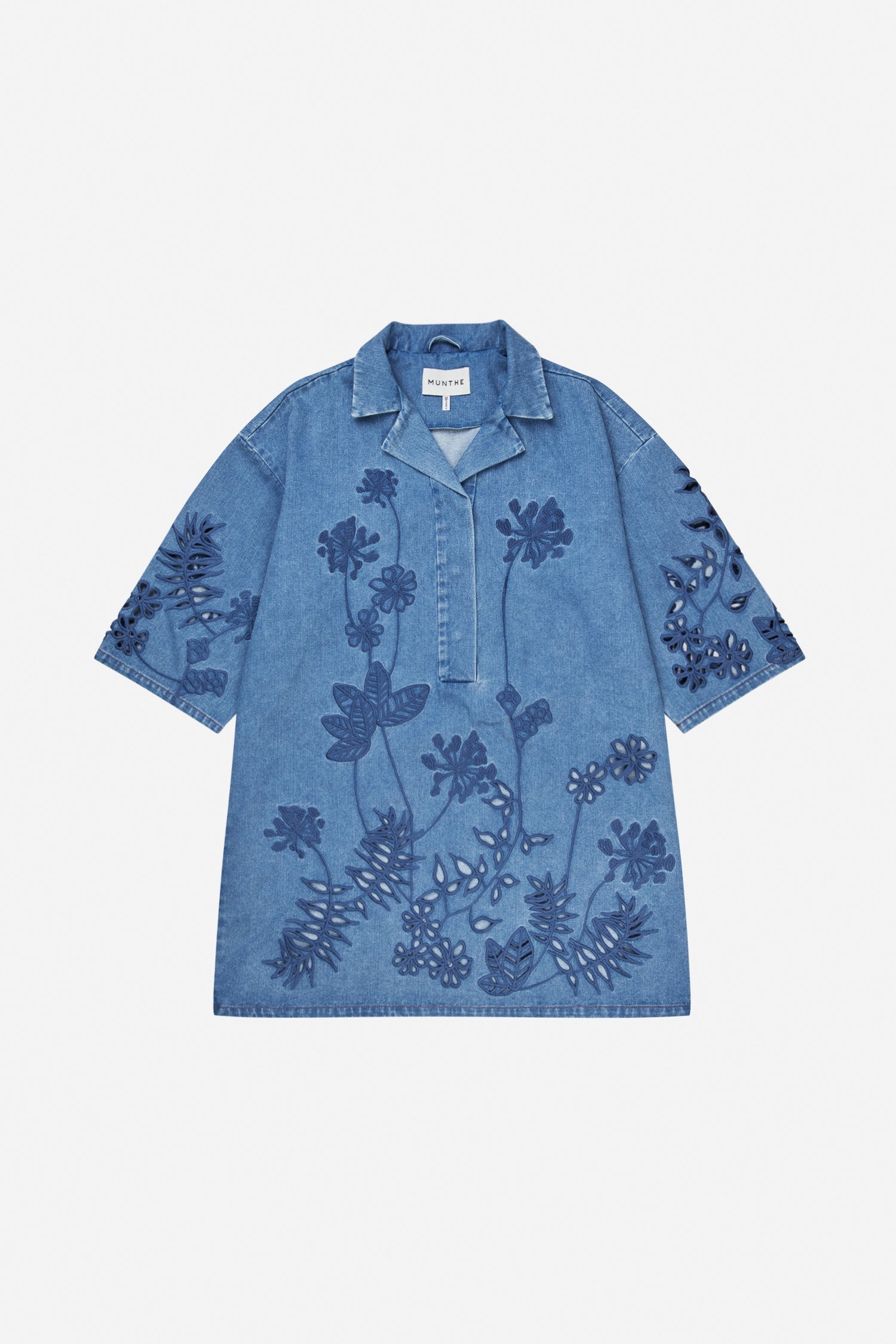 This dress is crafted from denim and features tonal embroidered floral details on the body and sleeves. The silhouette is relaxed and straight, finished with a V-neckline, a small collar, and short, roomy sleeves.