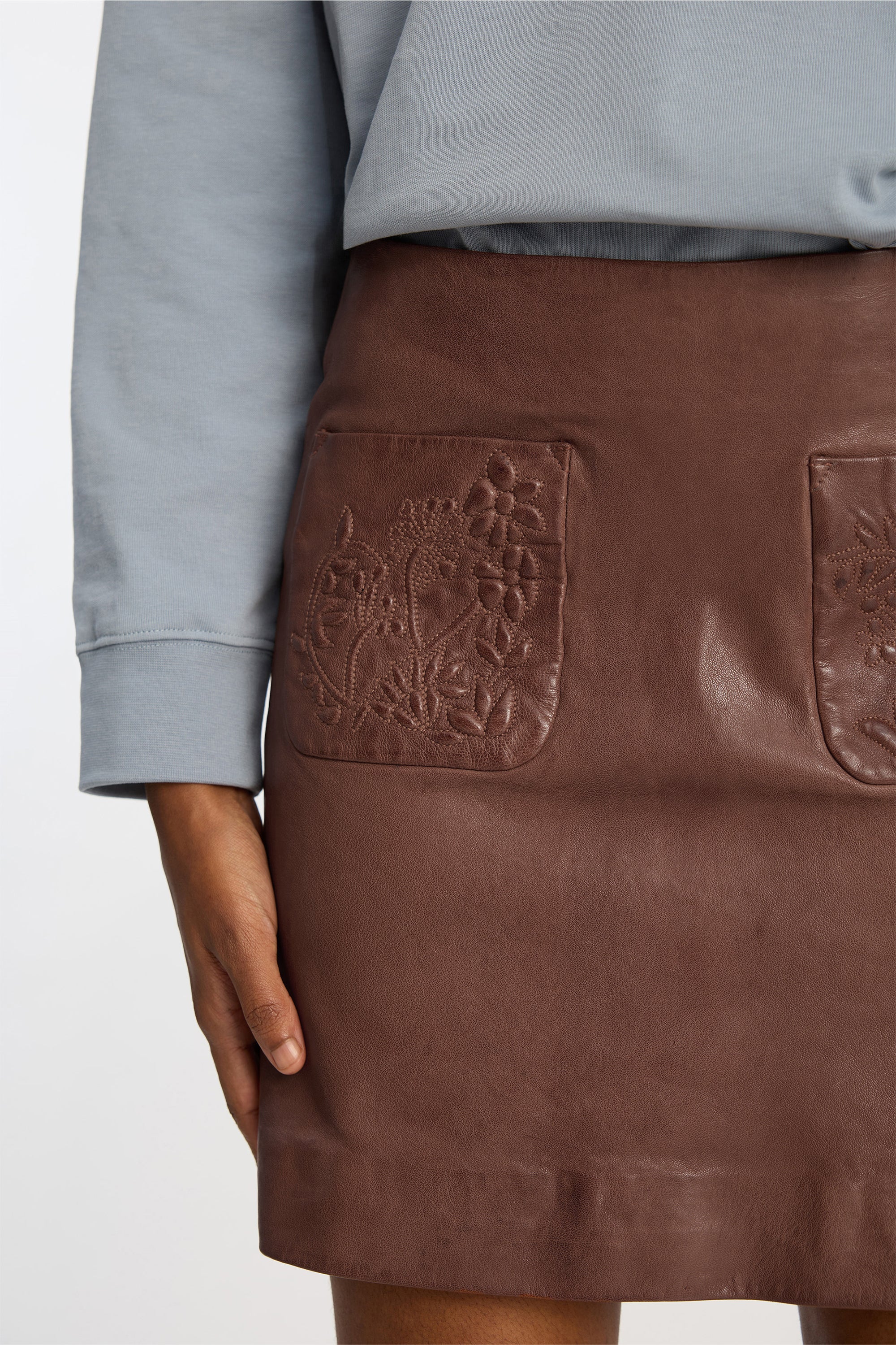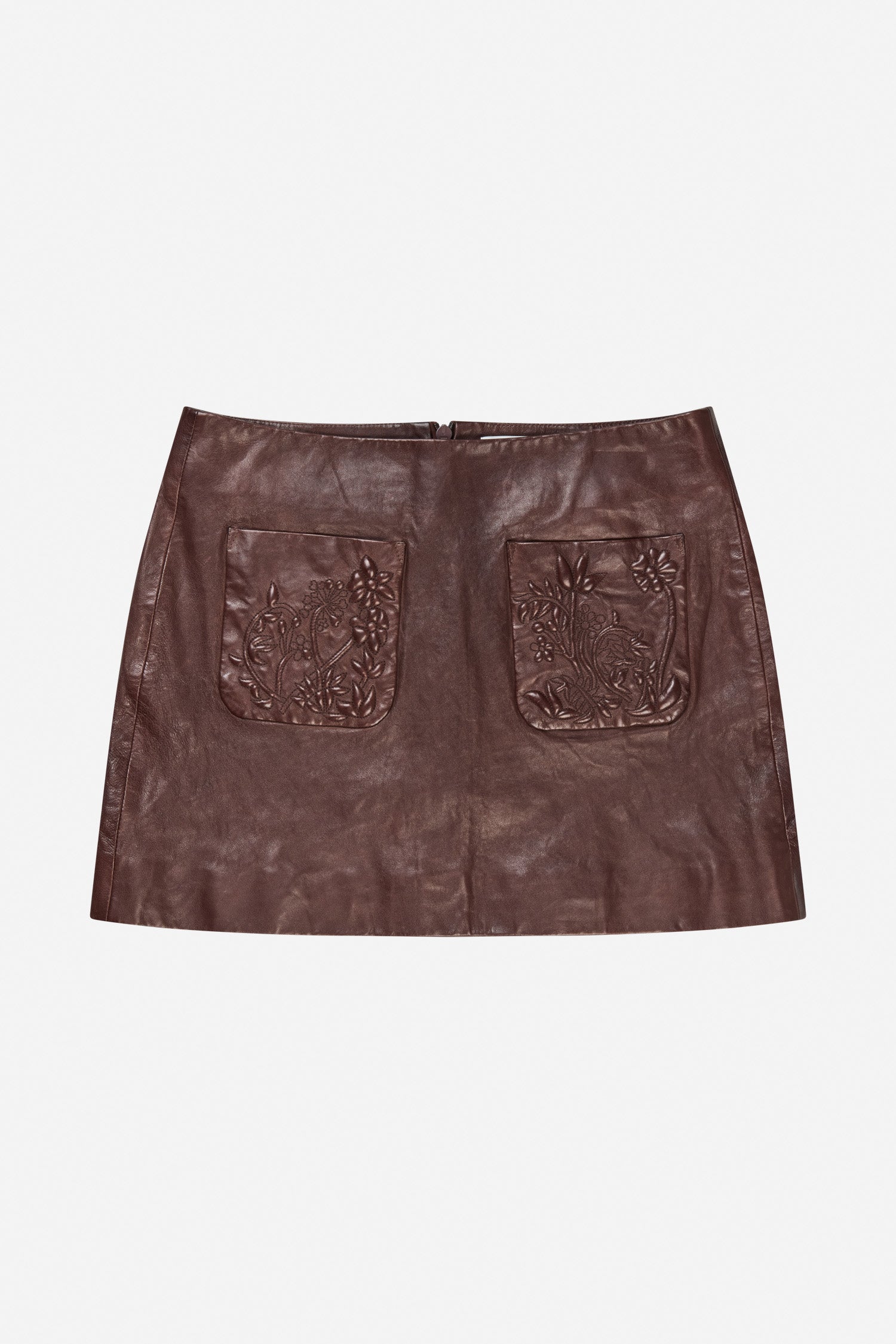 This skirt is crafted from 100% lamb leather and features two front pockets with embossed floral detailing. It comes in a short, regular fit and closes with a back zipper.