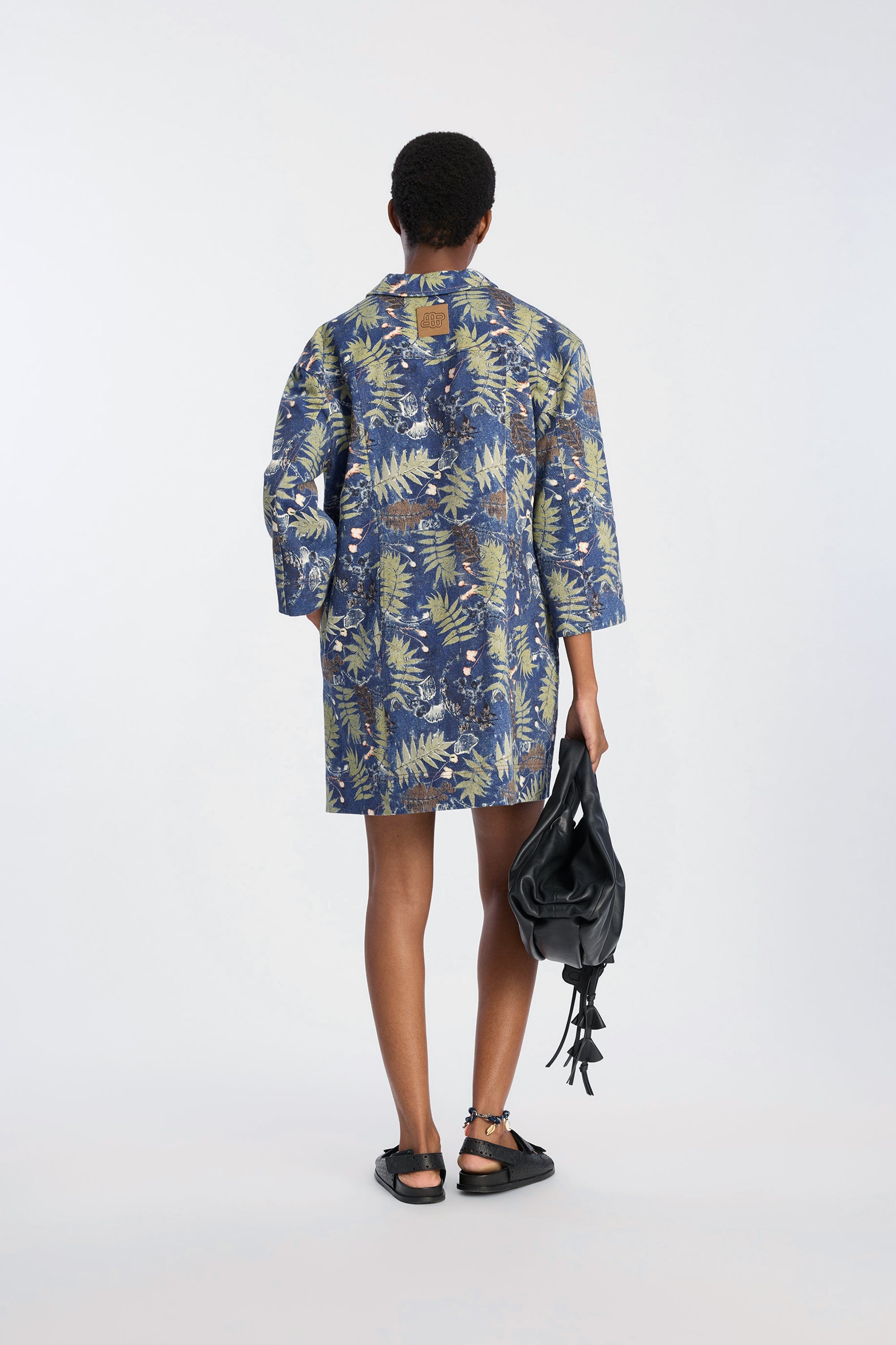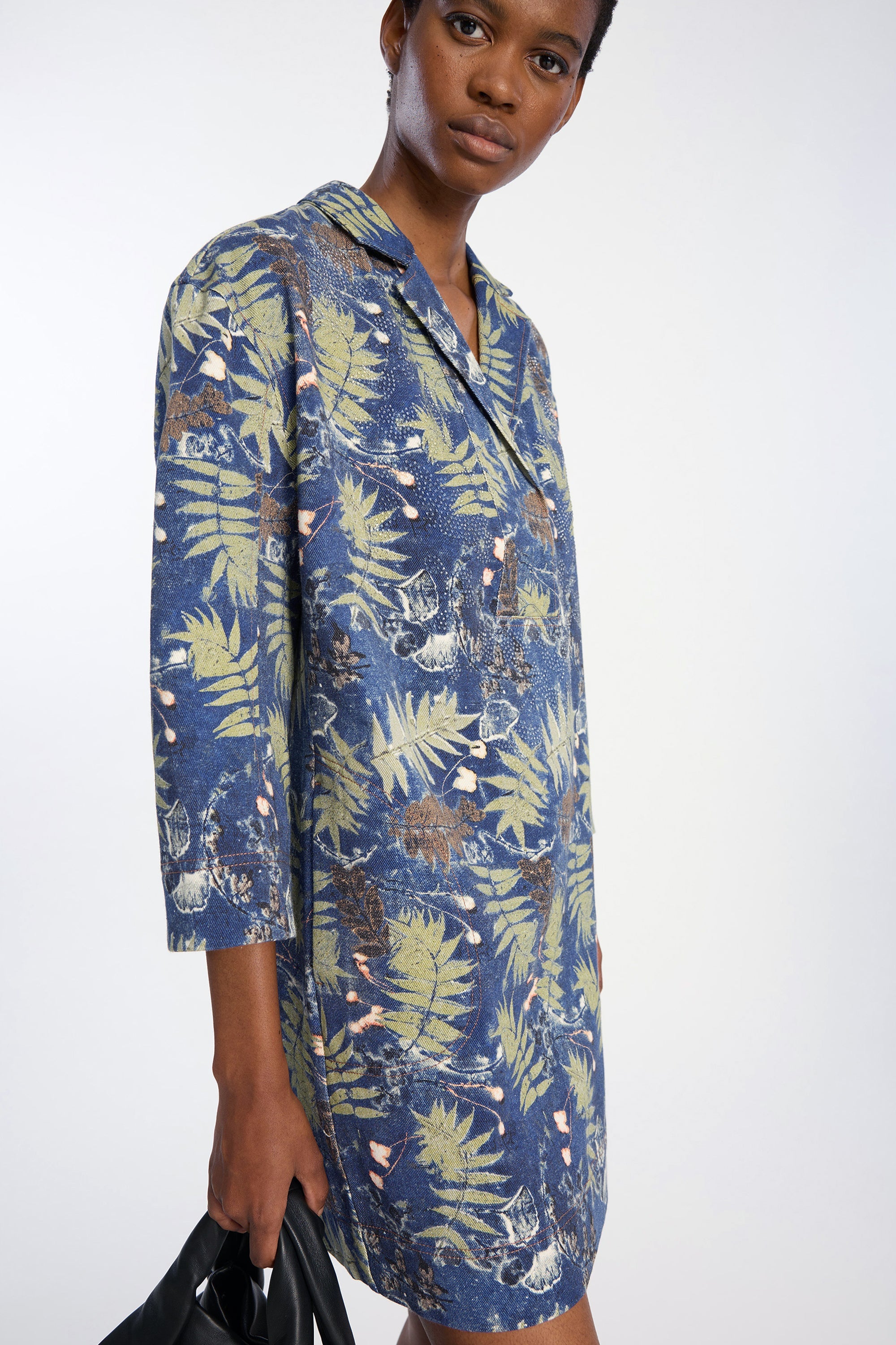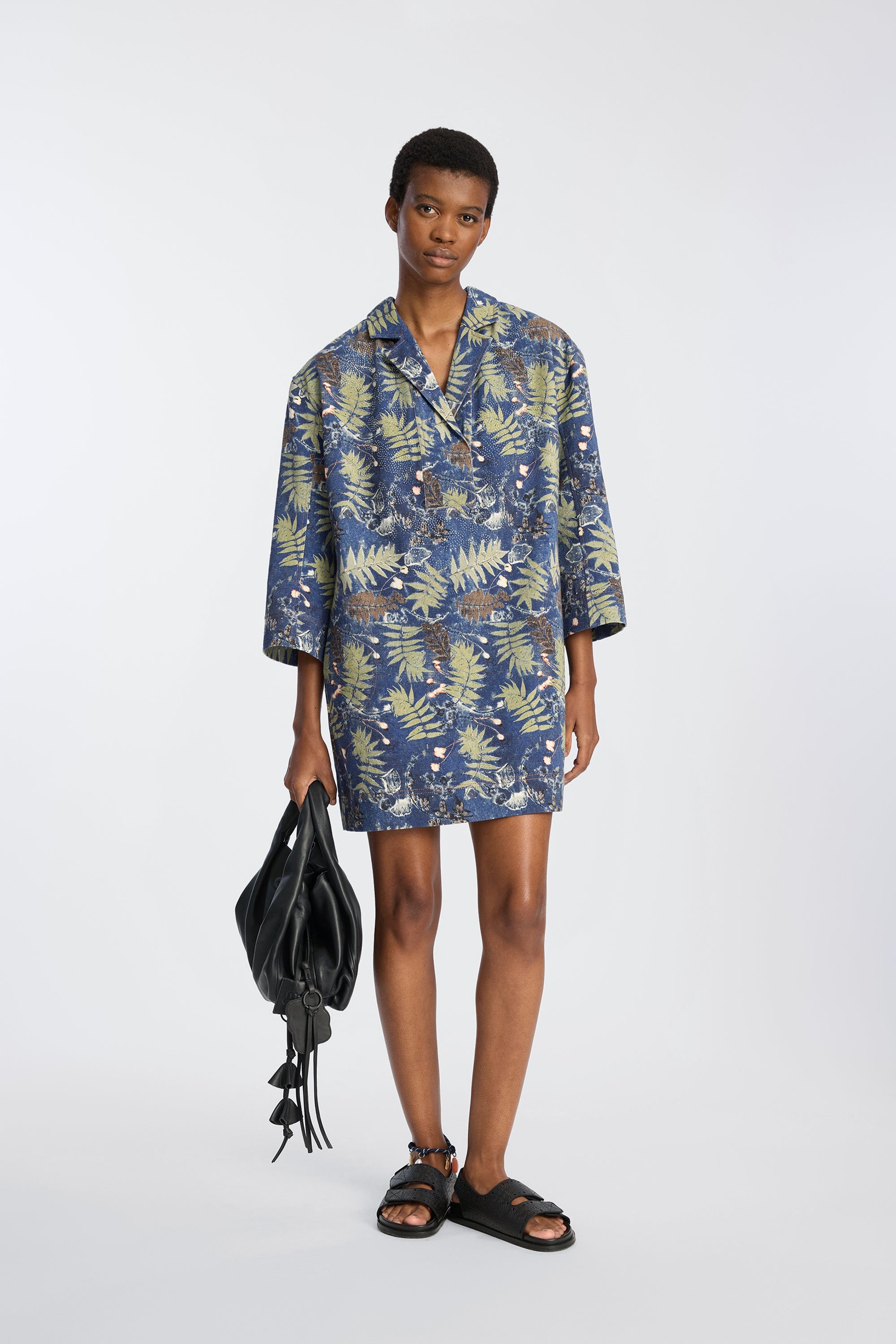 Dress crafted from a lightweight woven fabric featuring a botanical print in deep blue and green tones. It has a straight silhouette, a V-neckline with a small collar, and three-quarter sleeves for a relaxed, well-balanced look.