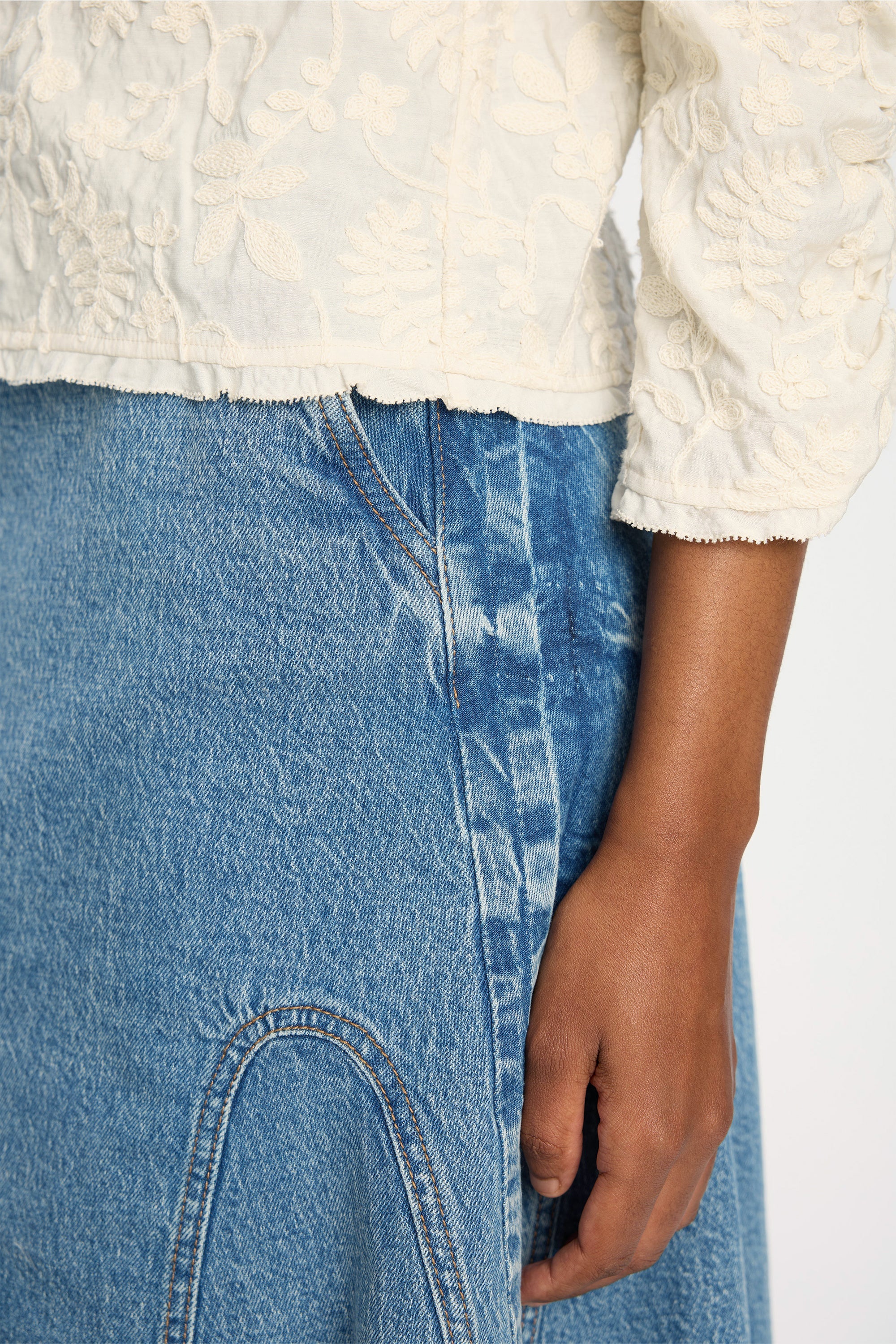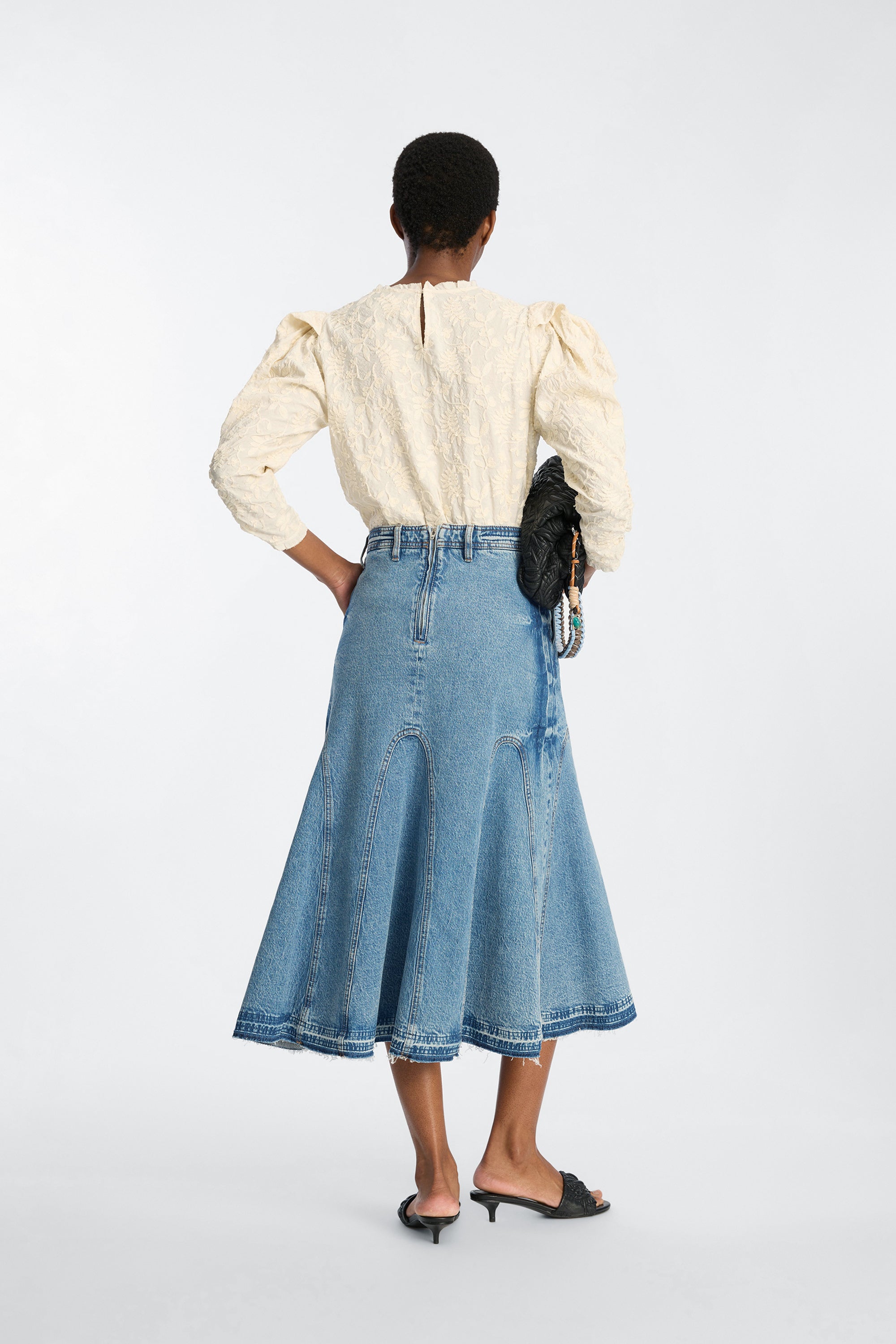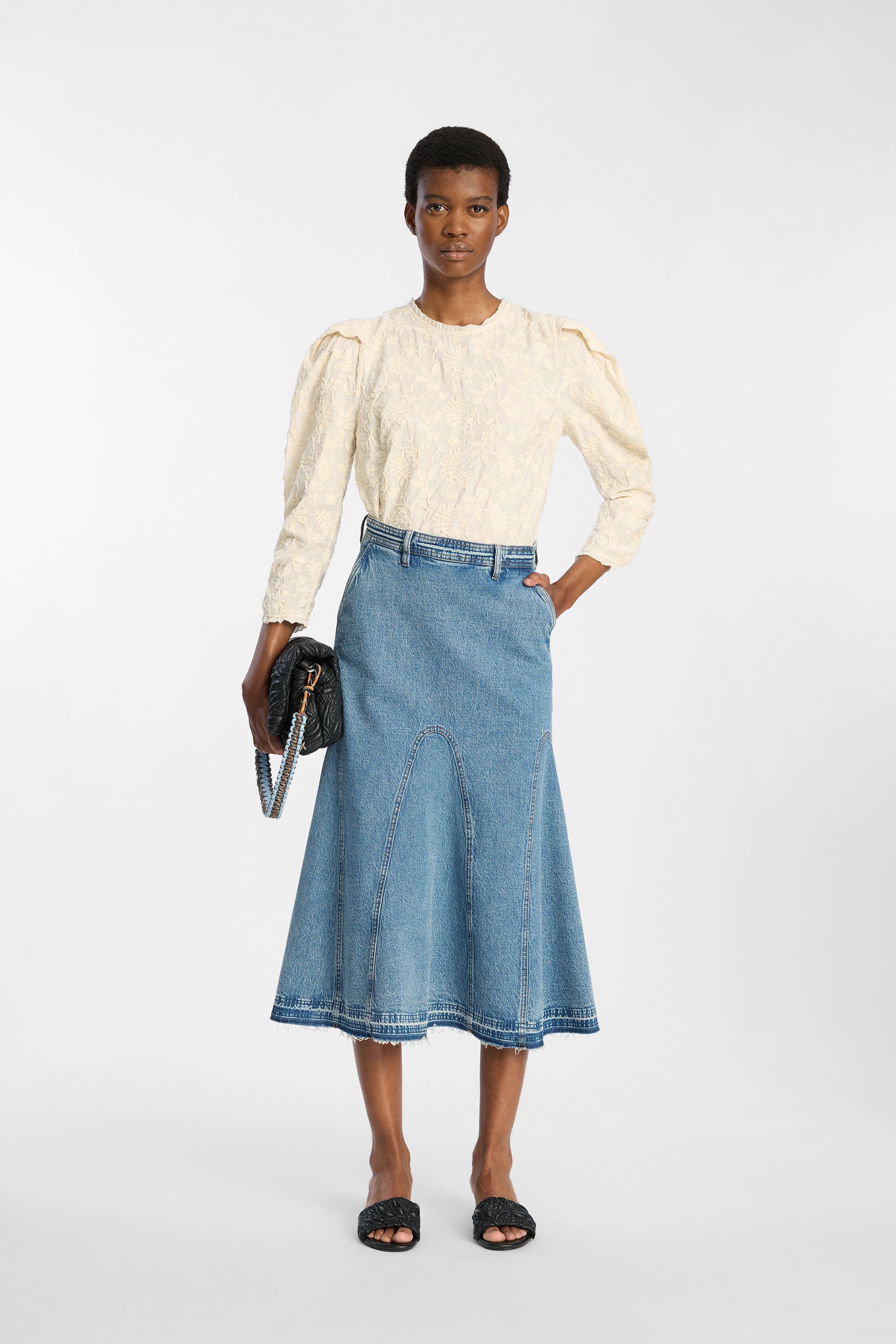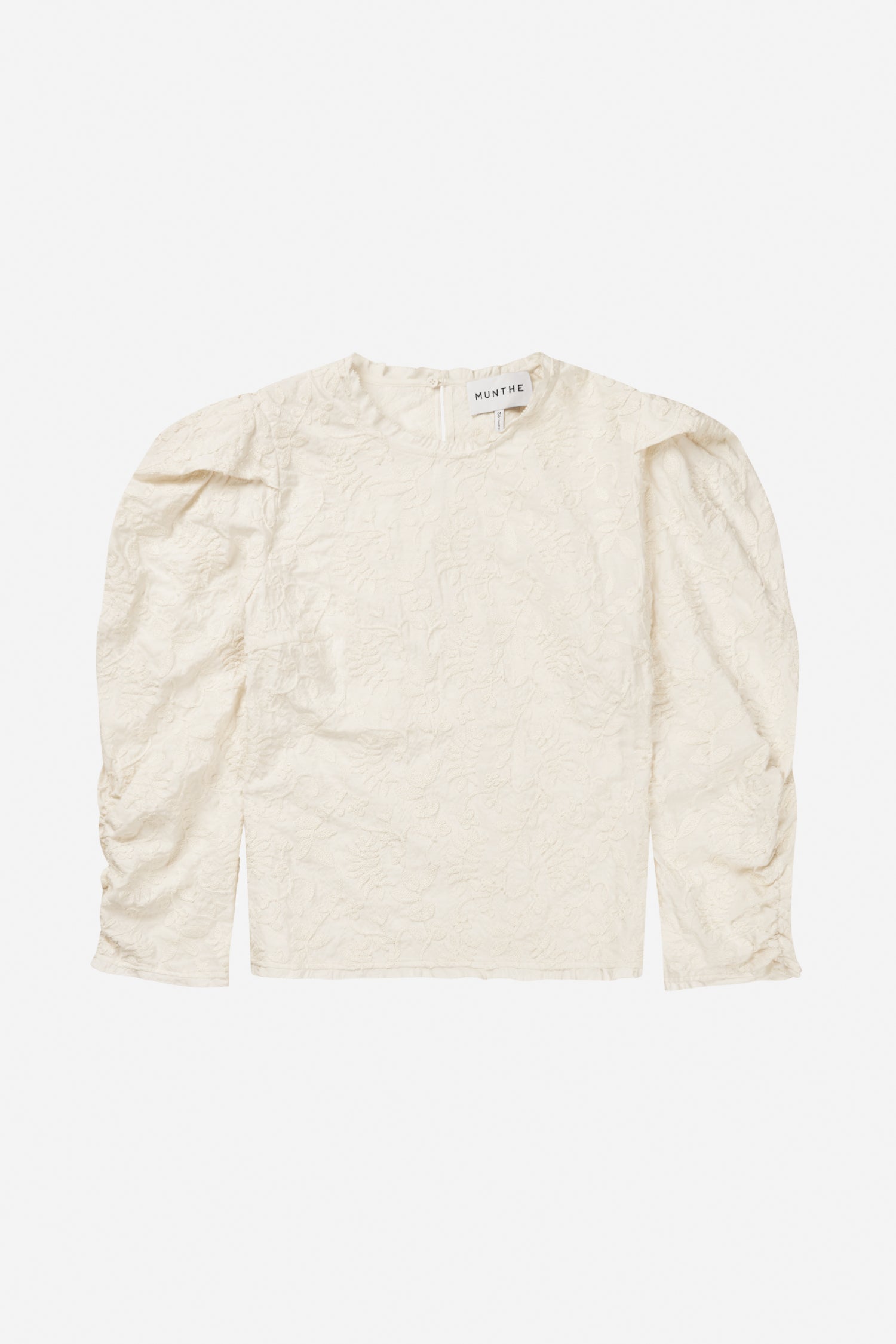 The top is crafted from a textured jacquard fabric with a subtle pattern. It features long sleeves with gentle gathered details and a clean, round neckline.