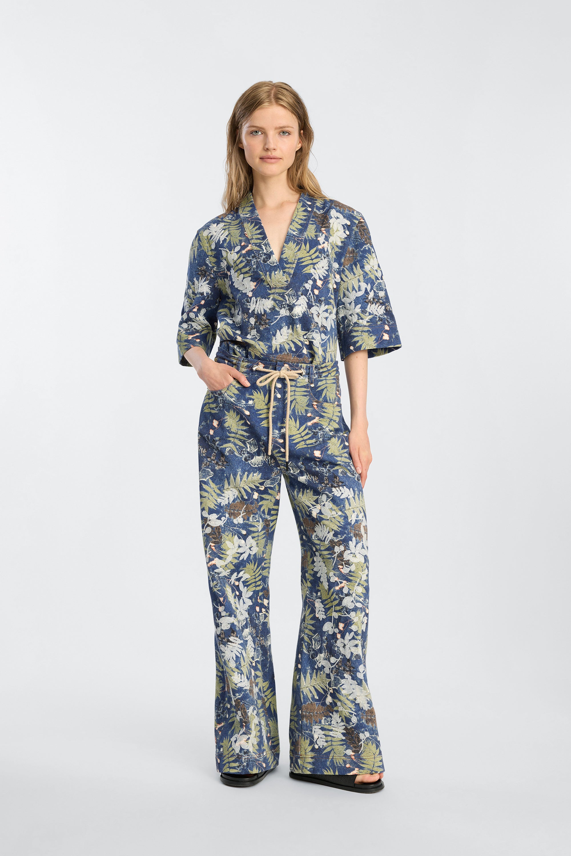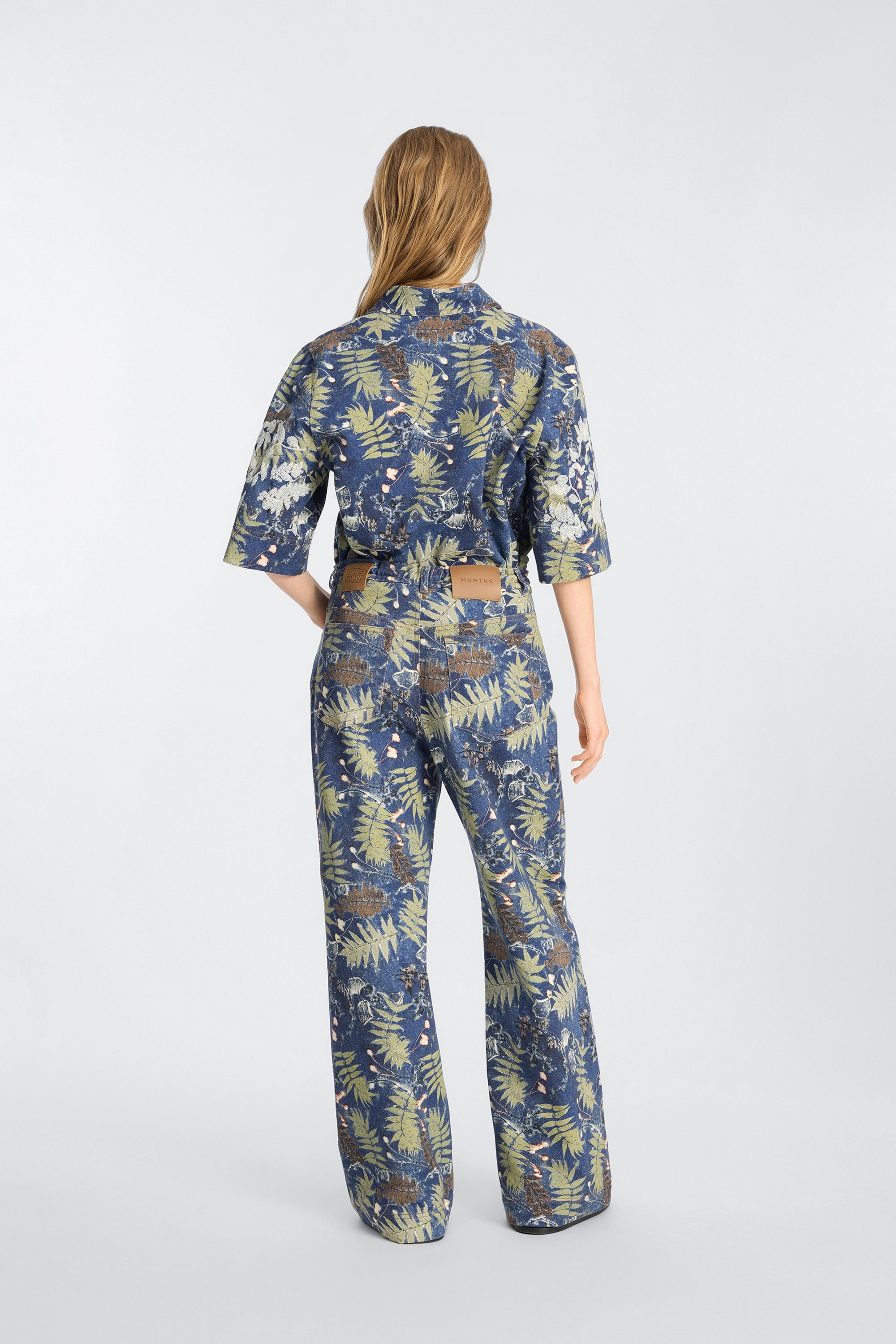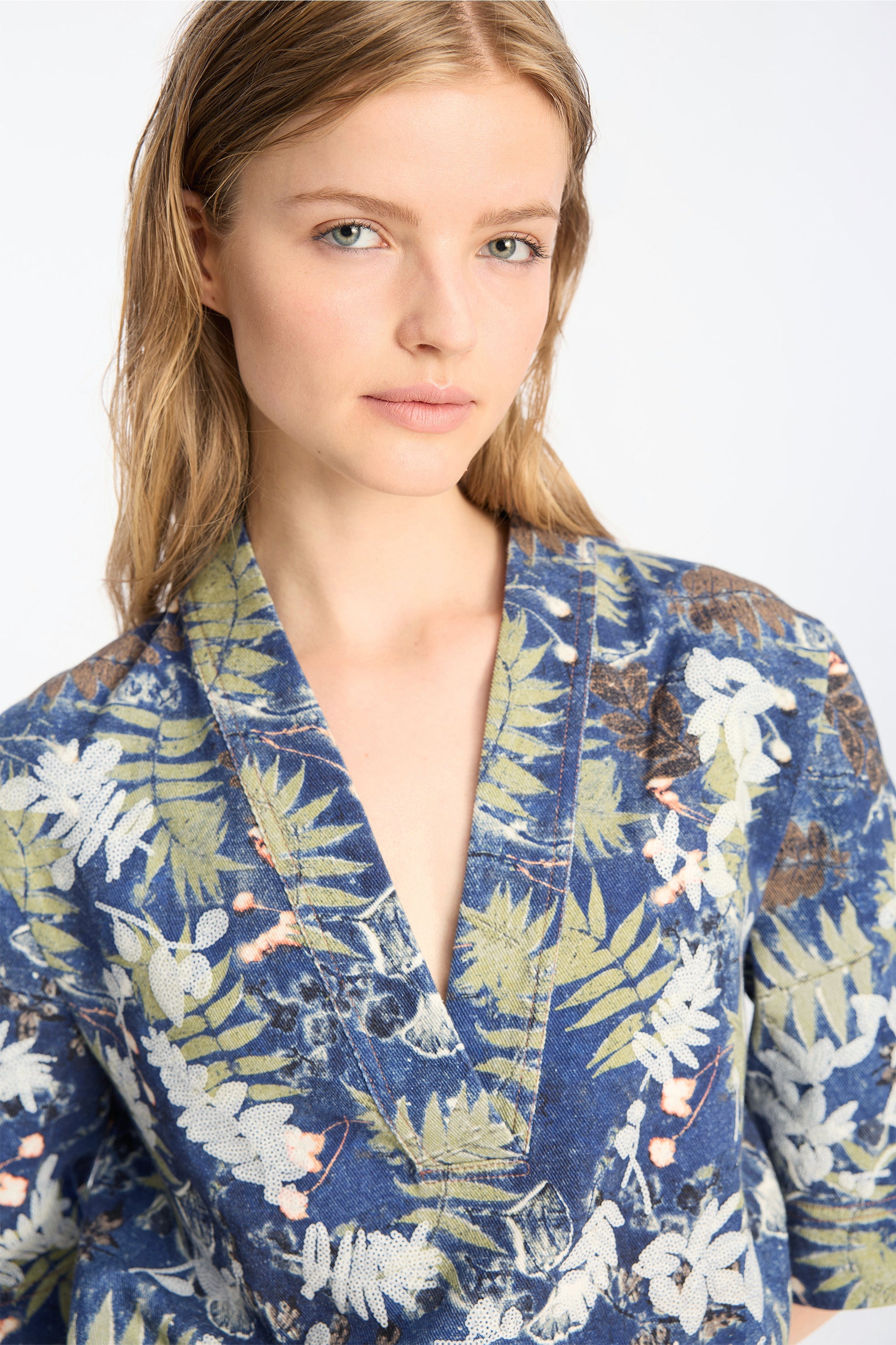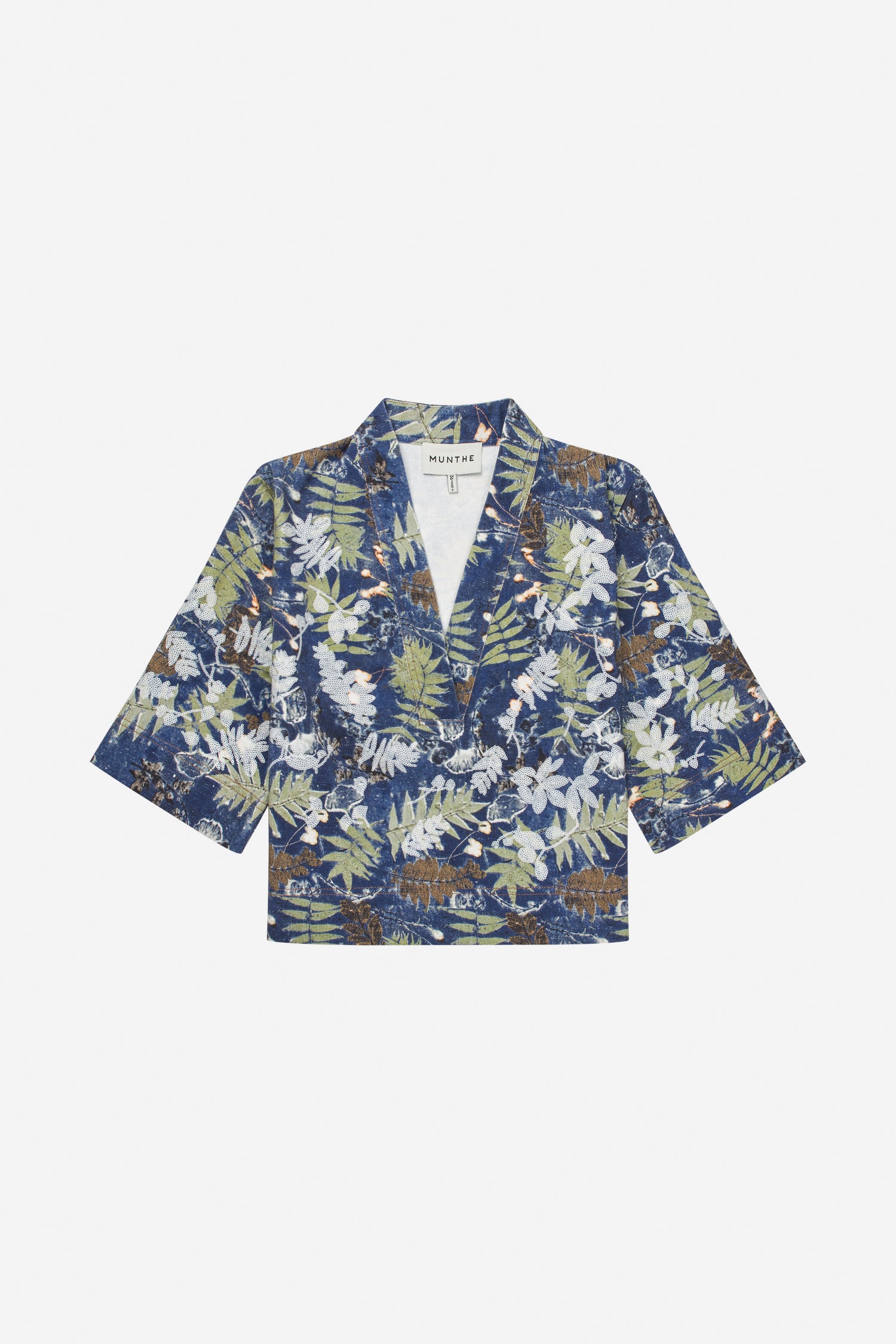 Top in a botanical print in deep blue and earthy green tones, The top has a regular fit, short sleeves, an open front and brings an artistic look to any outfit.
