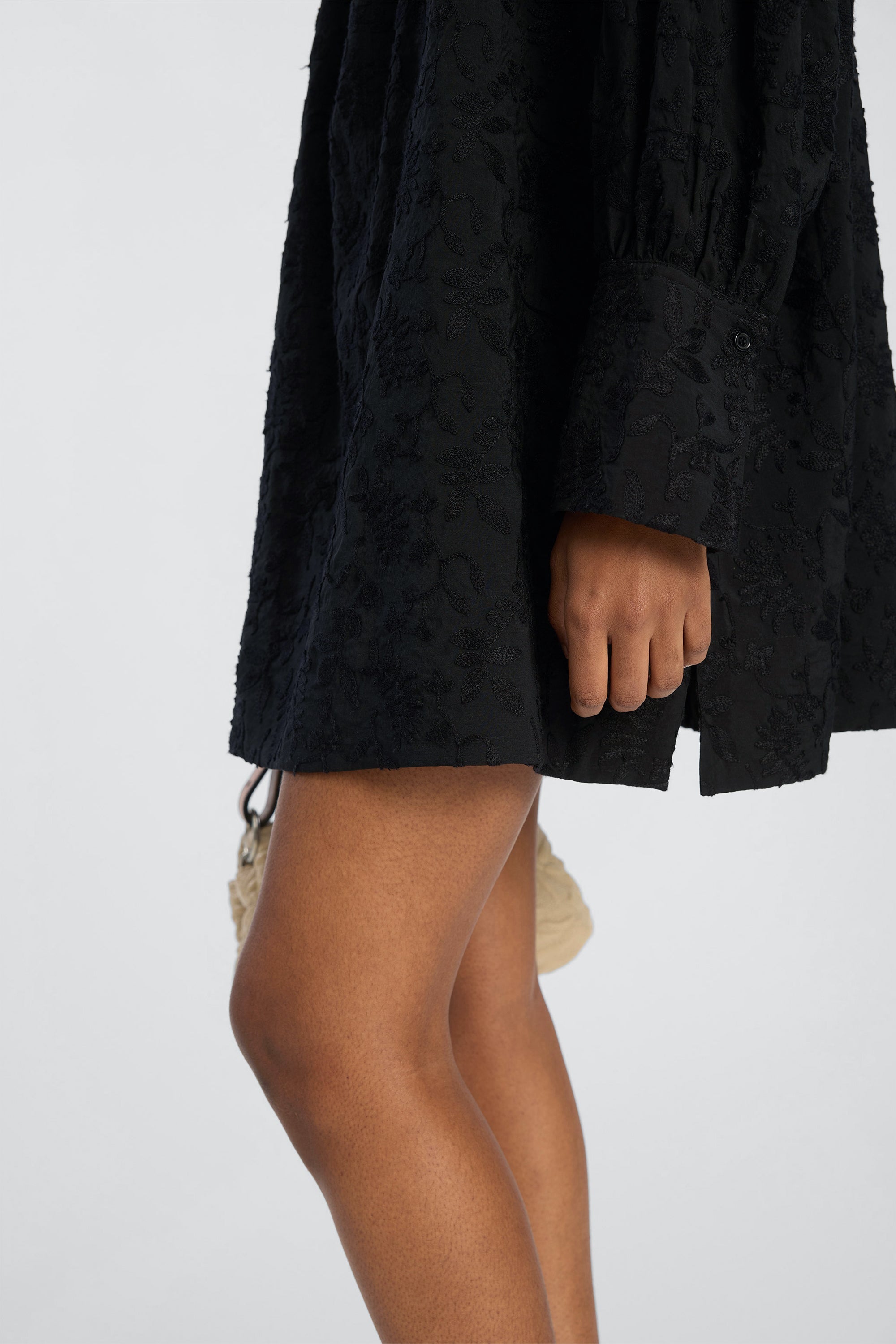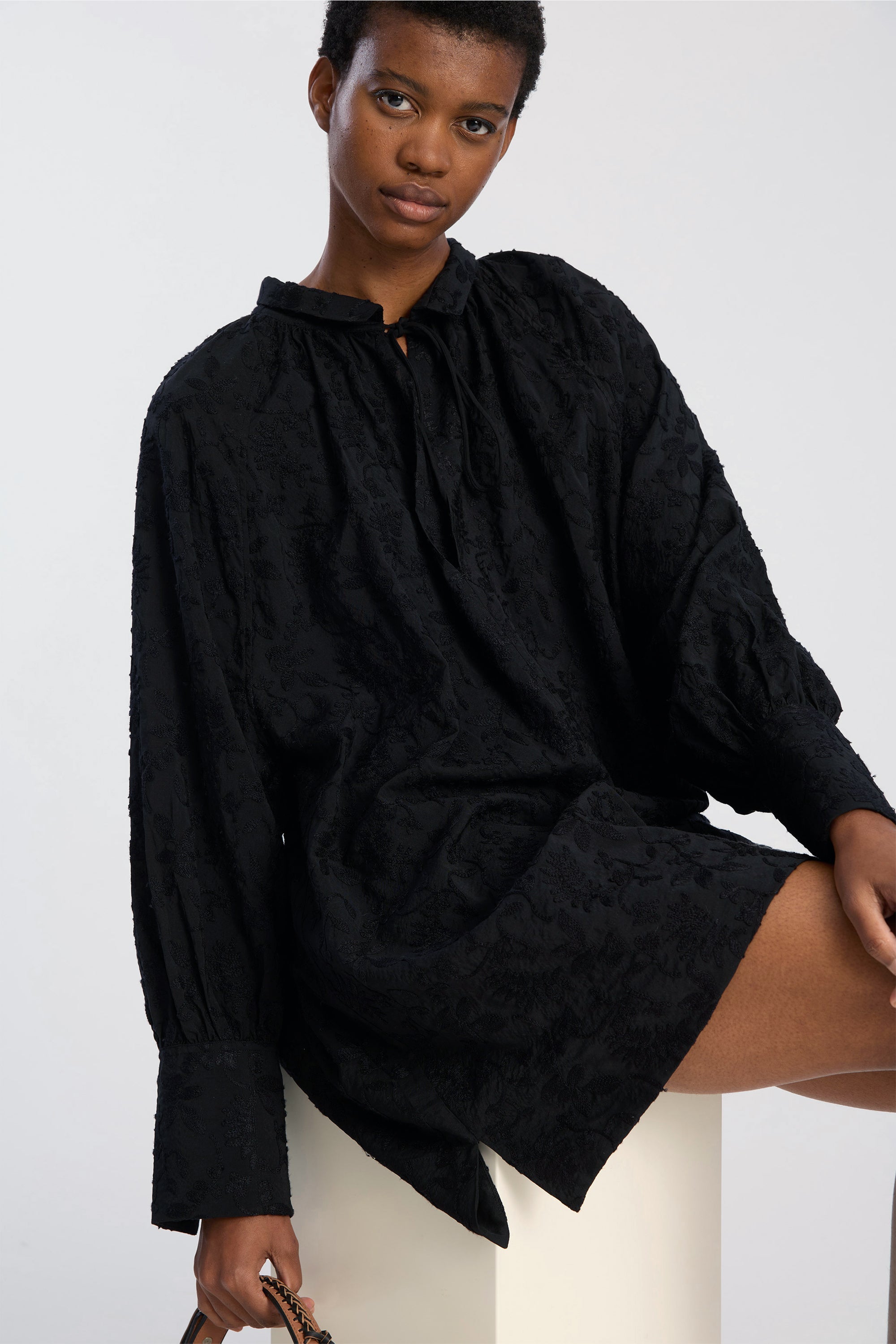 Dress in a subtle jacquard textured fabric with long, softly voluminous sleeves with defined cuffs, a rounded collar, and a tie detail at the neckline. A straight silhouette with a versatile look.