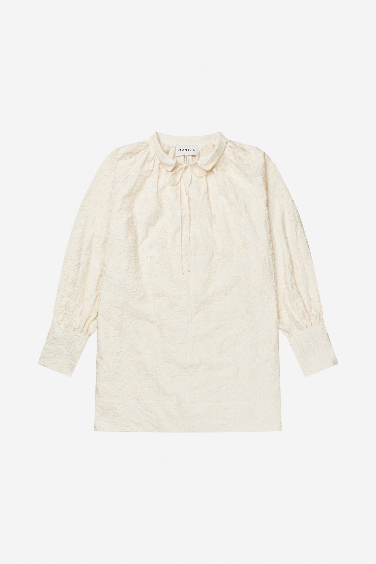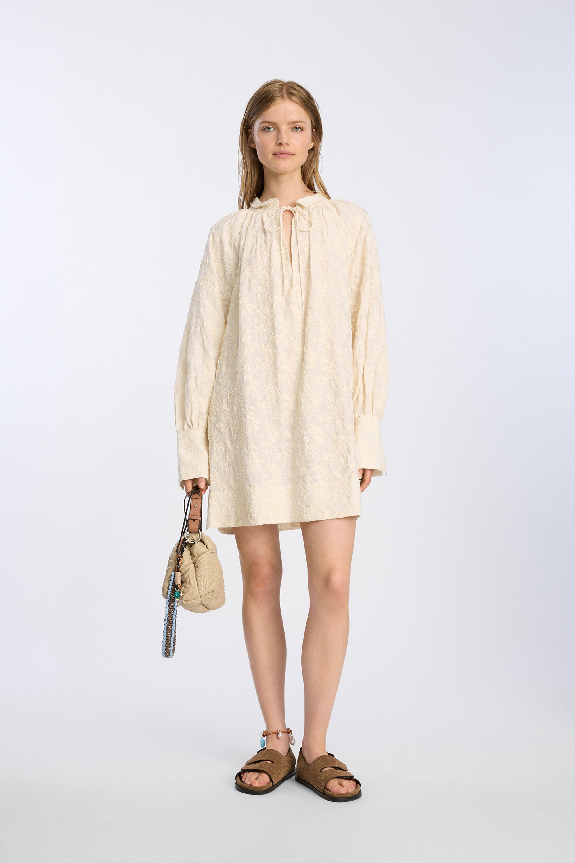 Dress in a subtle jacquard textured fabric with long, softly voluminous sleeves with defined cuffs, a rounded collar, and a tie detail at the neckline. A straight silhouette with a versatile look.