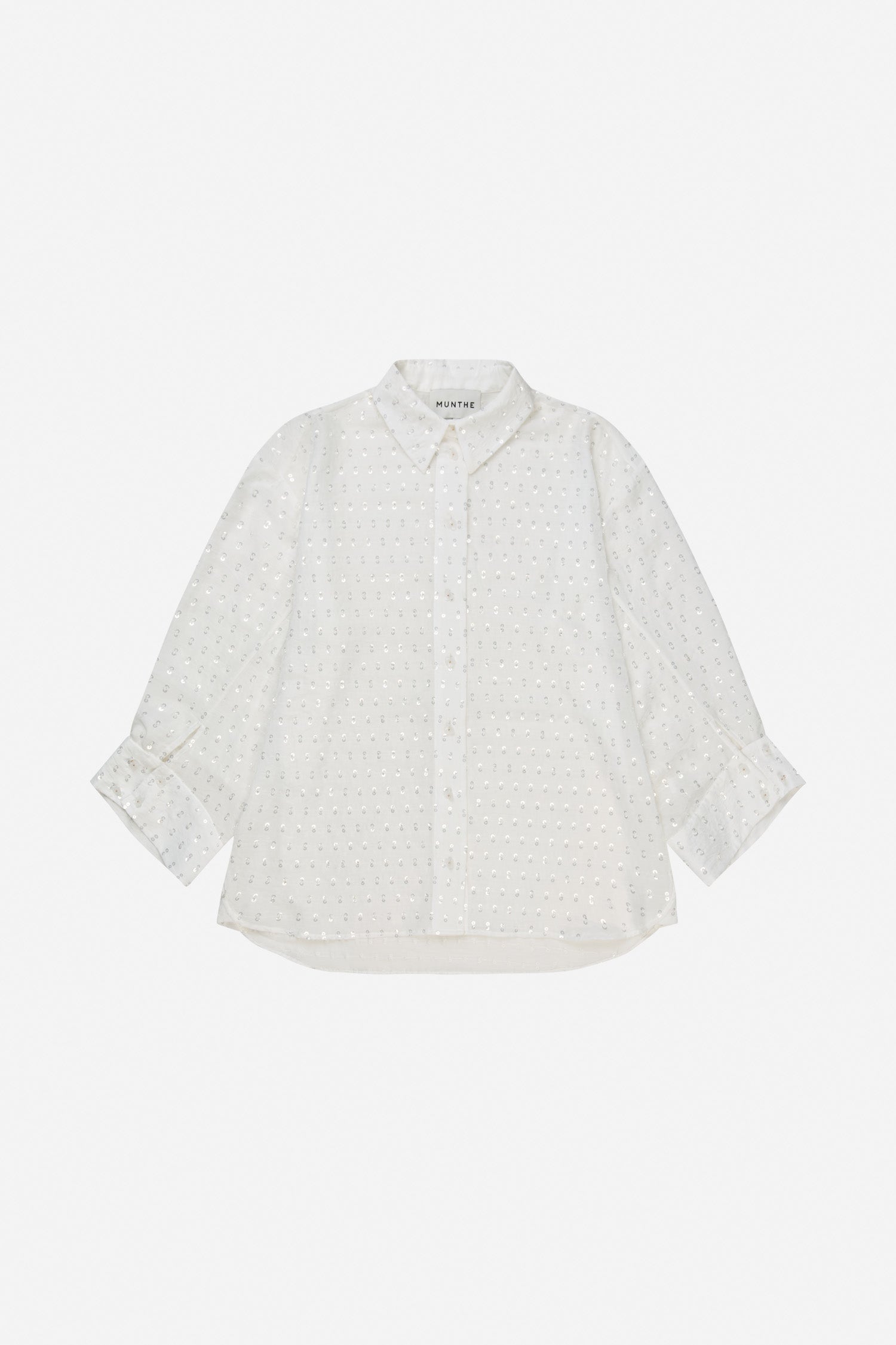 Shirt featuring an oversize fit and discrete sequin details. It is designed with a classic collar, front button closure, and long sleeves with wide cuffs.
