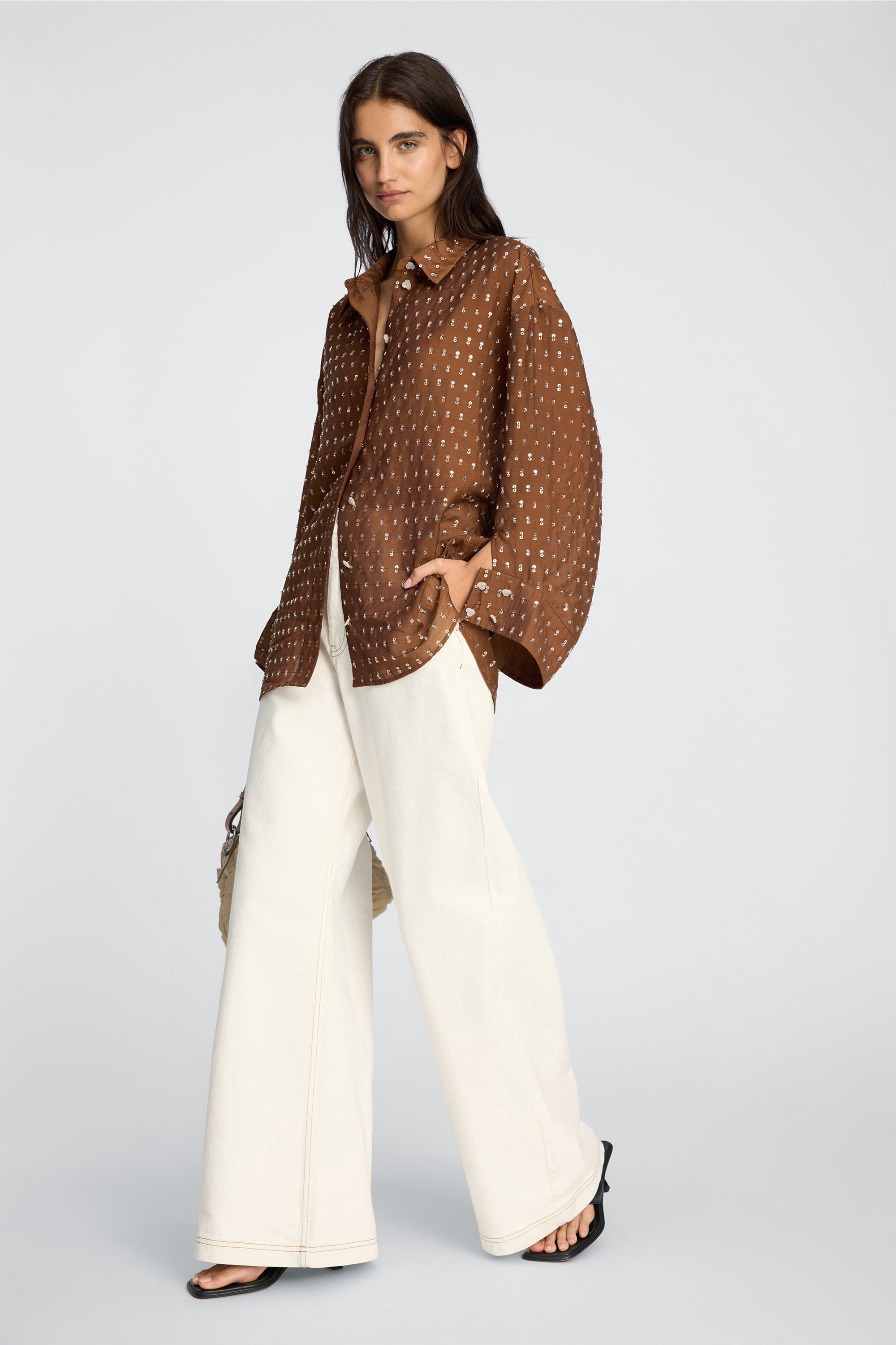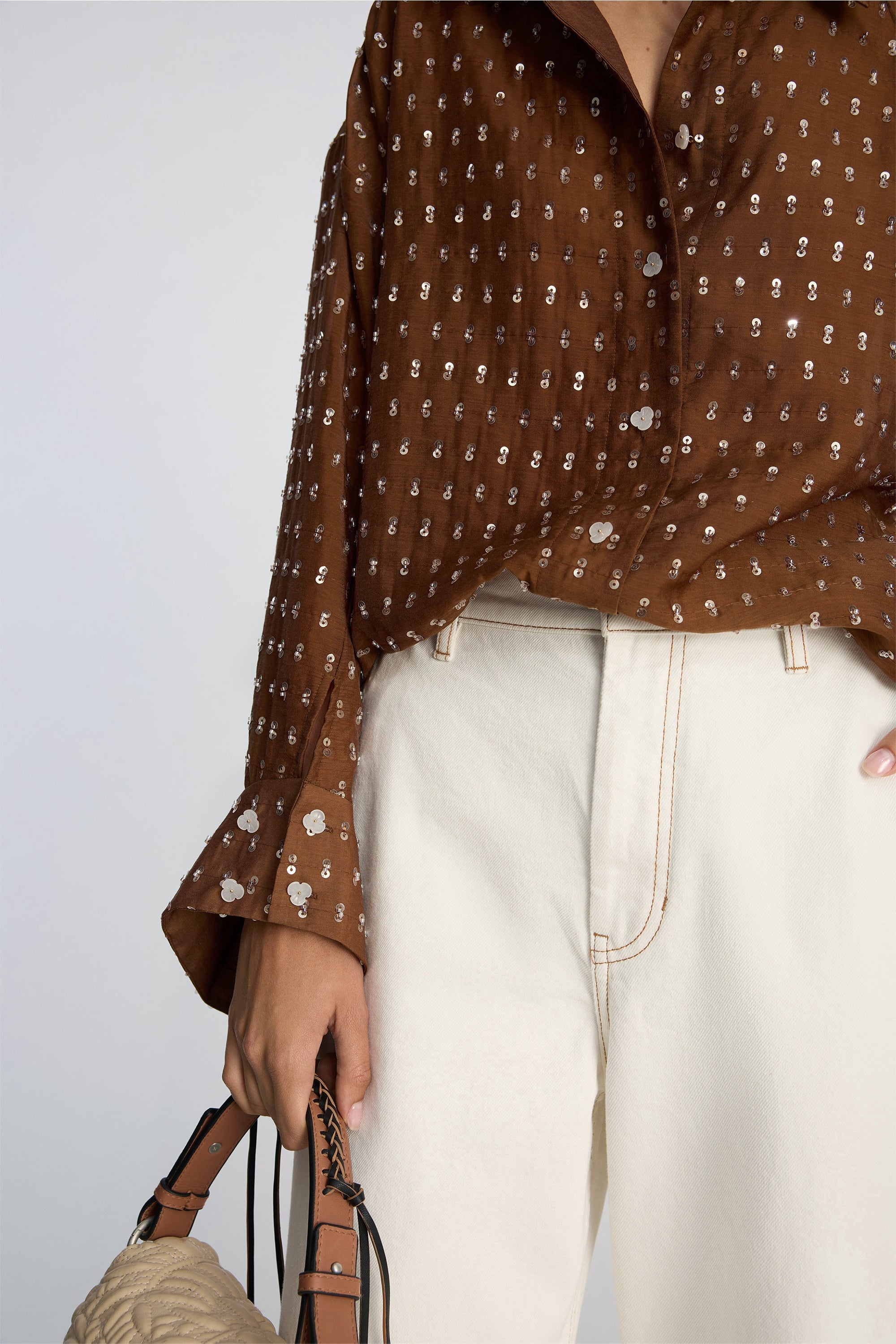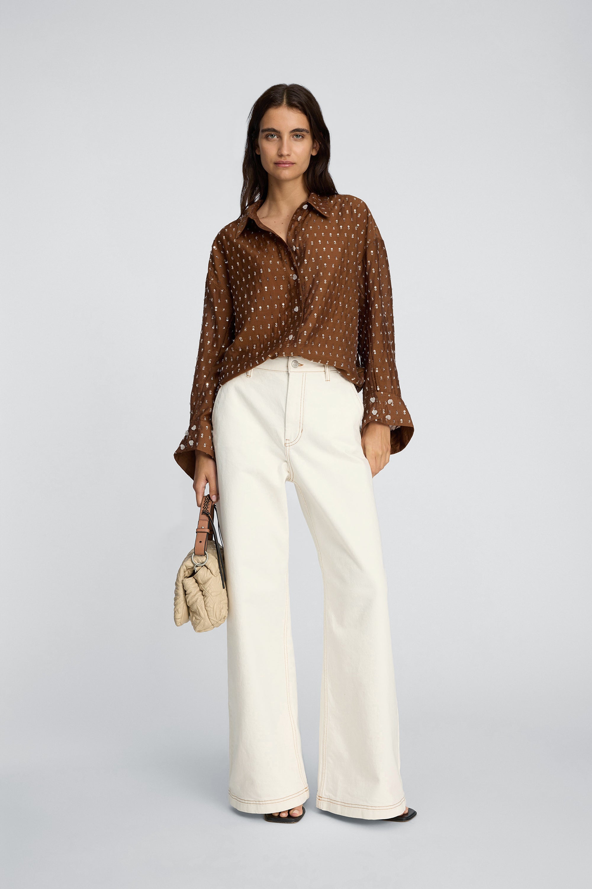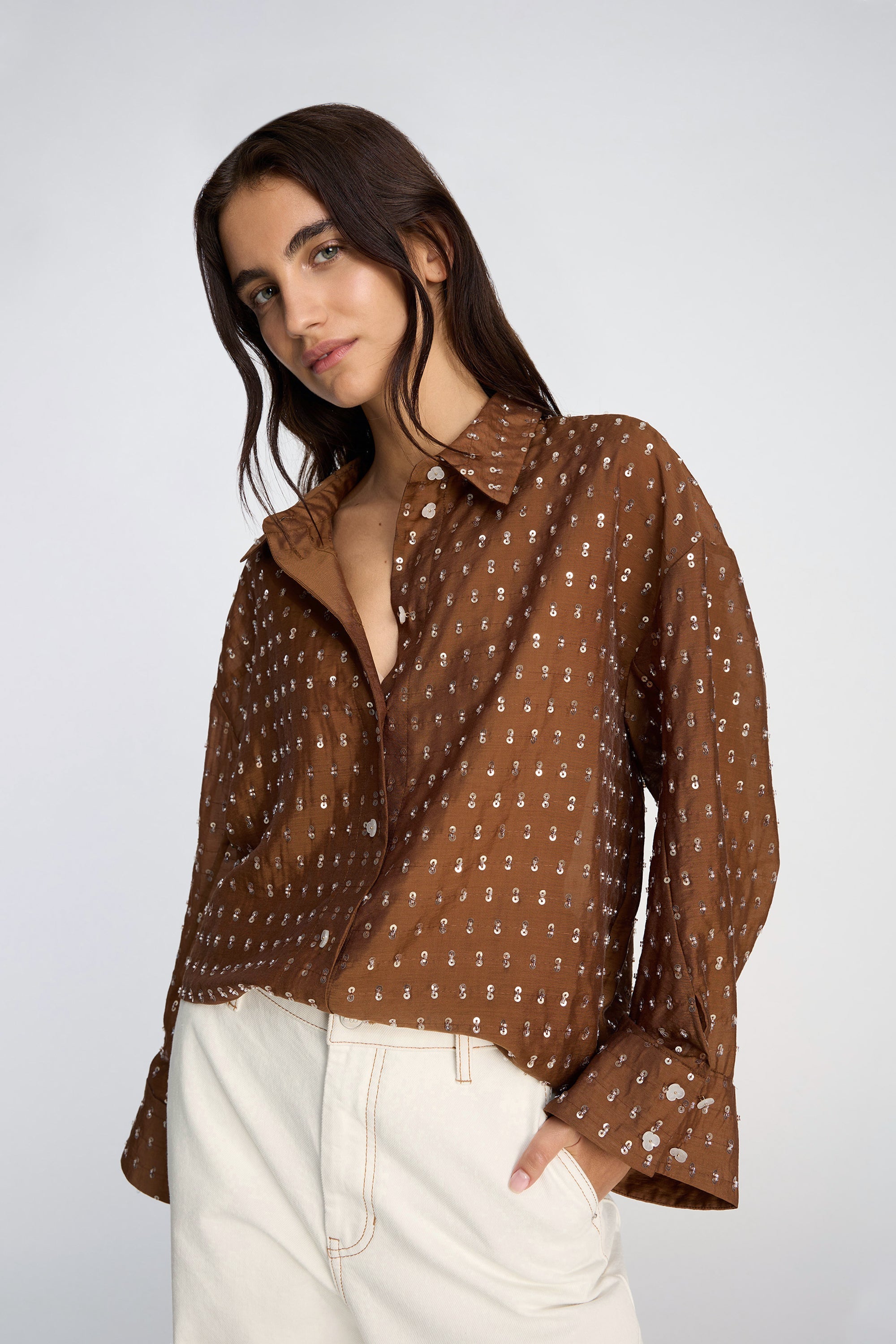 Shirt featuring an oversize fit and discrete sequin details. It is designed with a classic collar, front button closure, and long sleeves with wide cuffs.