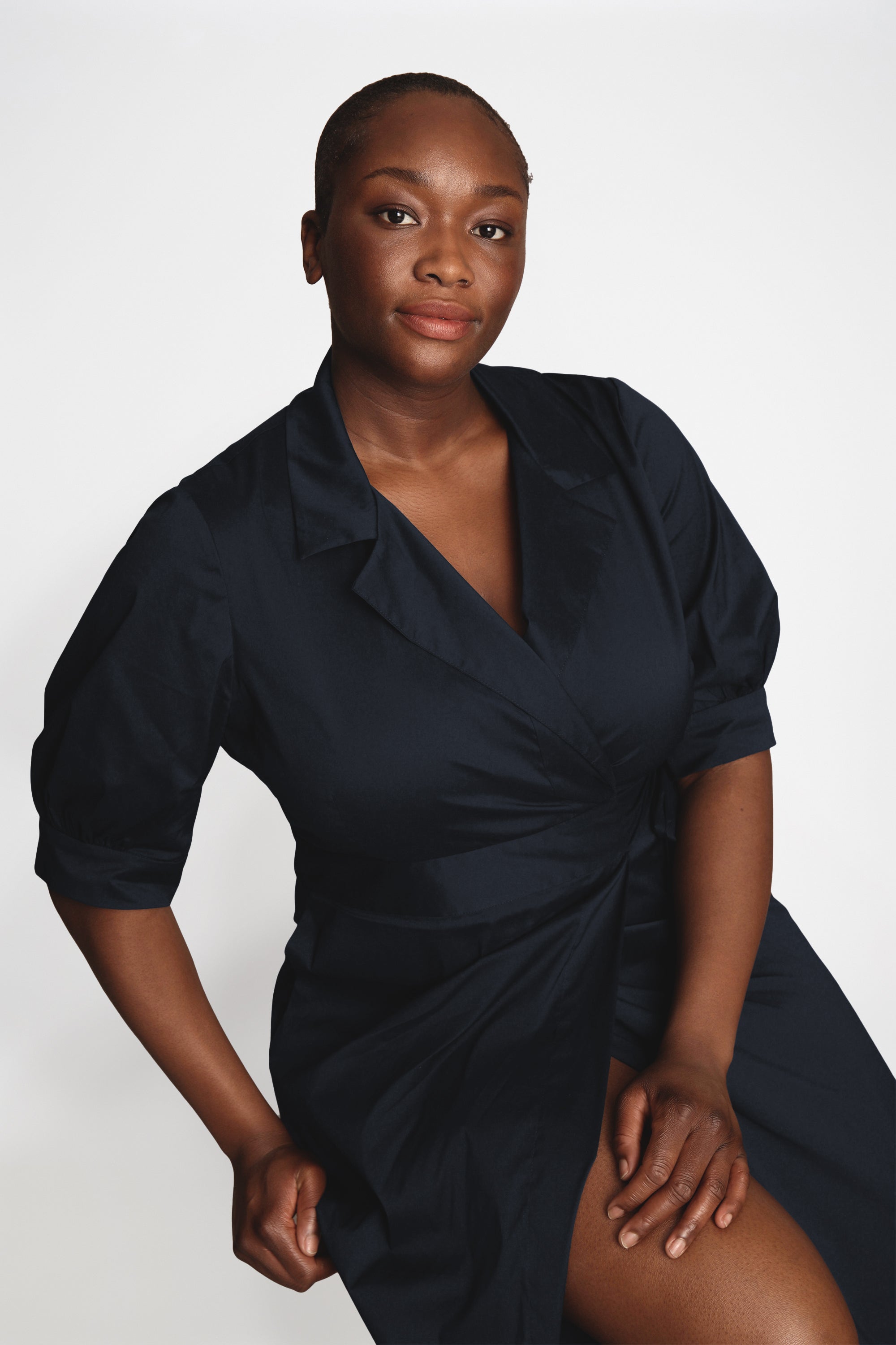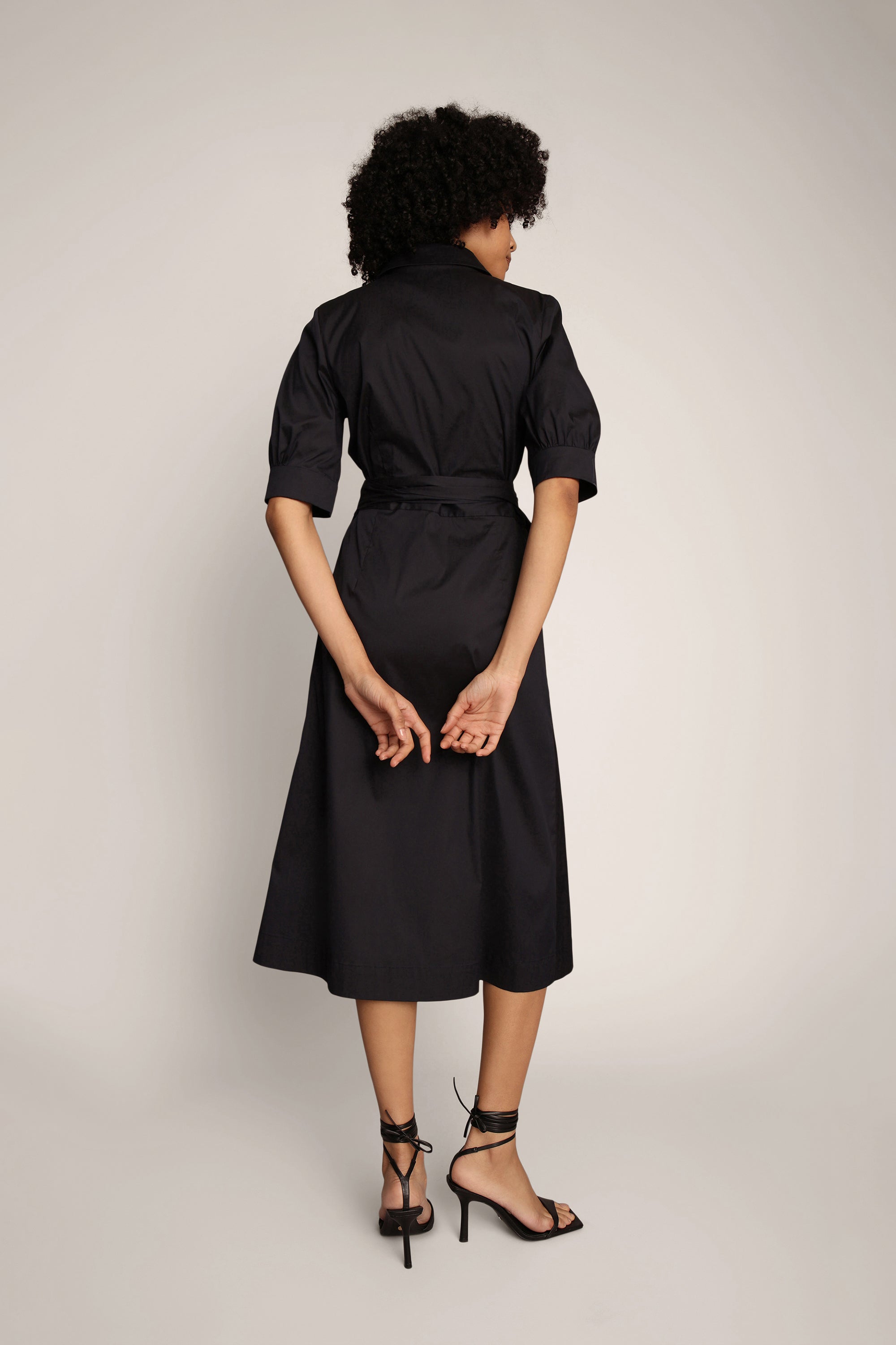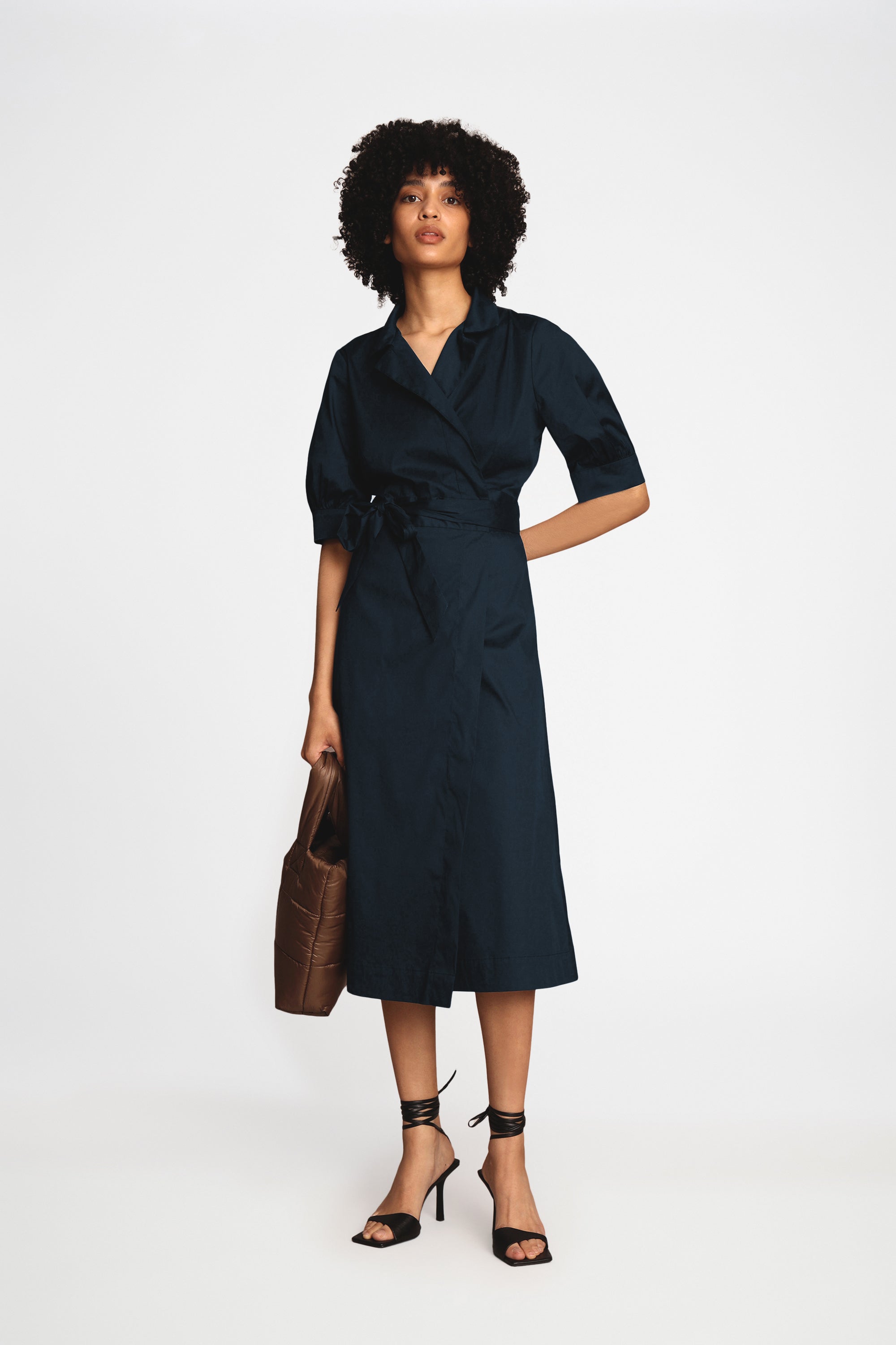 Classic wrap shirt dress, made in an organic cotton blend. This fitted dress has elbow long sleeves with a small puff and an elegant tie at the waist.