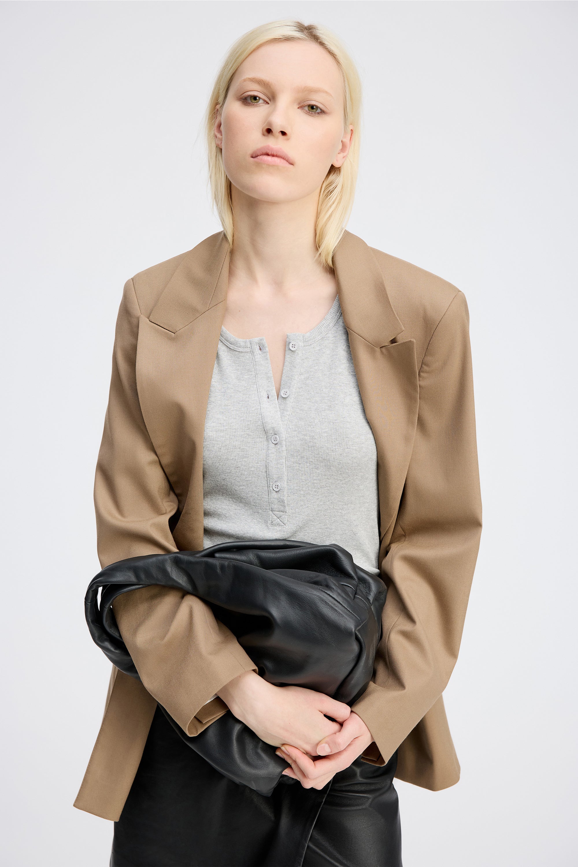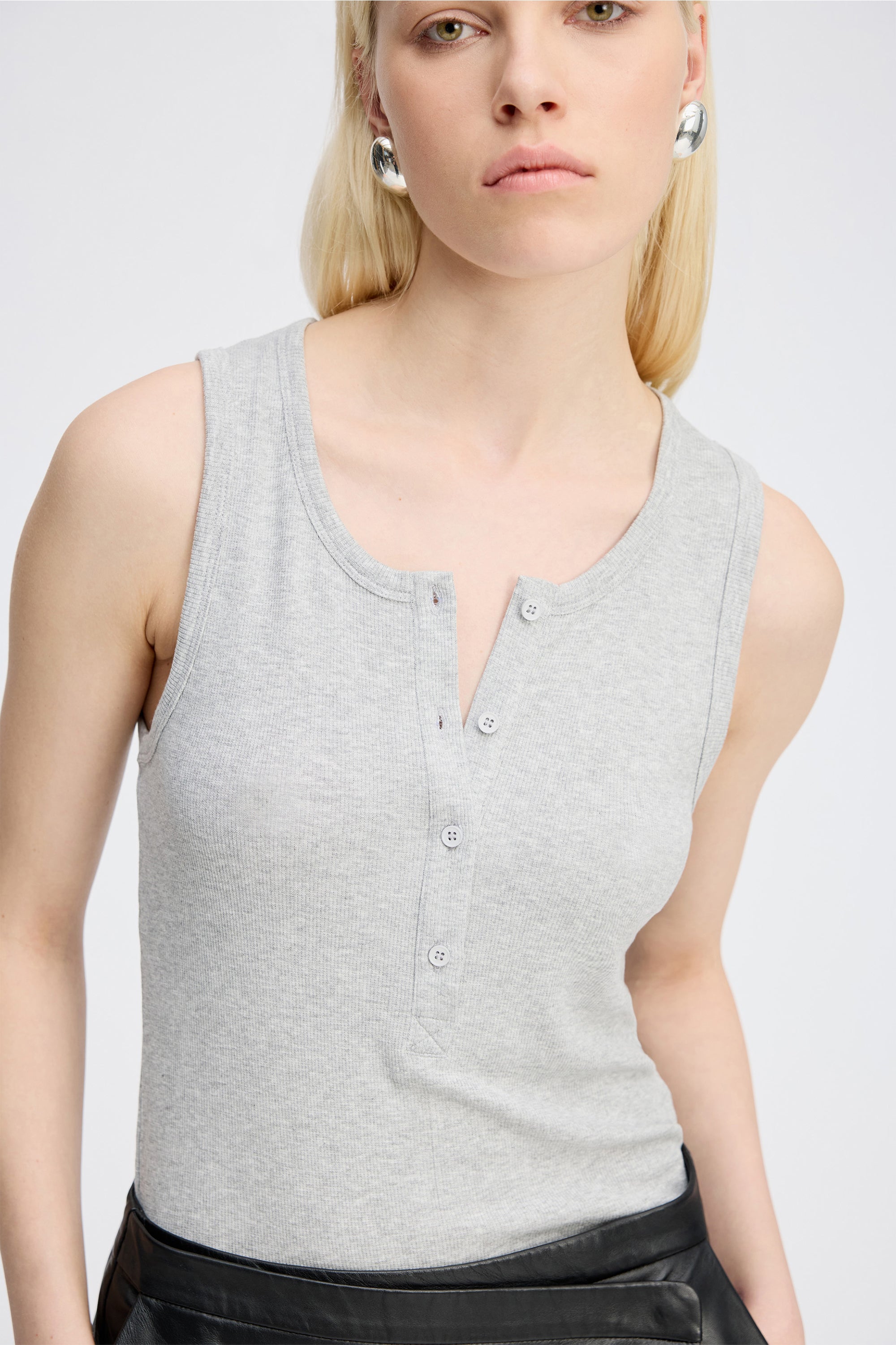 A ribbed T-shirt with an elegant half-button closure on the chest. This T-shirt has long sleeves and is designed with a round neckline.