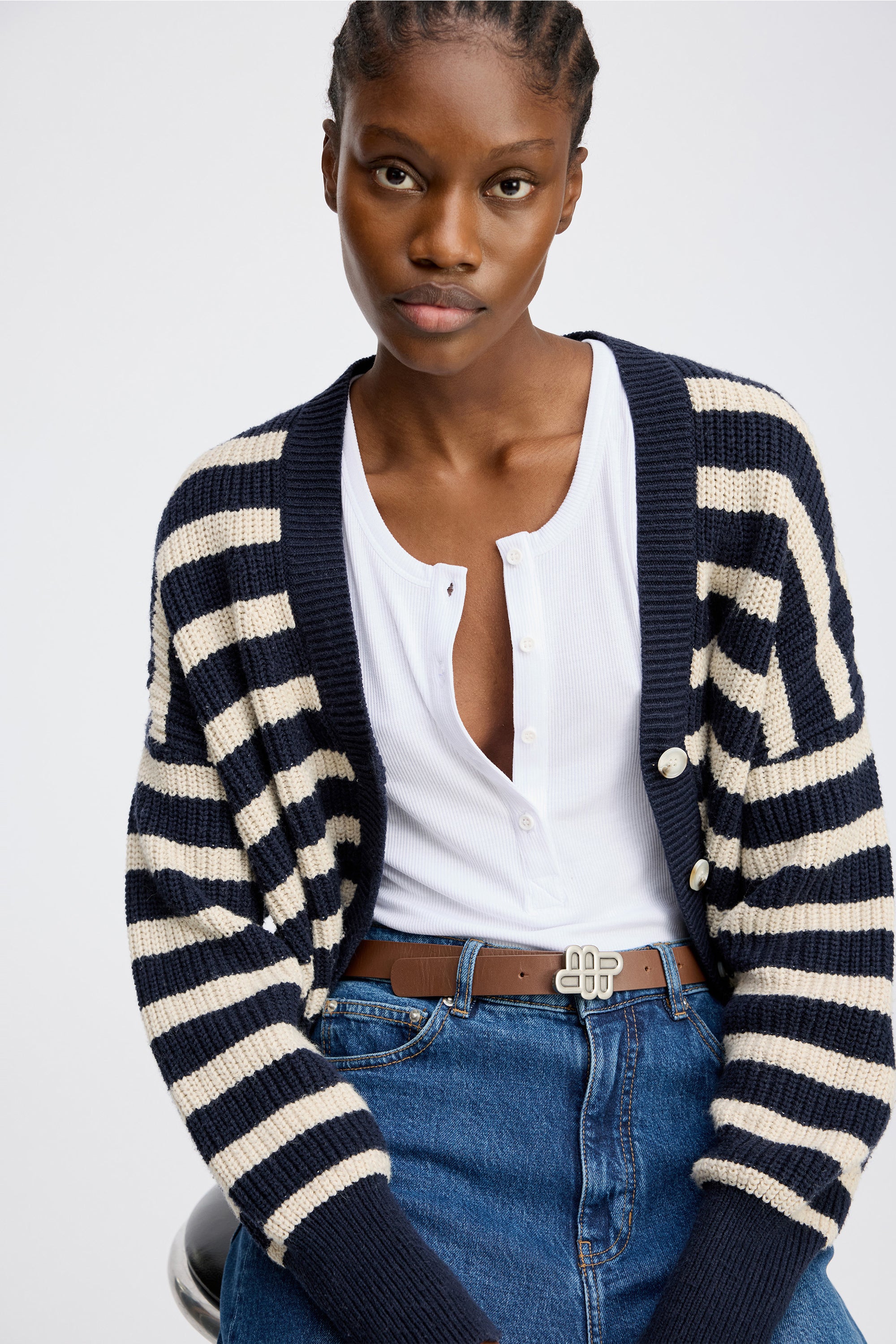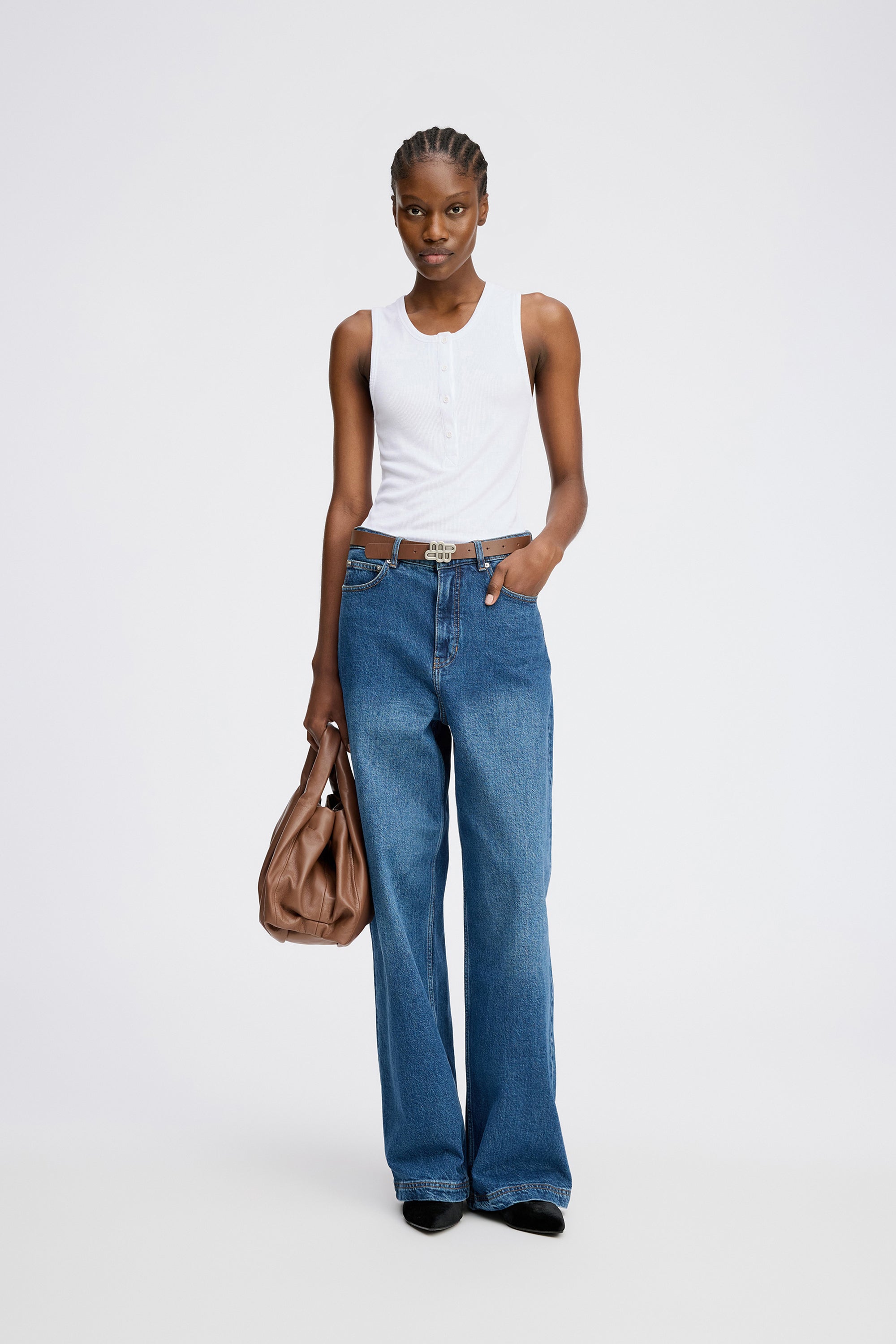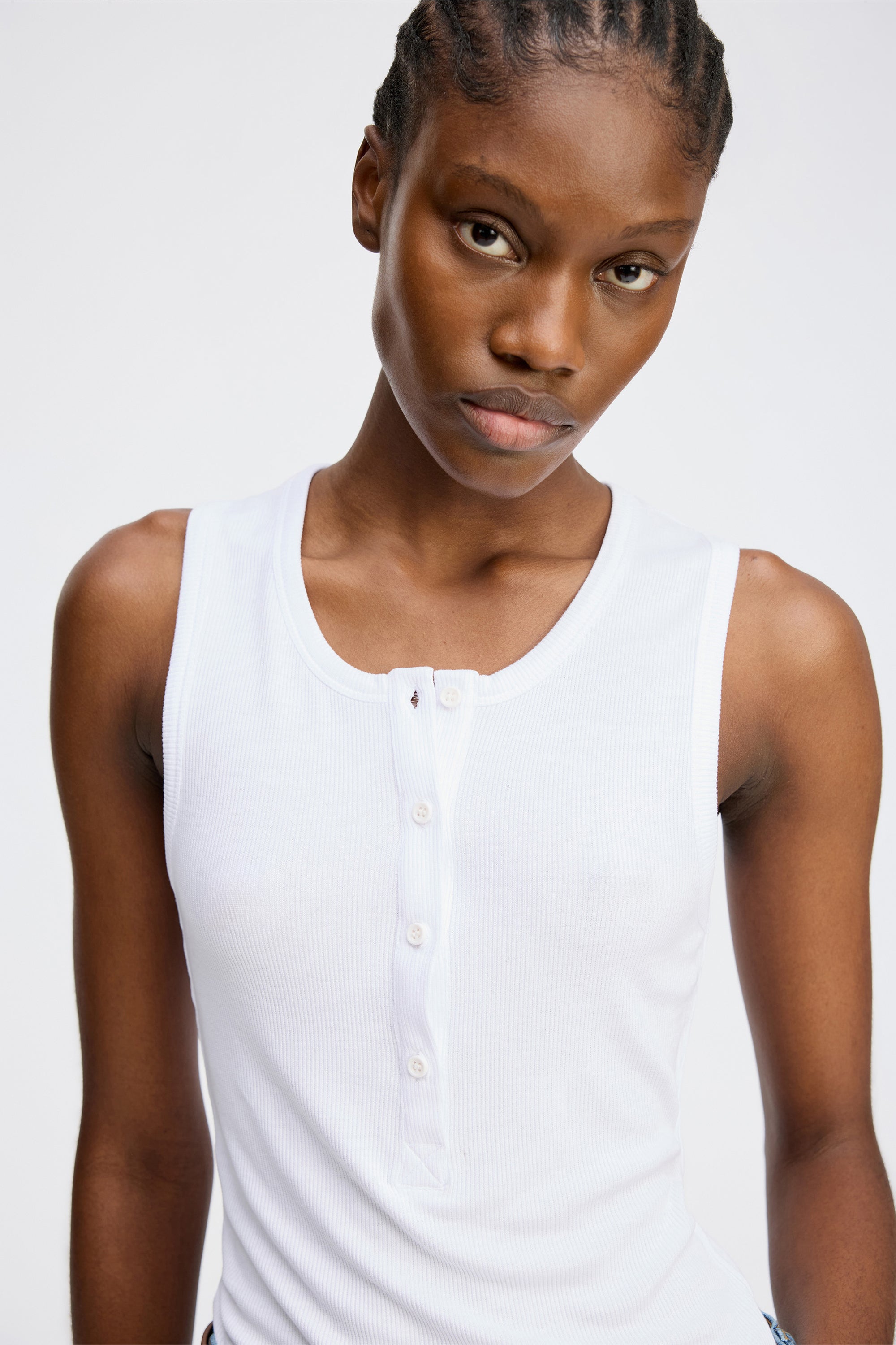 A ribbed tank with an elegant half-button closure on the chest. This tank is designed with a round neckline.