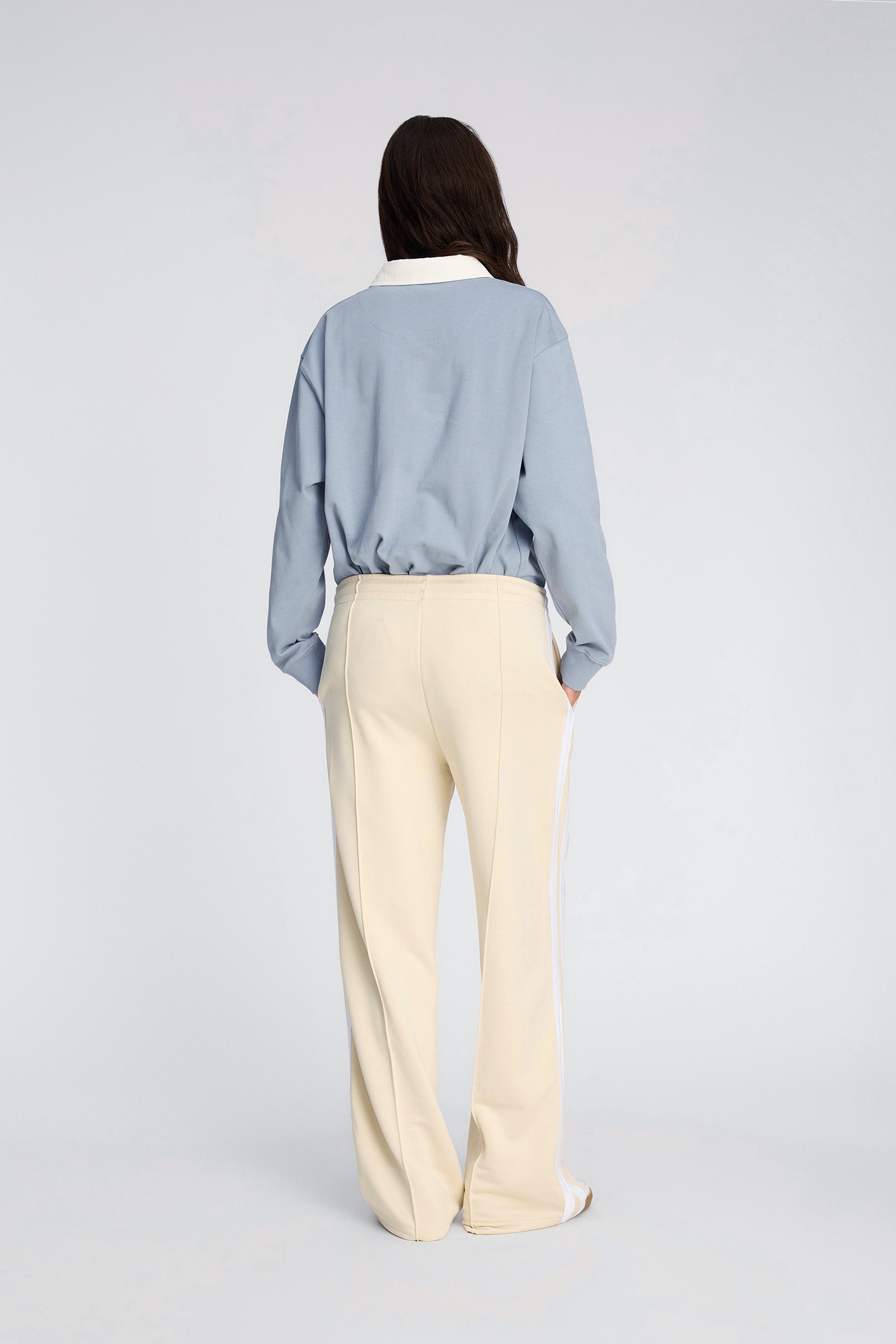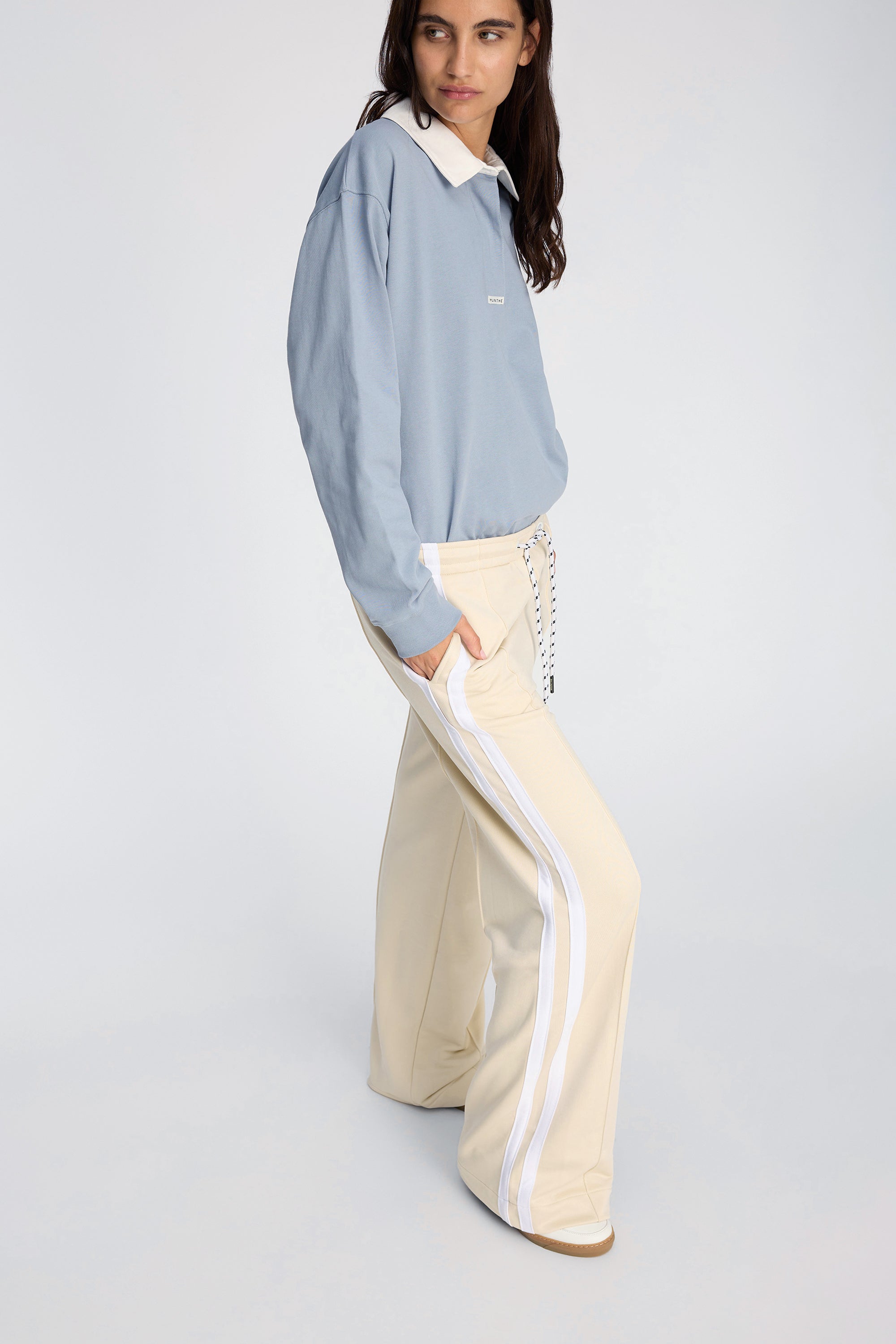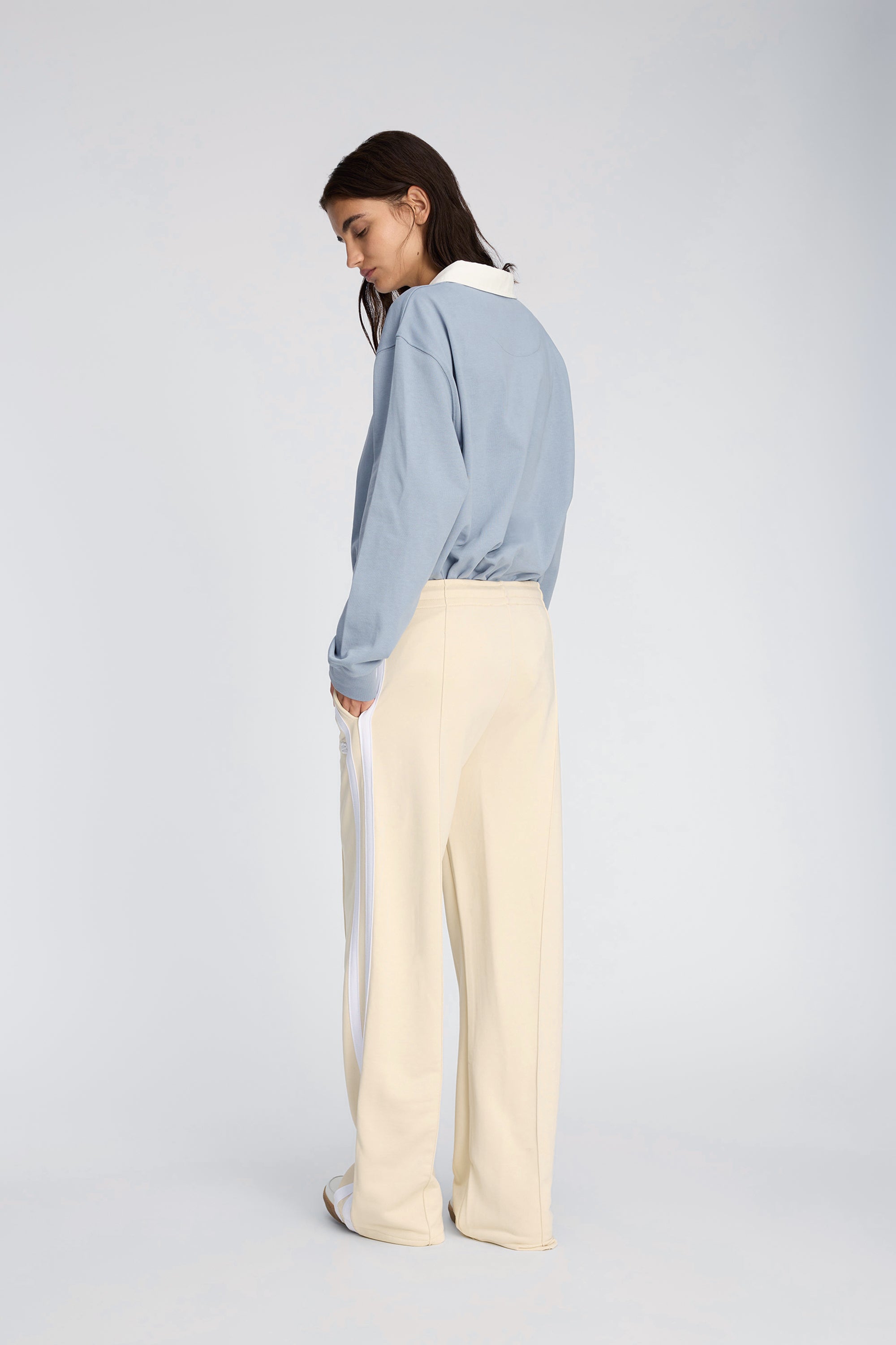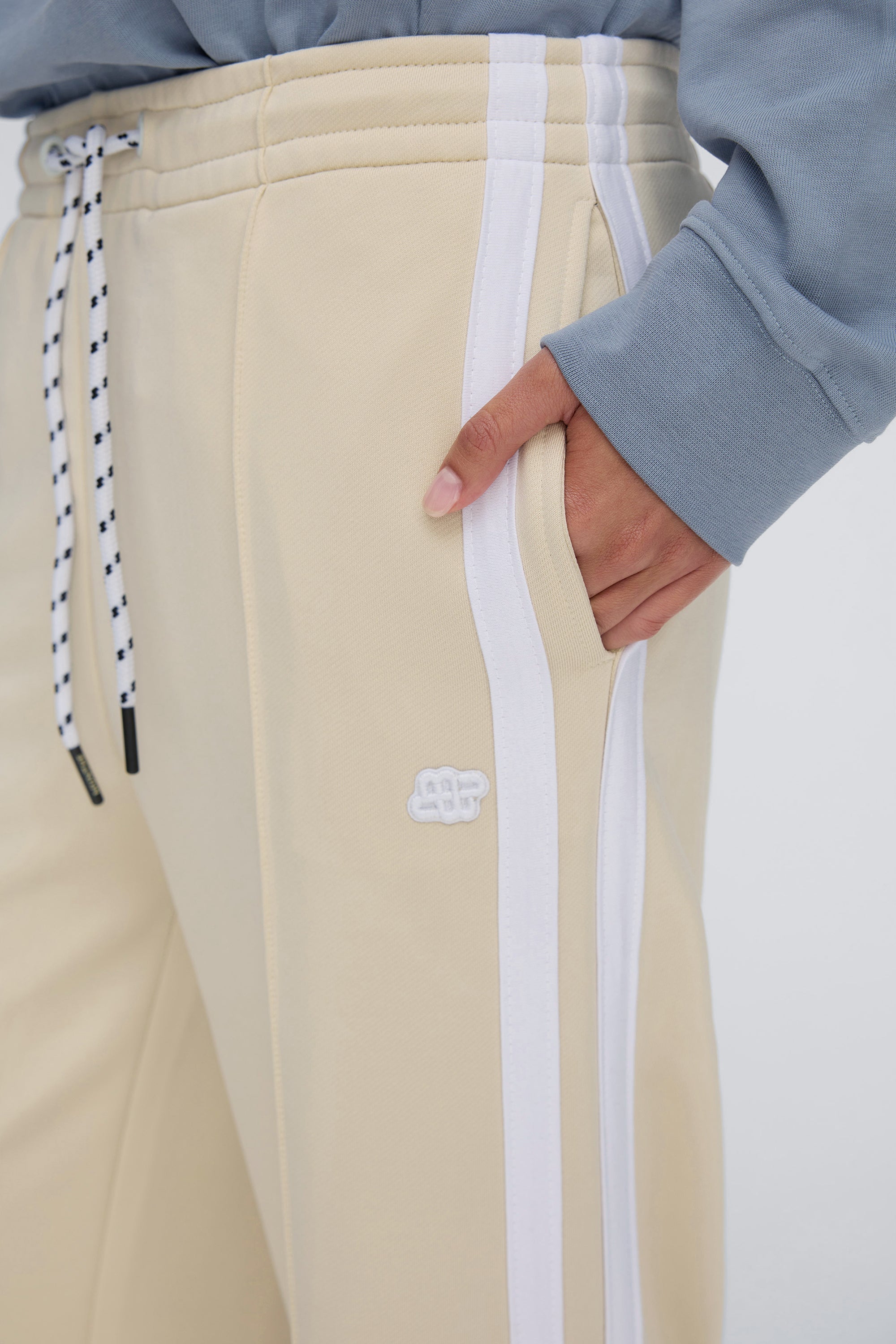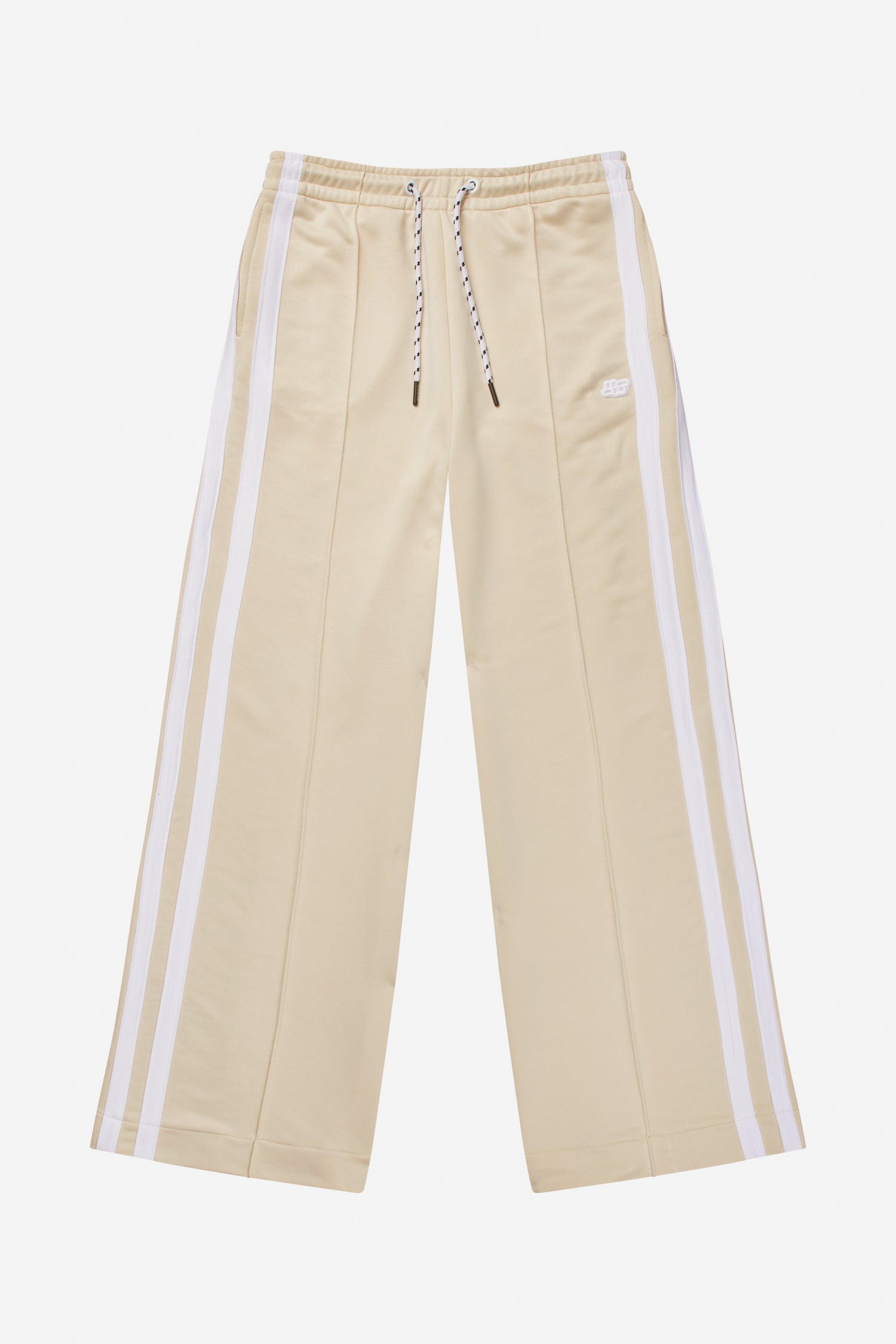 These trousers feature a straight, relaxed fit with an elastic waistband and adjustable drawstring. They are finished with bold side stripes, front creases, and a small embroidered logo. A sporty design suited for everyday wear or more styled looks.