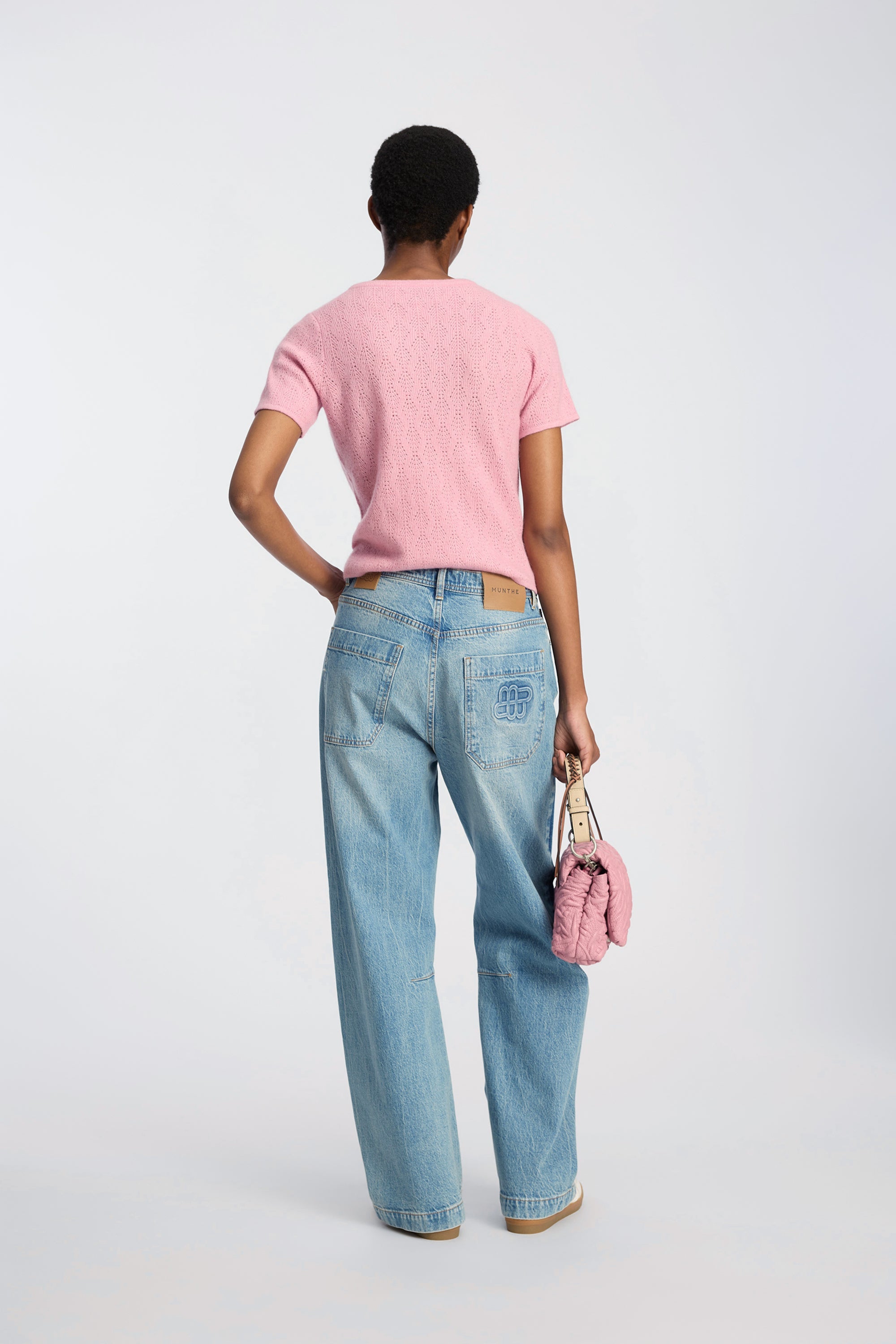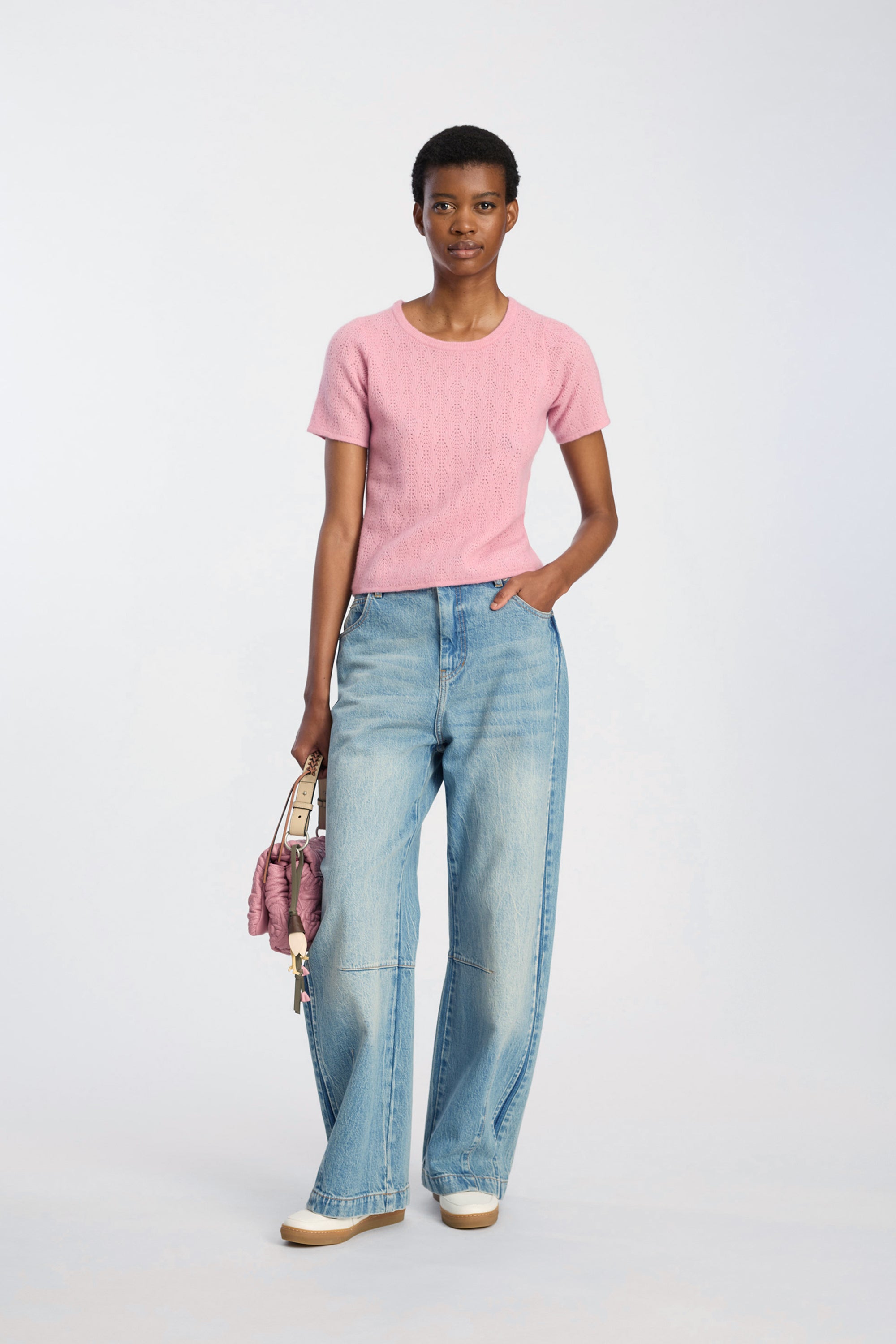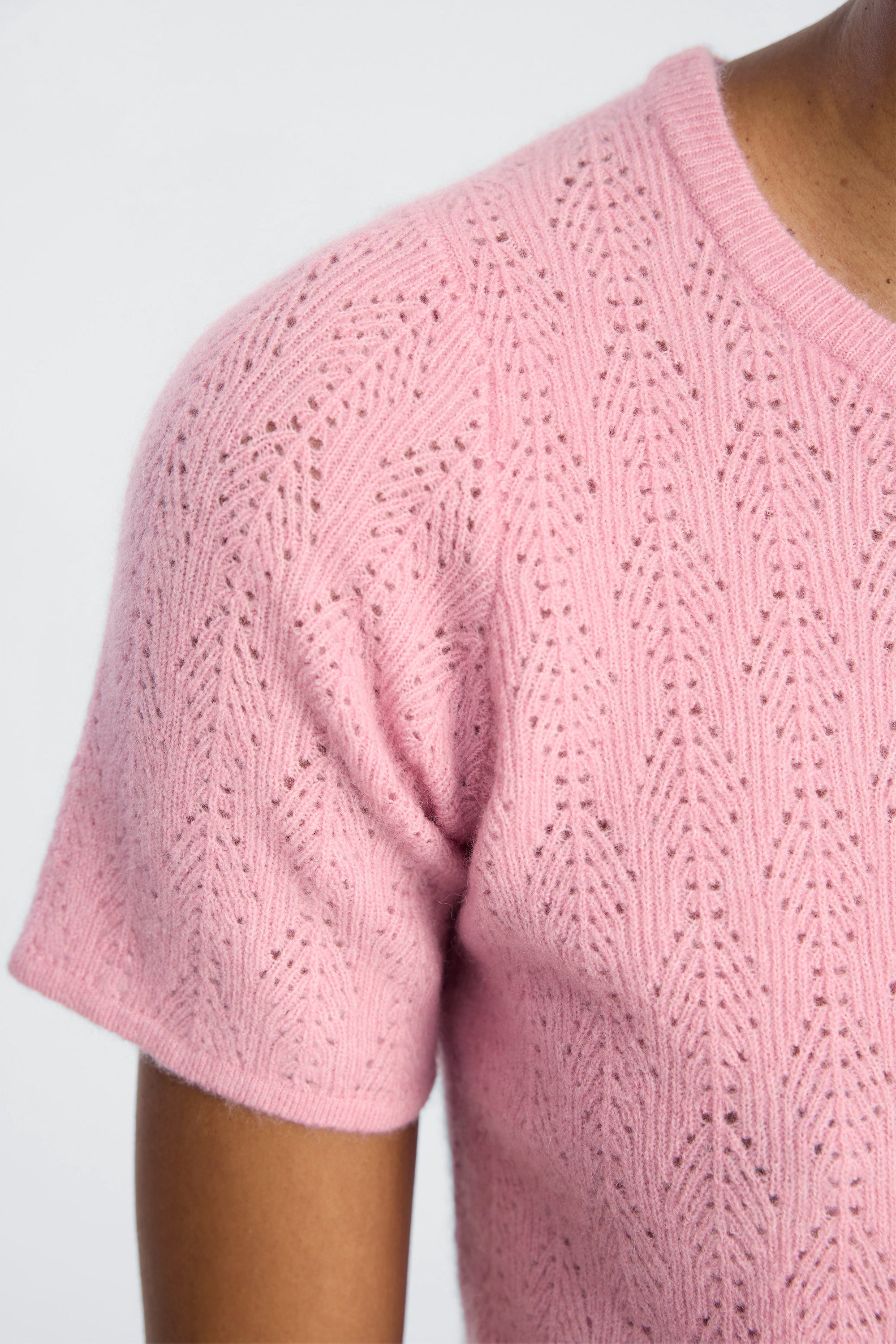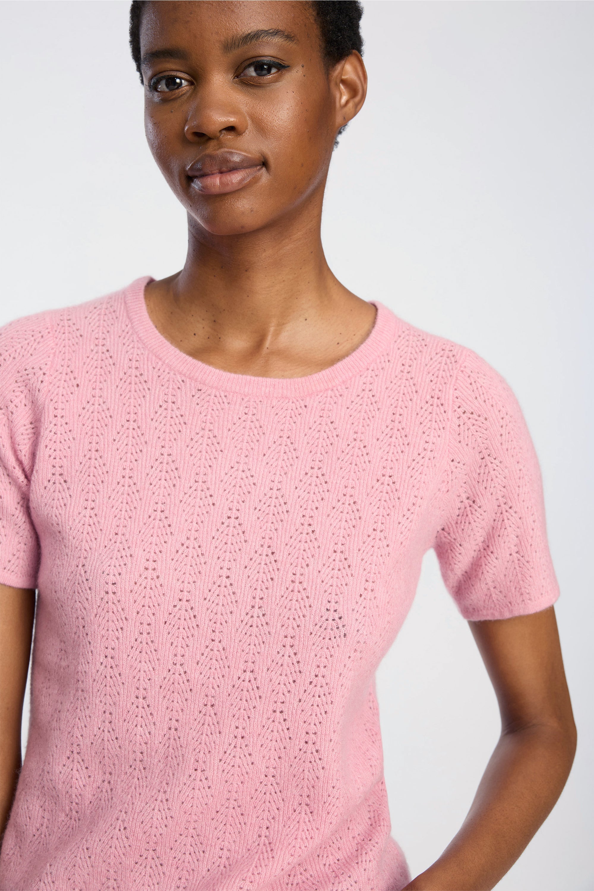 Short-sleeve top made in a pointelle knit with a round neckline, a straight silhouette. and in 19% cashmere.