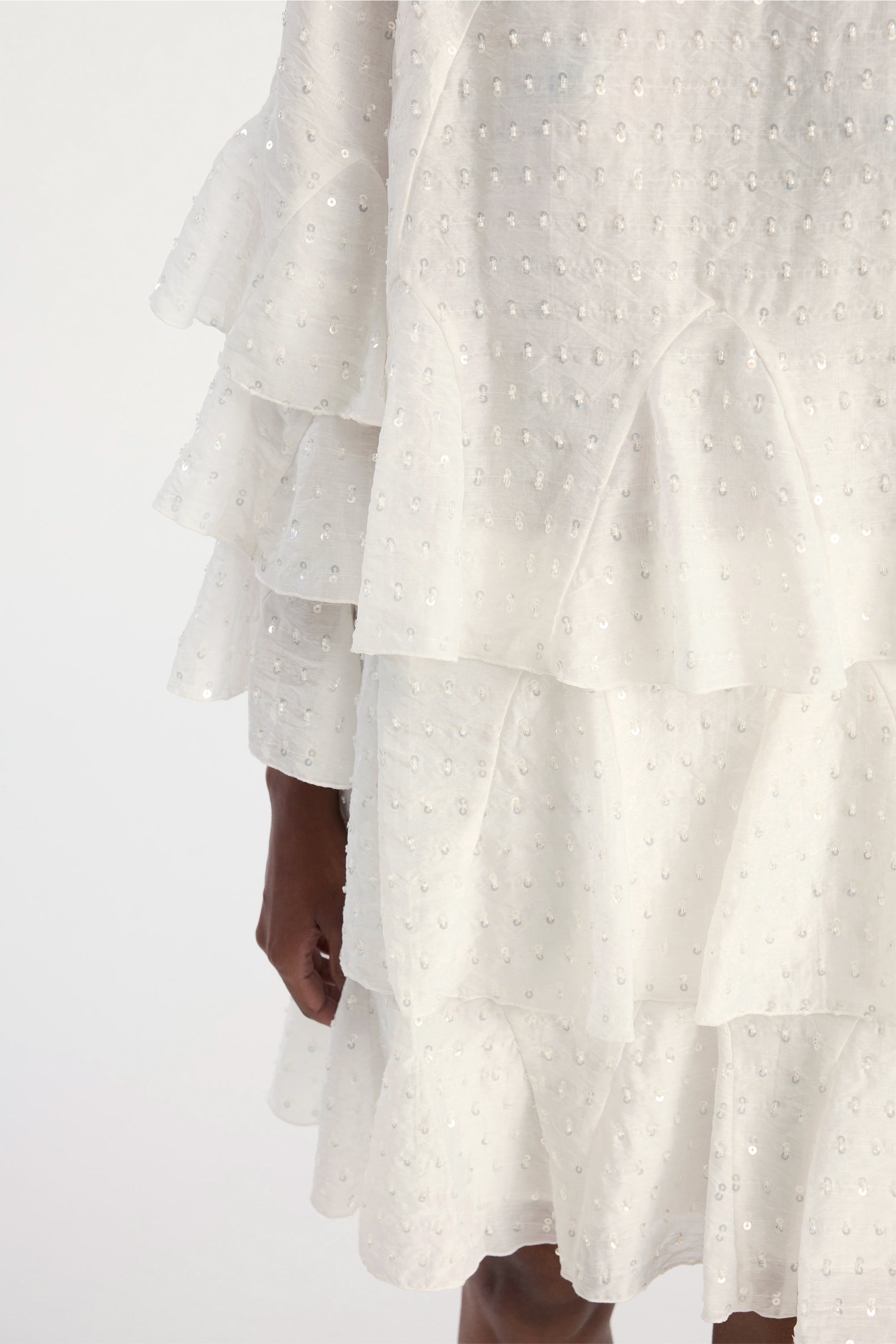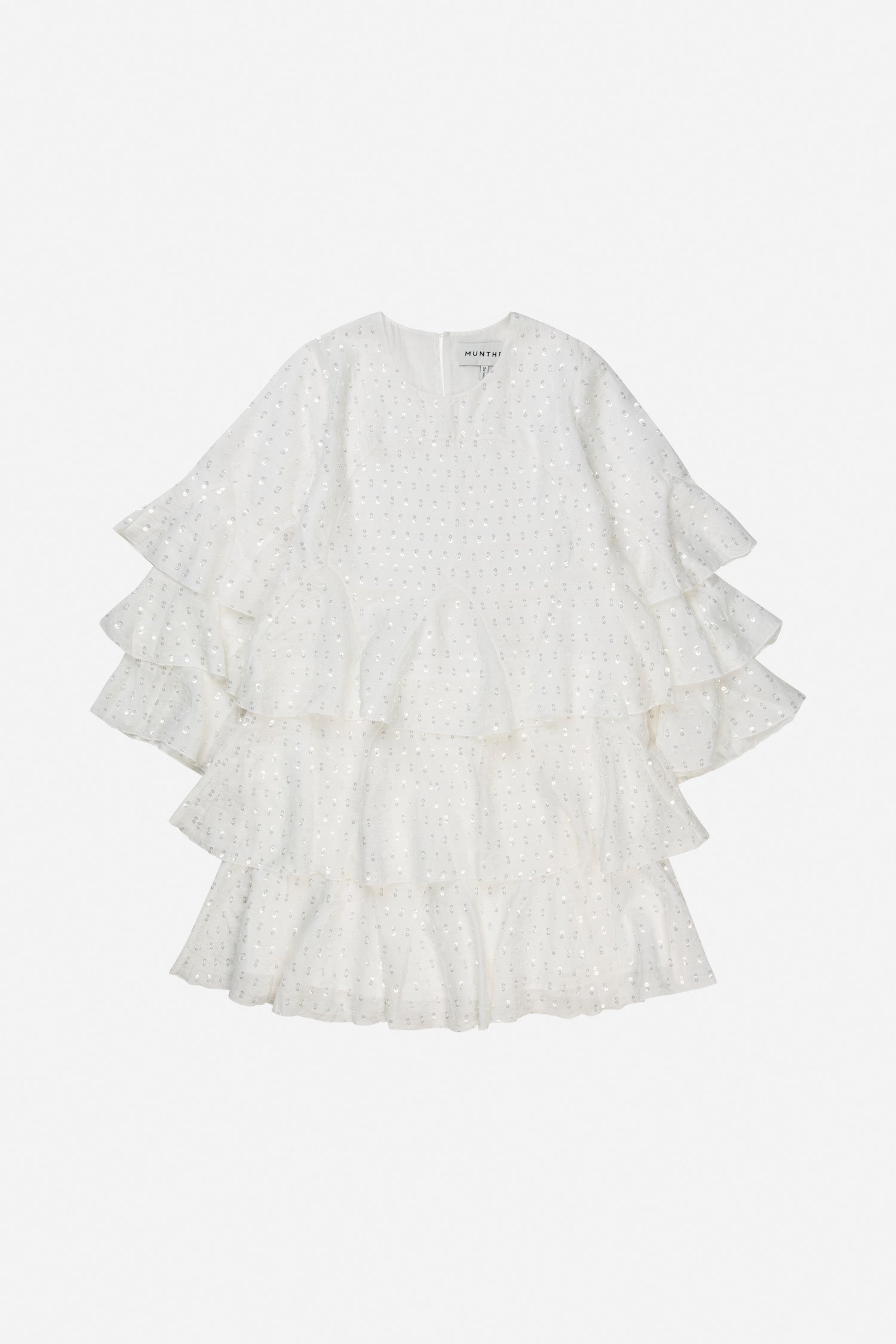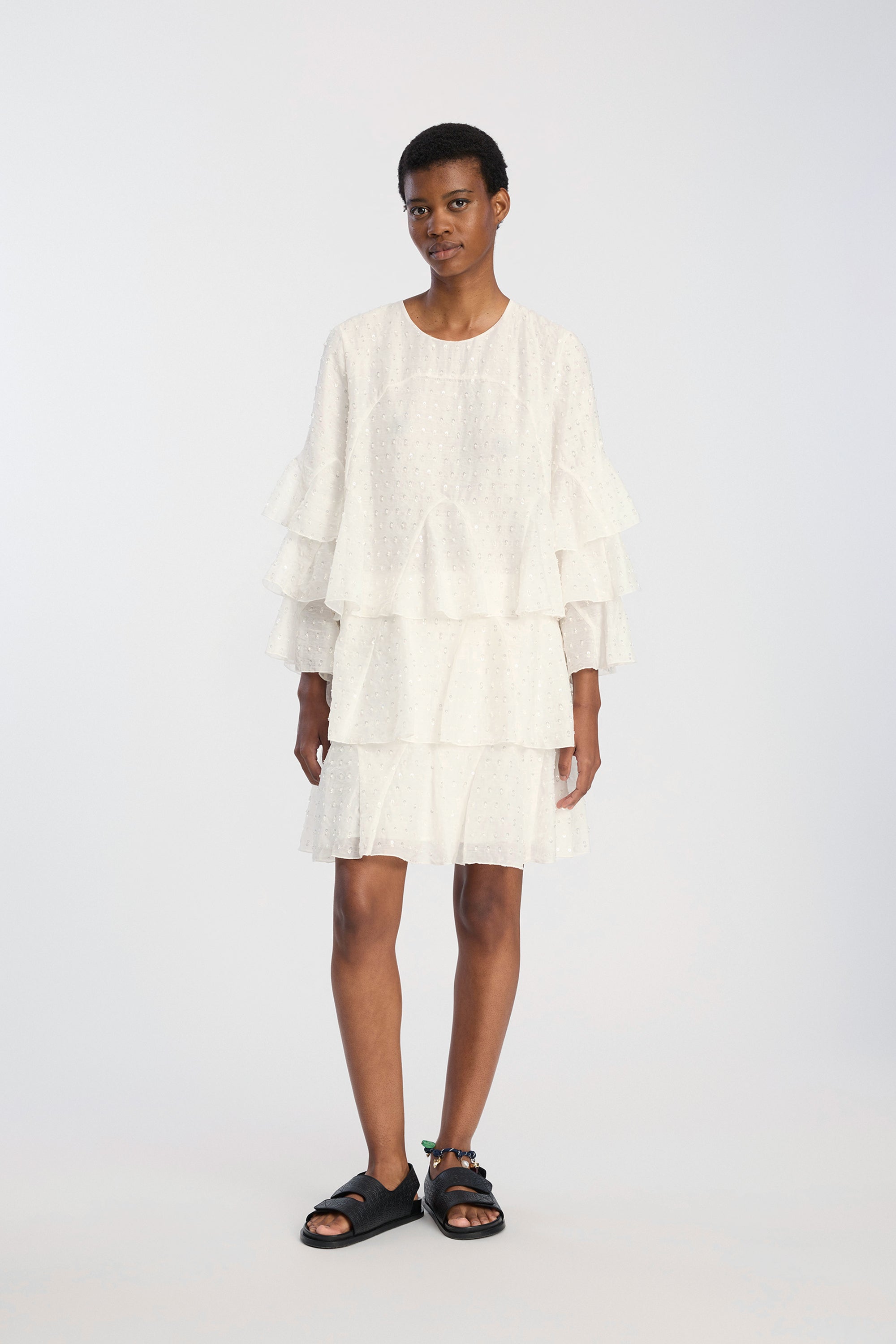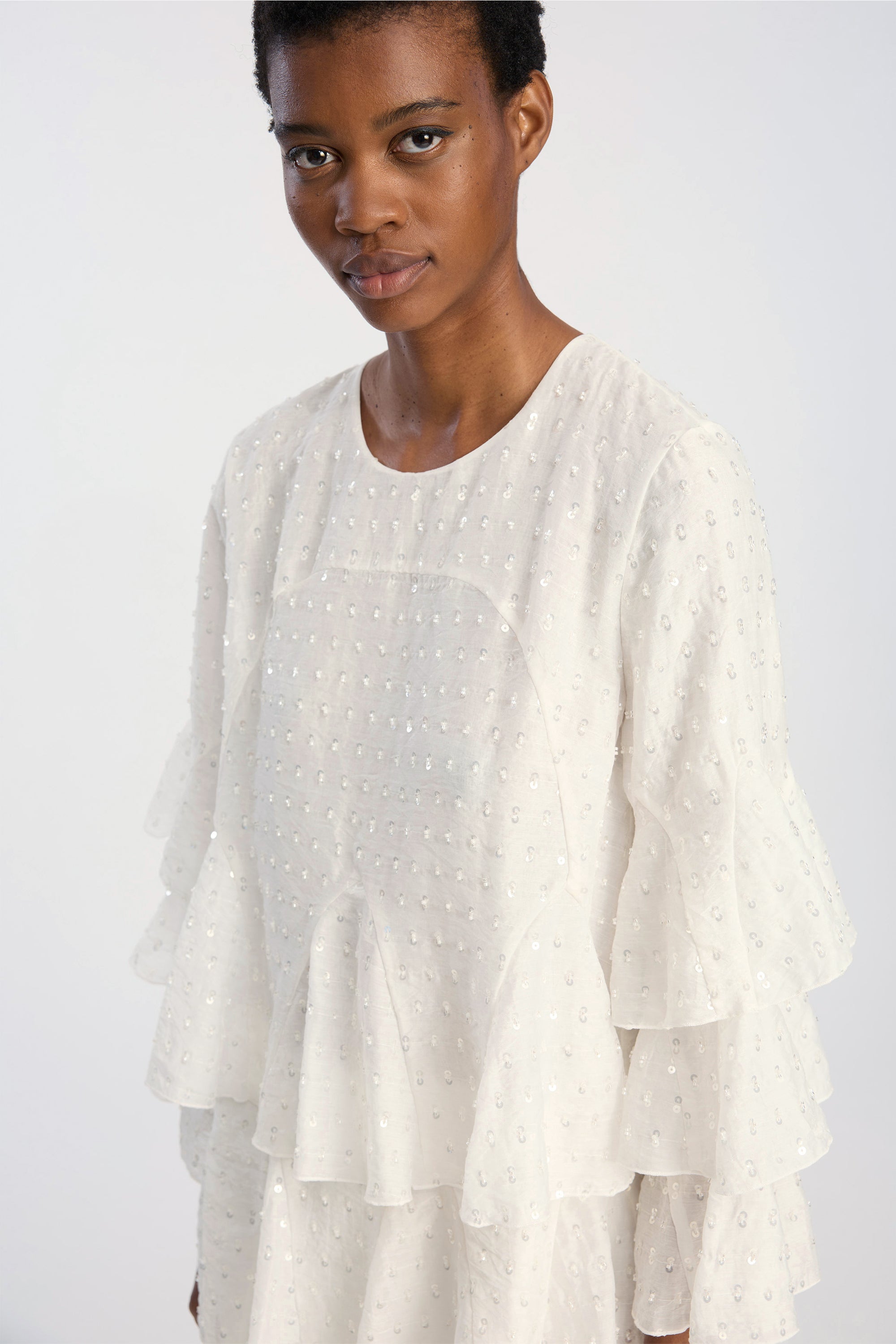 Dress crafted from a lightweight woven fabric embellished with small sequins and pearl details. The design features a round neckline, short sleeves with wide, layered ruffles, and a relaxed fit that offers an airy, voluminous drape. The ruffle layers extend through the skirt, adding structure and movement to the dress.