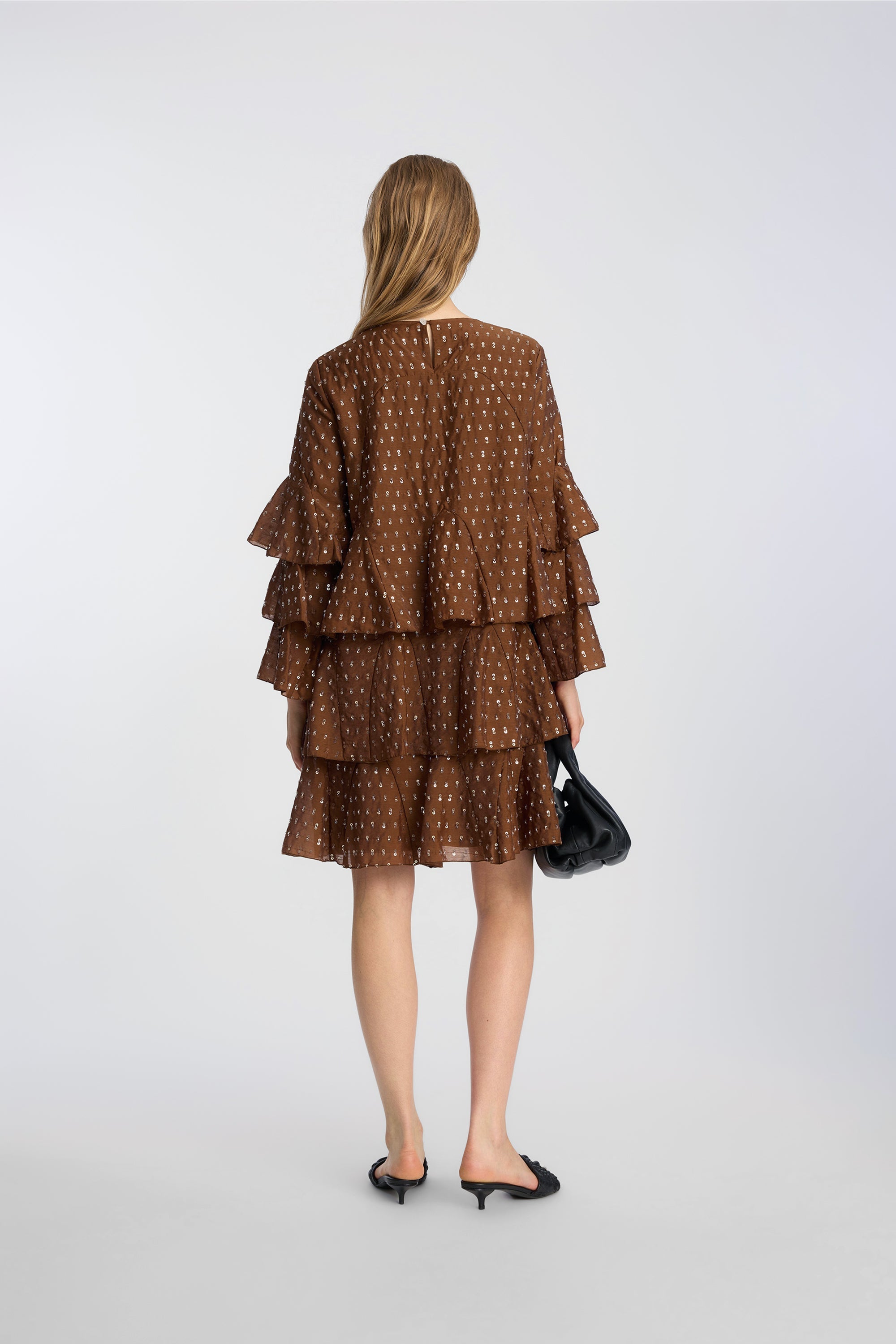 Dress crafted from a lightweight woven fabric embellished with small sequins and pearl details. The design features a round neckline, short sleeves with wide, layered ruffles, and a relaxed fit that offers an airy, voluminous drape. The ruffle layers extend through the skirt, adding structure and movement to the dress.