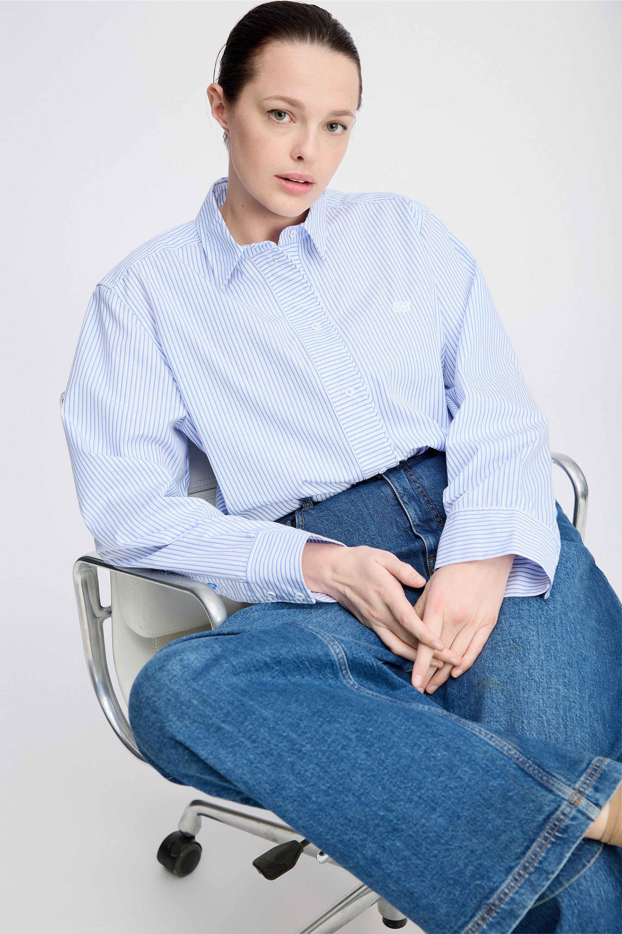A shirt with beautiful pinstripes that are elegantly twisted to run horizontally along the button closure. This shirt features long sleeves with stylish cuffs and is designed for a loose fit.