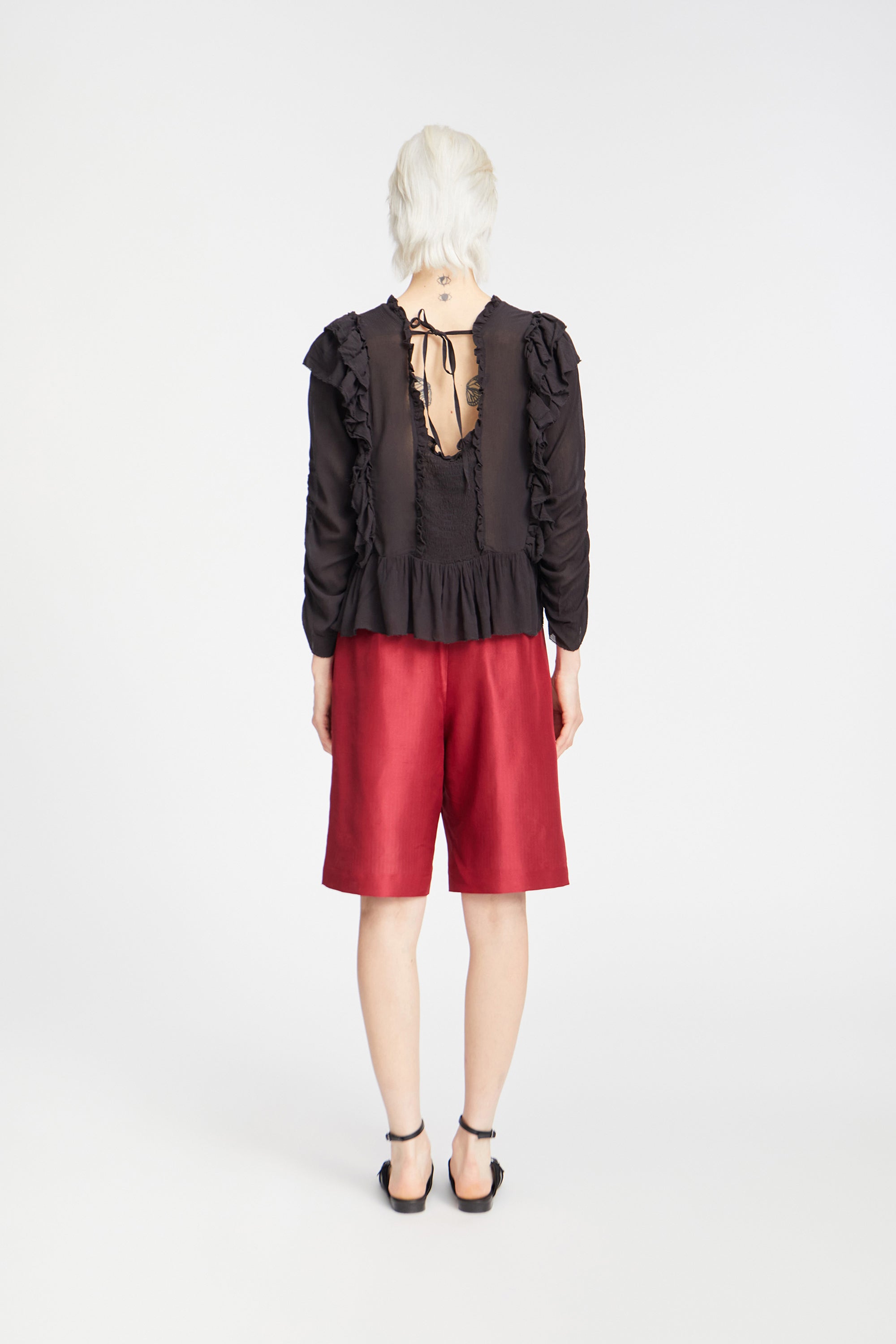 A feminine blouse with elegant smog and ruffled details. The blouse is elegantly tied at the neck with a fine tie and has a regular fit.