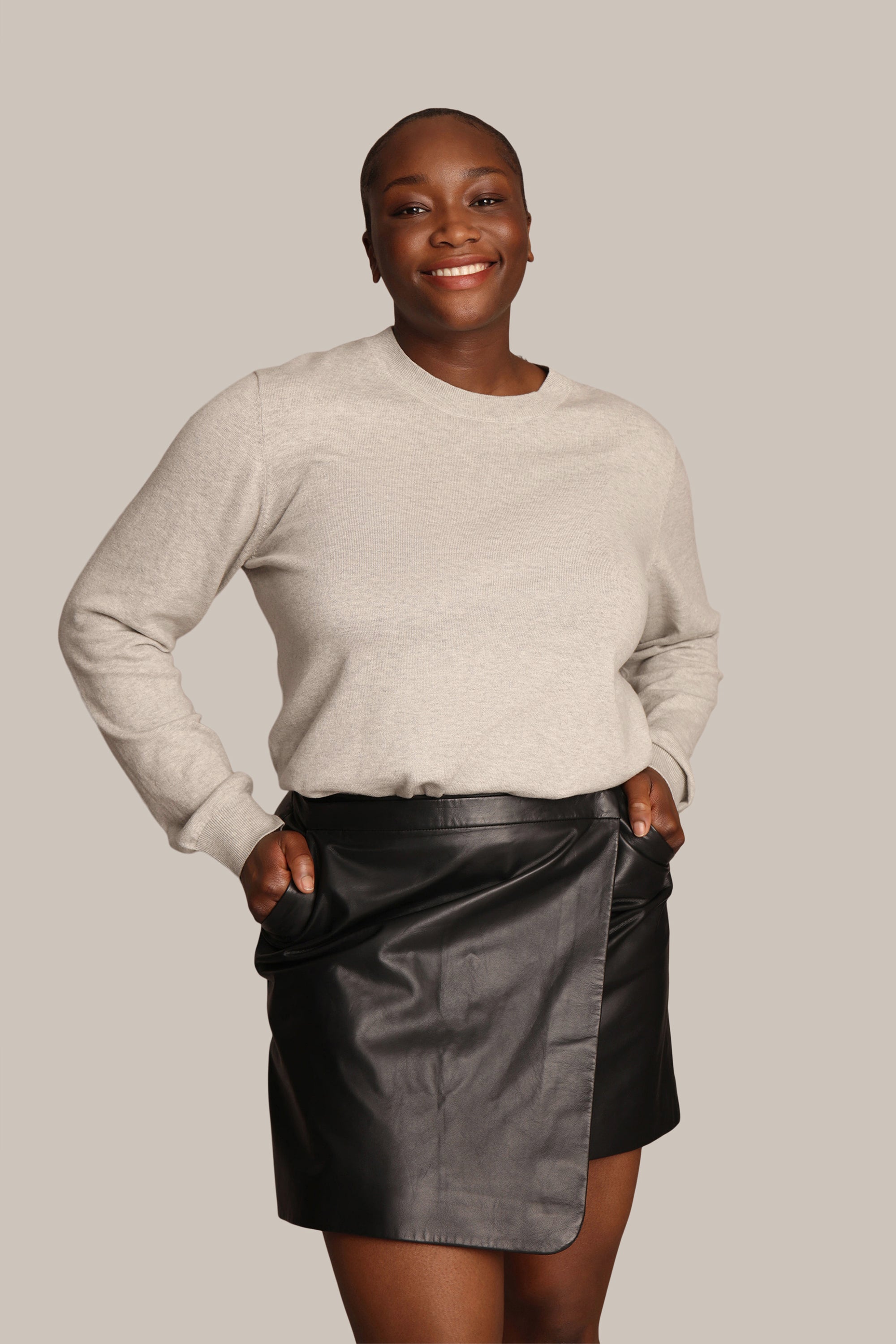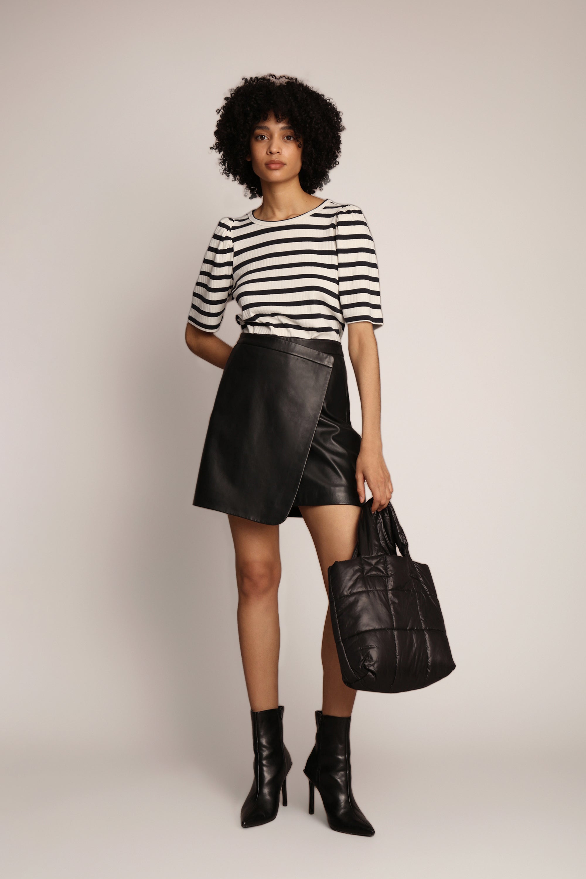 Short and classic leather a-skirt, designed with an asymmetric look and a slit pocket on each side.