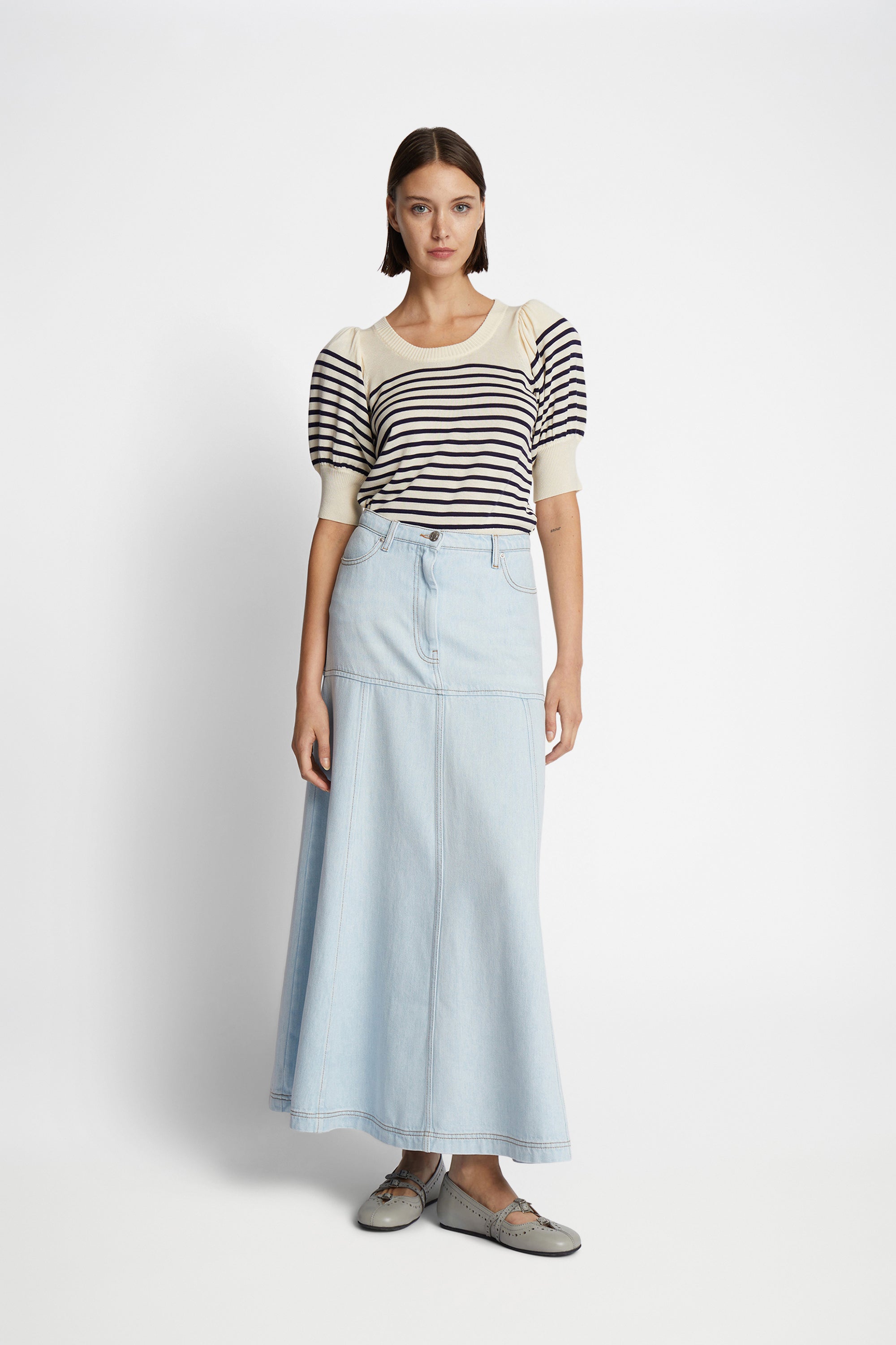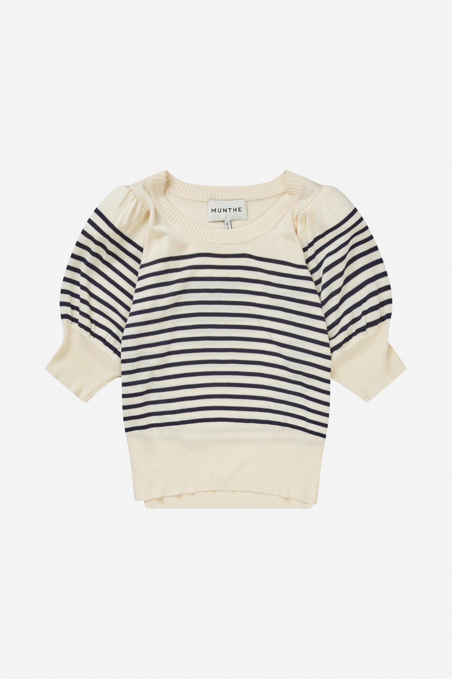 Beautiful striped knit with elegant short puff sleeves. This knit has shoulder pads, and is made from a soft wool blend. This knit is designed for a regular fit.