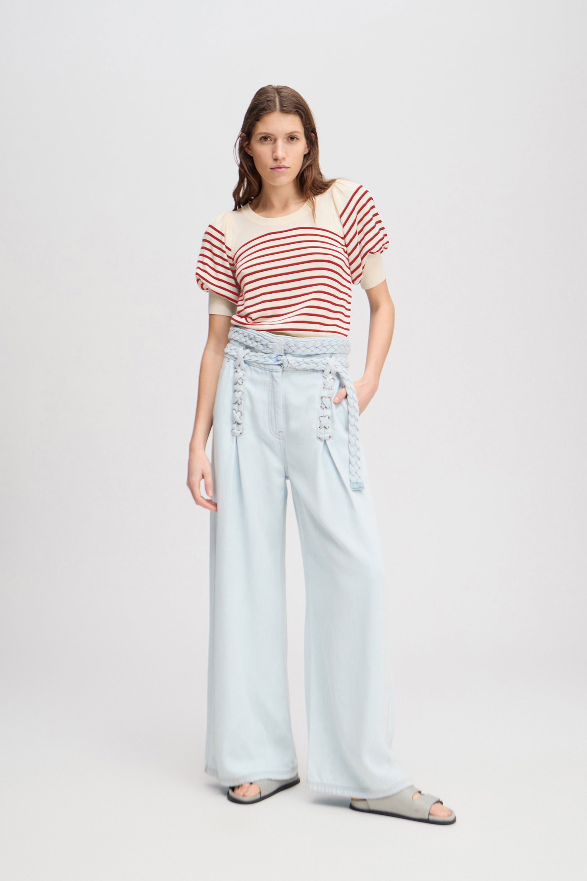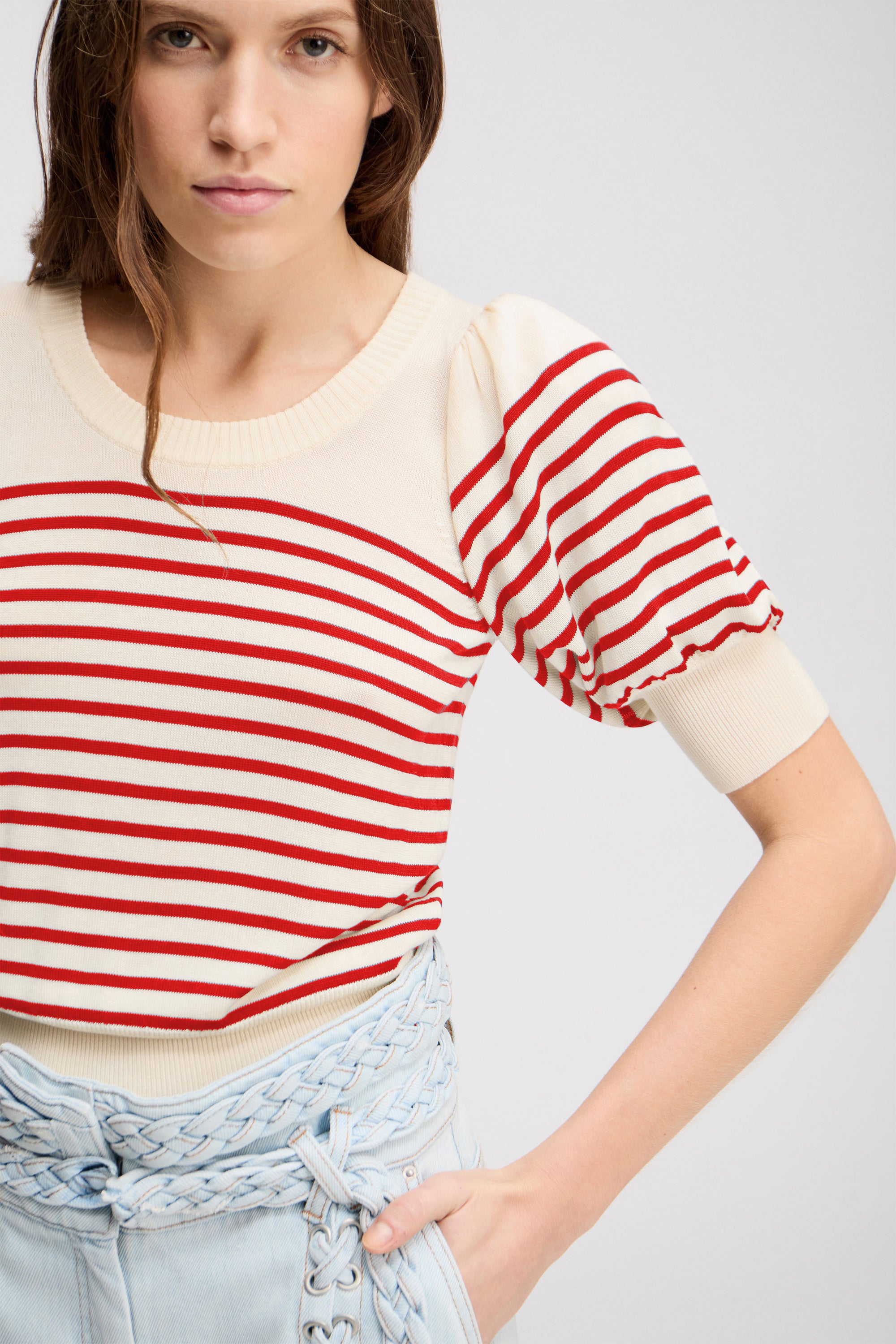 Beautiful striped knit with elegant short puff sleeves. This knit has shoulder pads, and is made from a soft wool blend. This knit is designed for a regular fit.