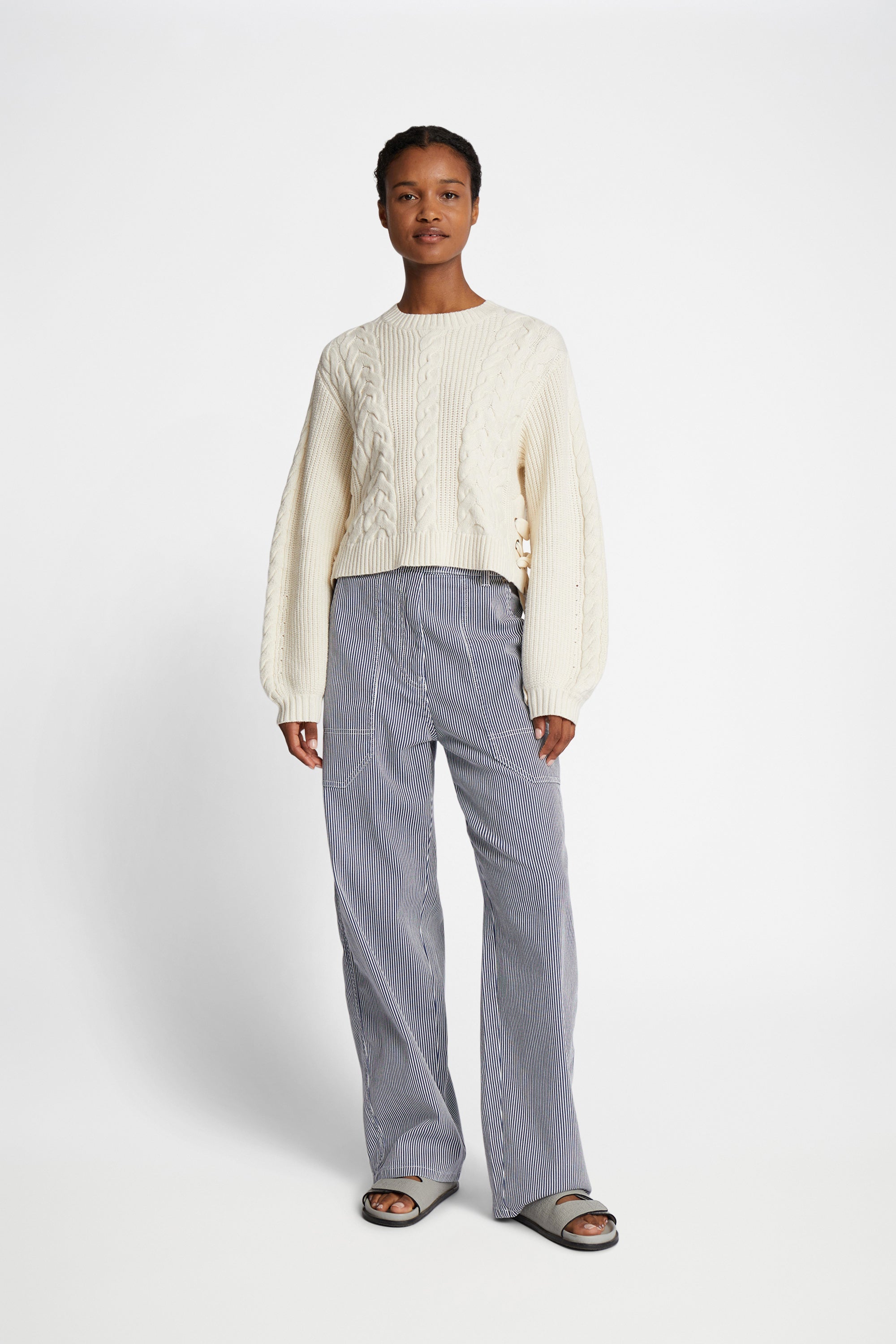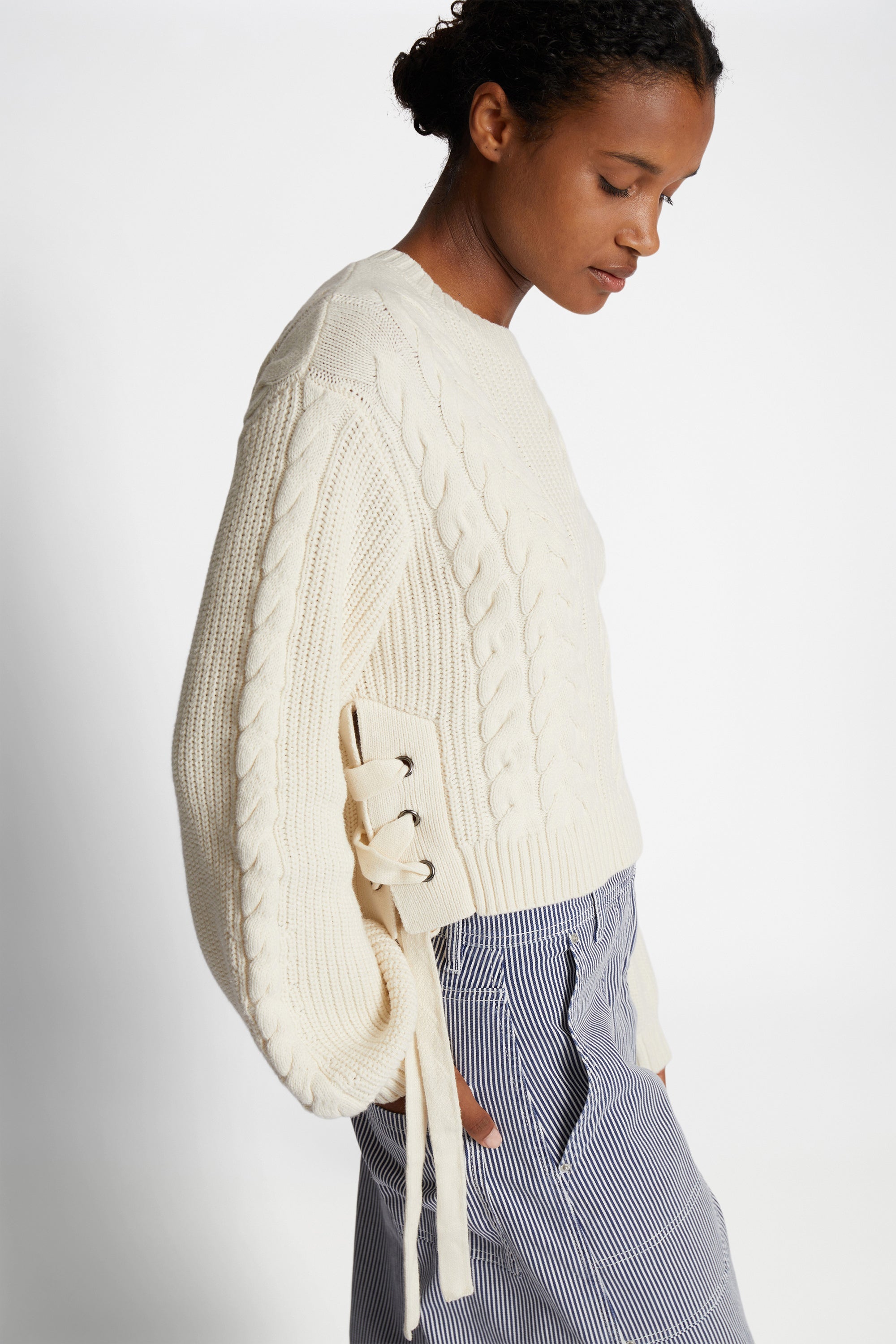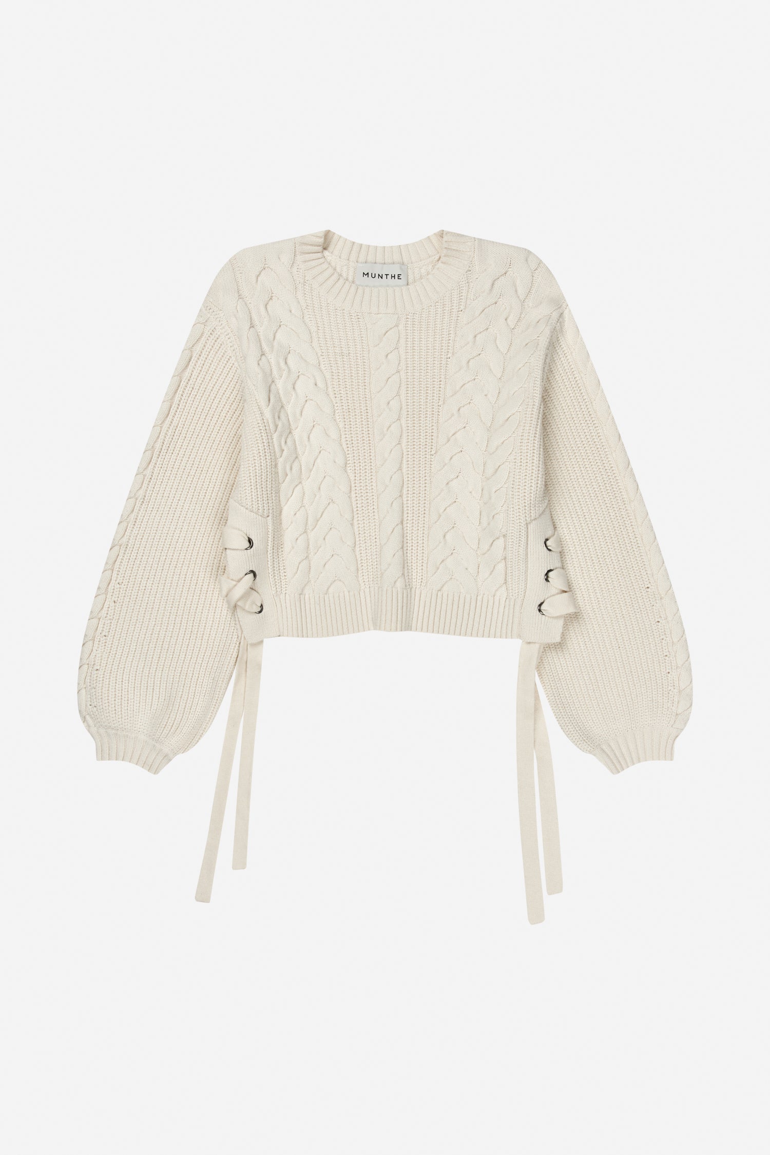 Soft cable knit with elegant string details at the sides. This knit has long balloon sleeves, a round neck, and an elegant rib along the edges.