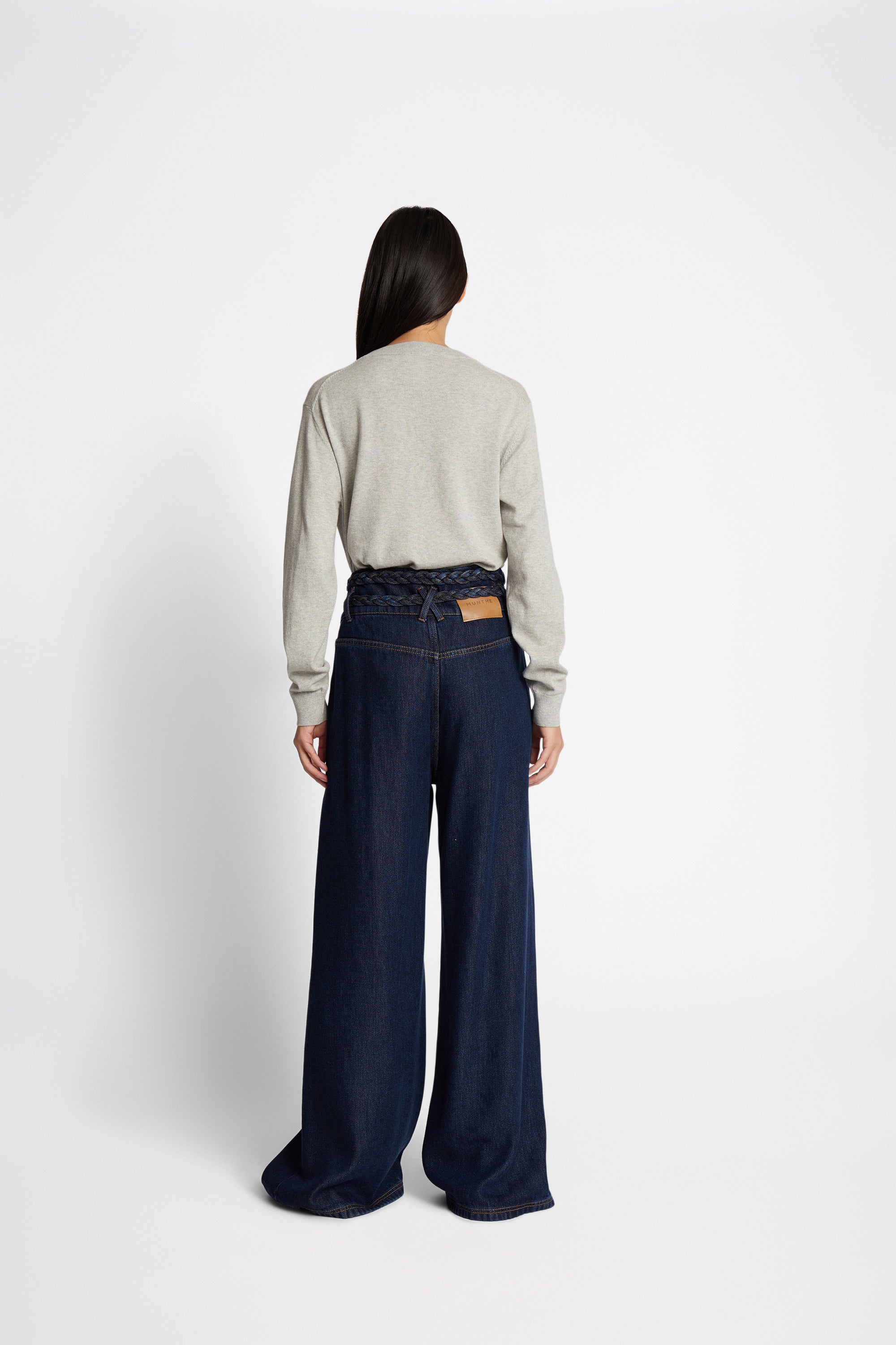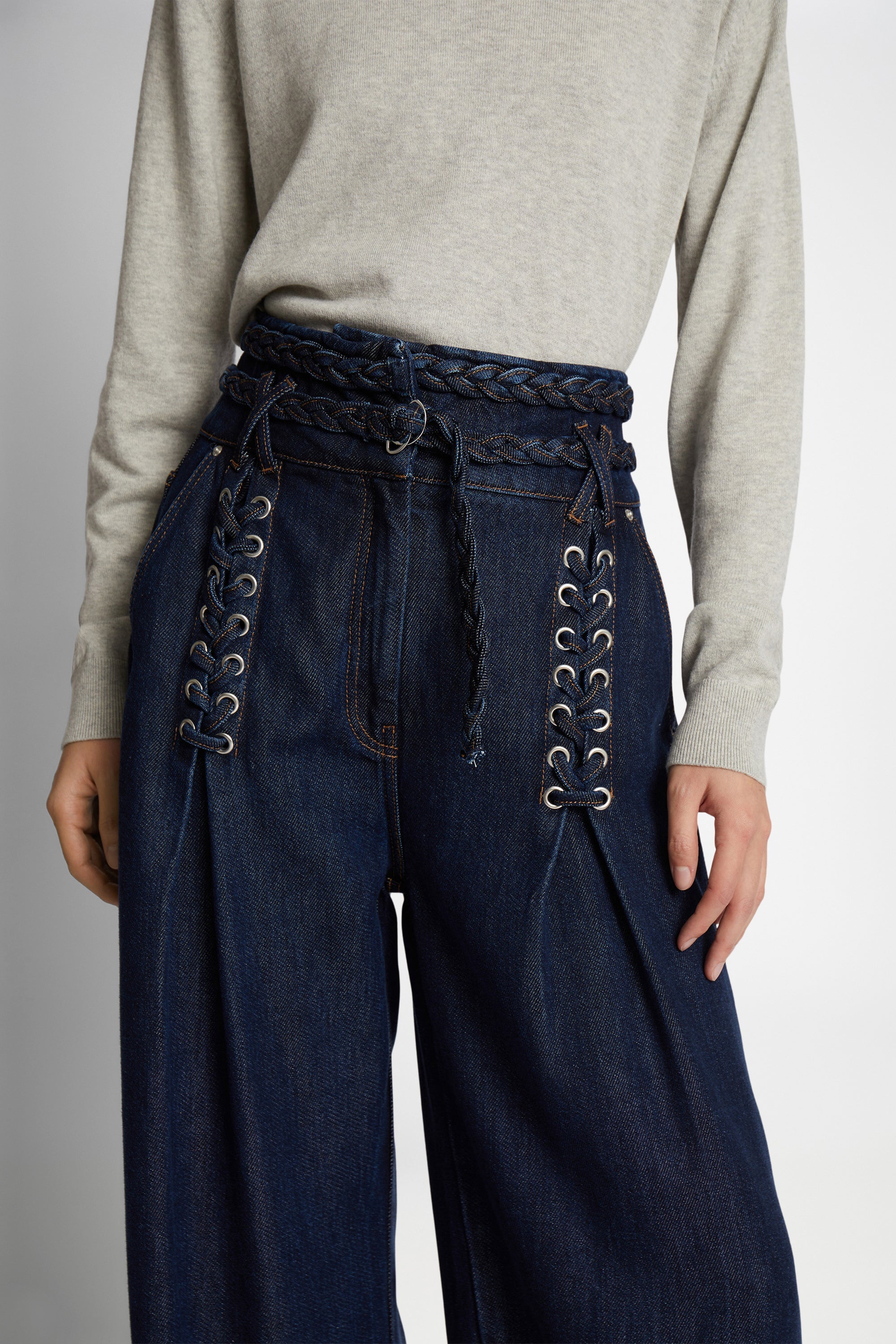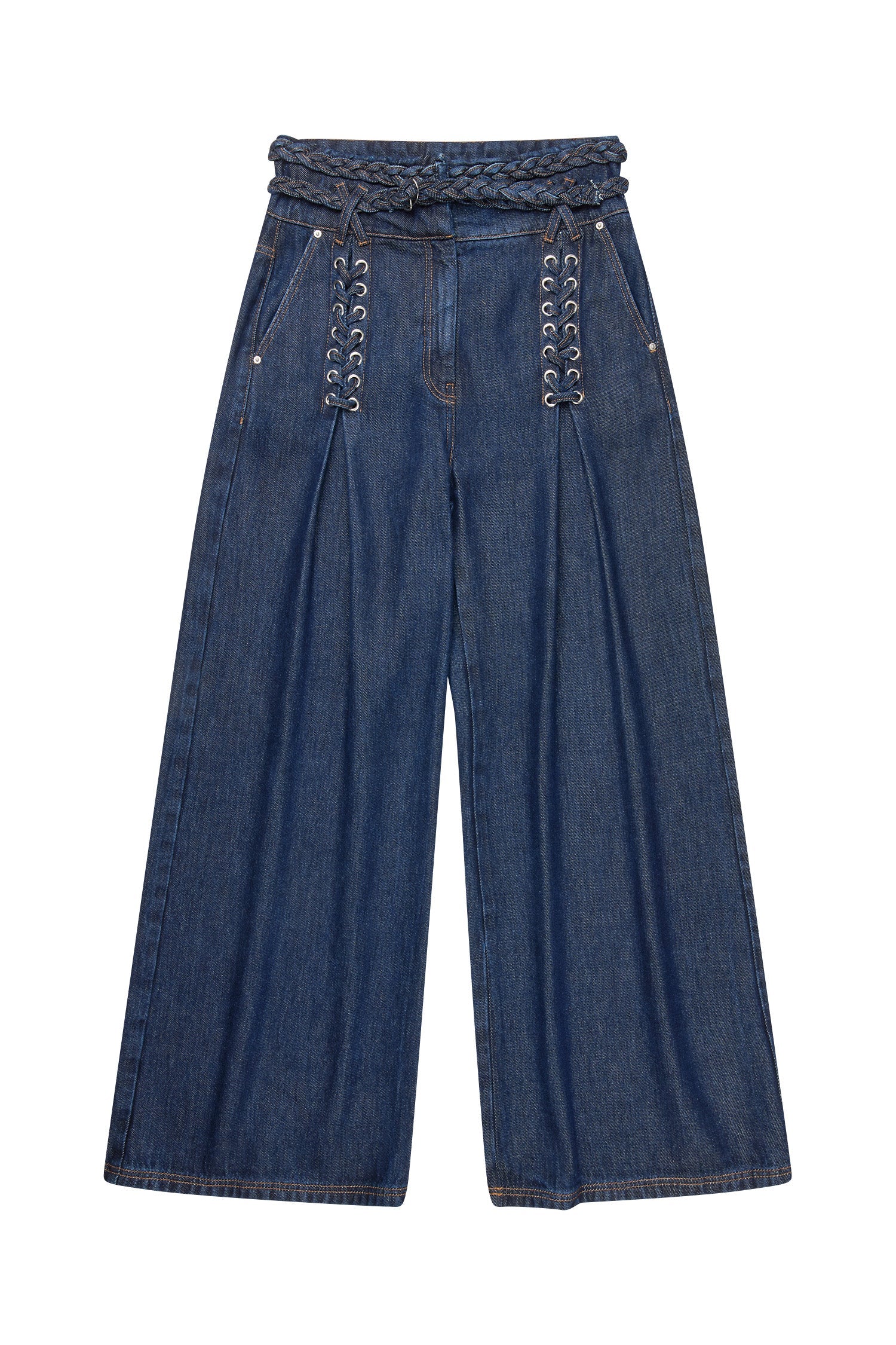 Jeans with a beautiful braided detail around the waist, and a tie string detail down the hips. These jeans are designed with a high waist, wide legs and side pockets.