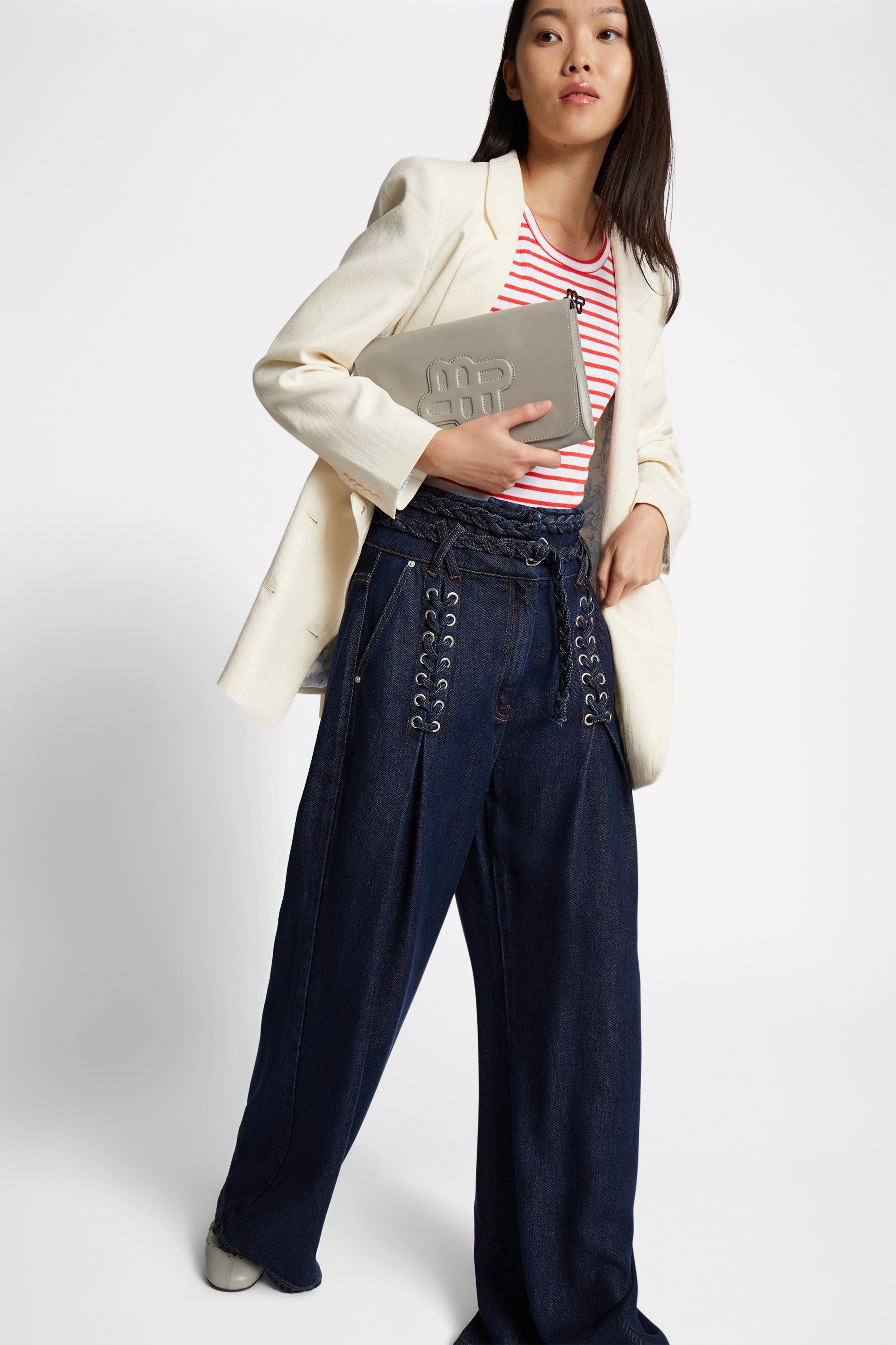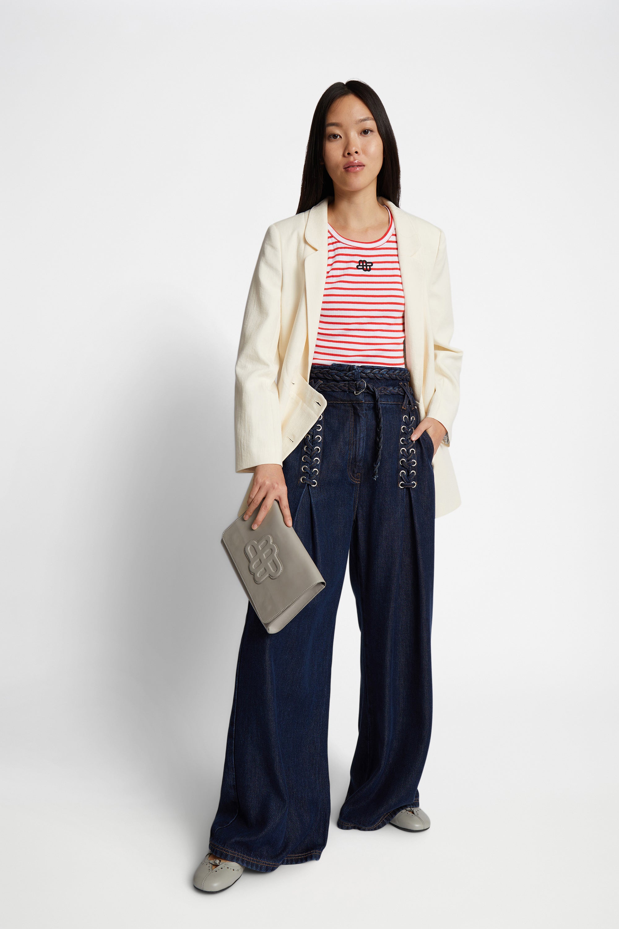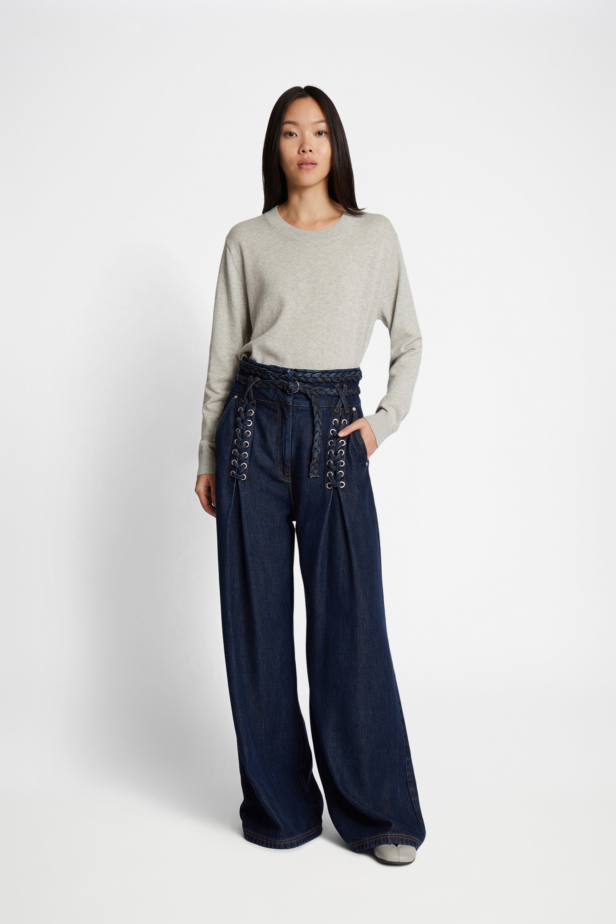 Jeans with a beautiful braided detail around the waist, and a tie string detail down the hips. These jeans are designed with a high waist, wide legs and side pockets.