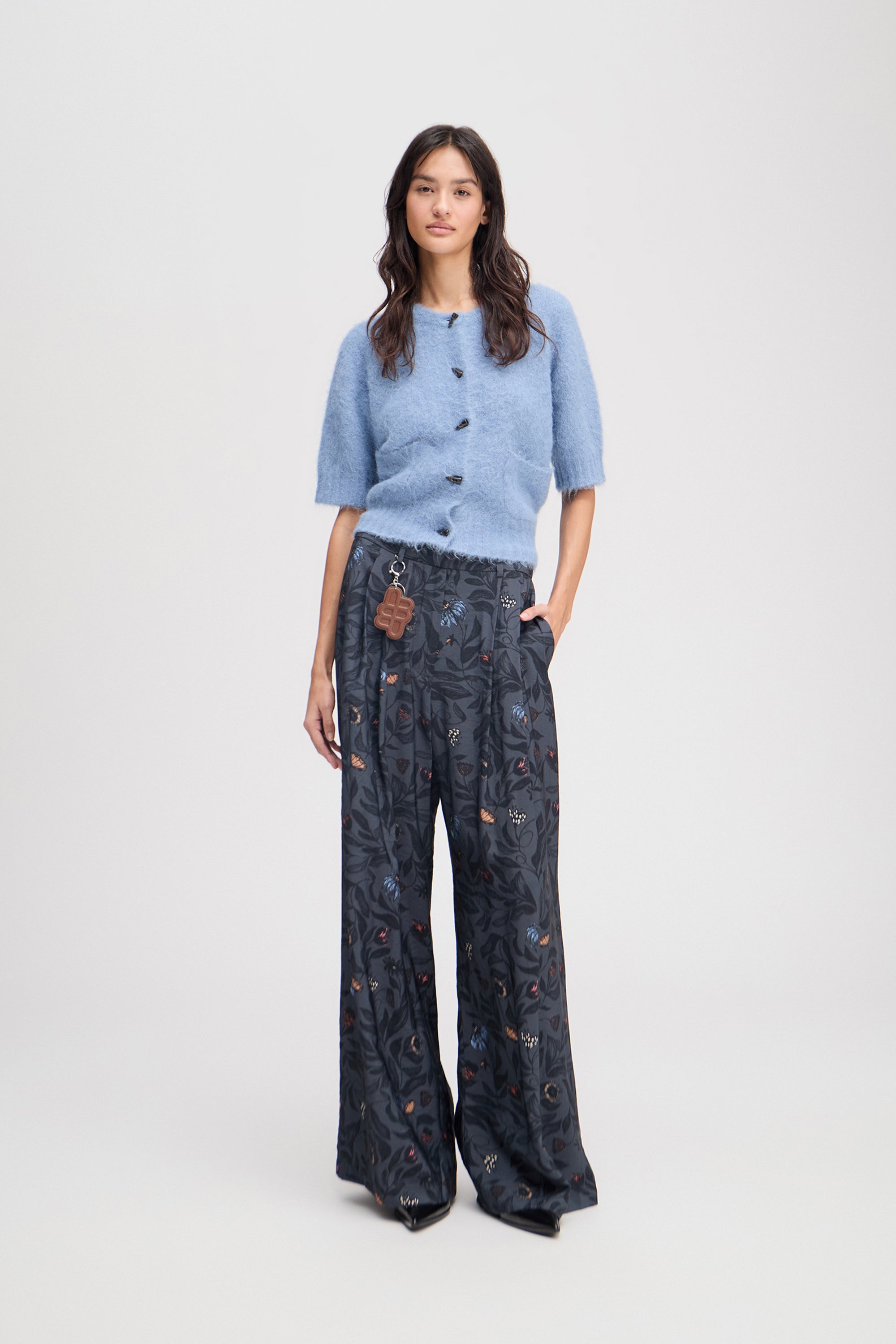 Trousers with a beautiful floral print, wide legs, and elegant details such as belt loops, pleats, and side pockets. The trousers have a zip closing.