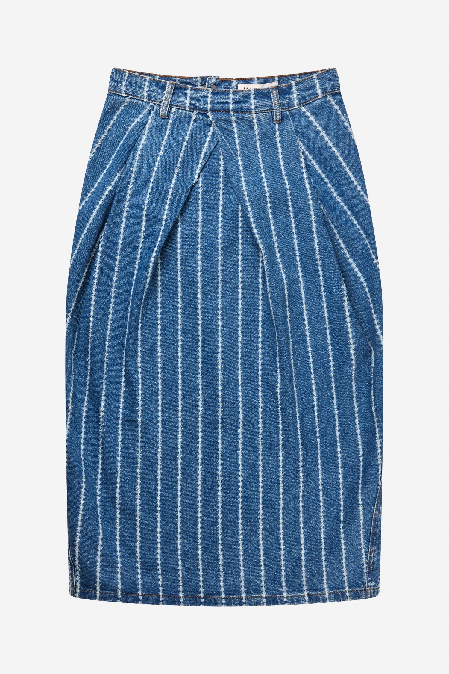 A beautiful pinstriped denim skirt, with wide sculptural pleats at the front. This skirt has pockets, a zipper closure at the back, and is designed for a regular fit.
