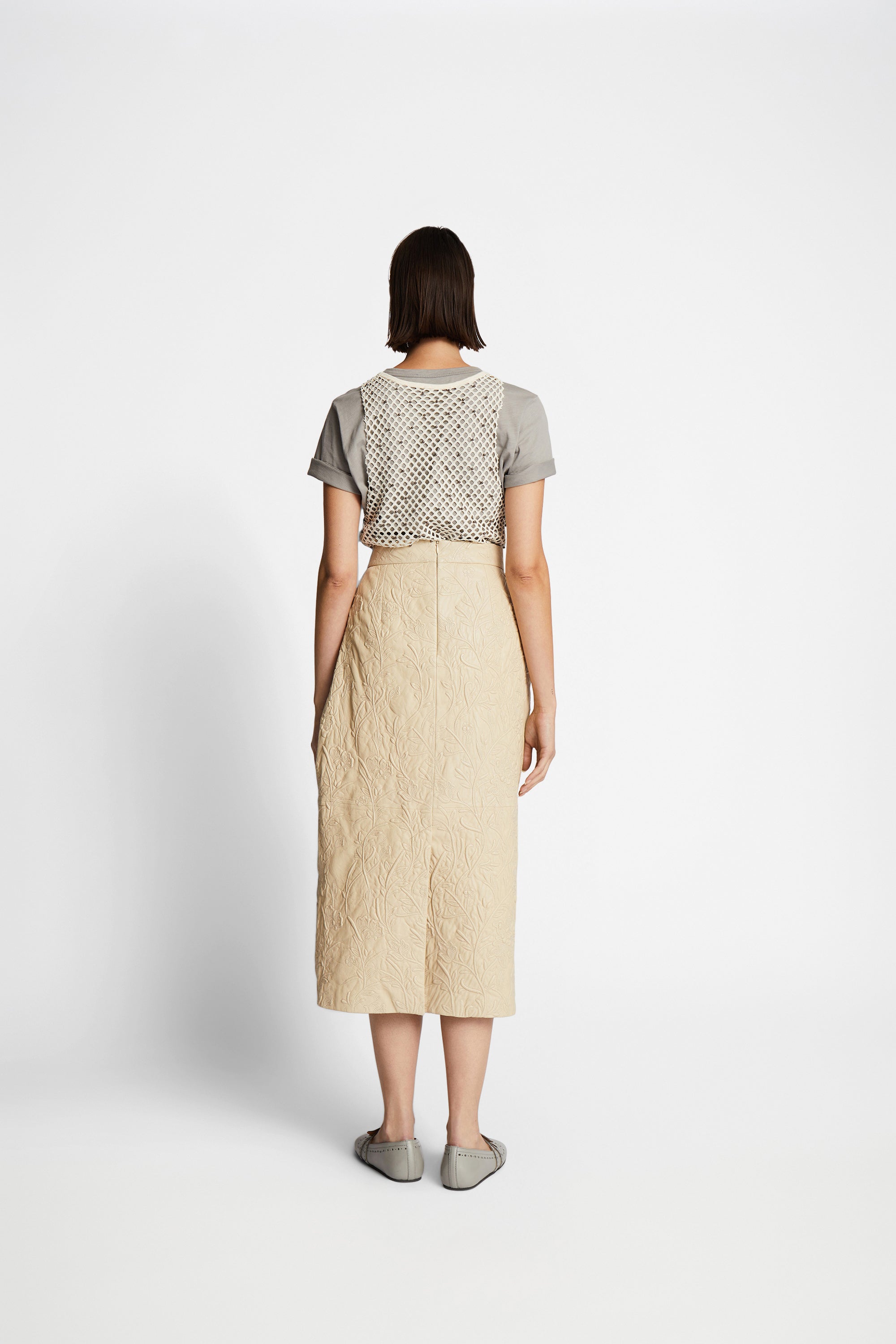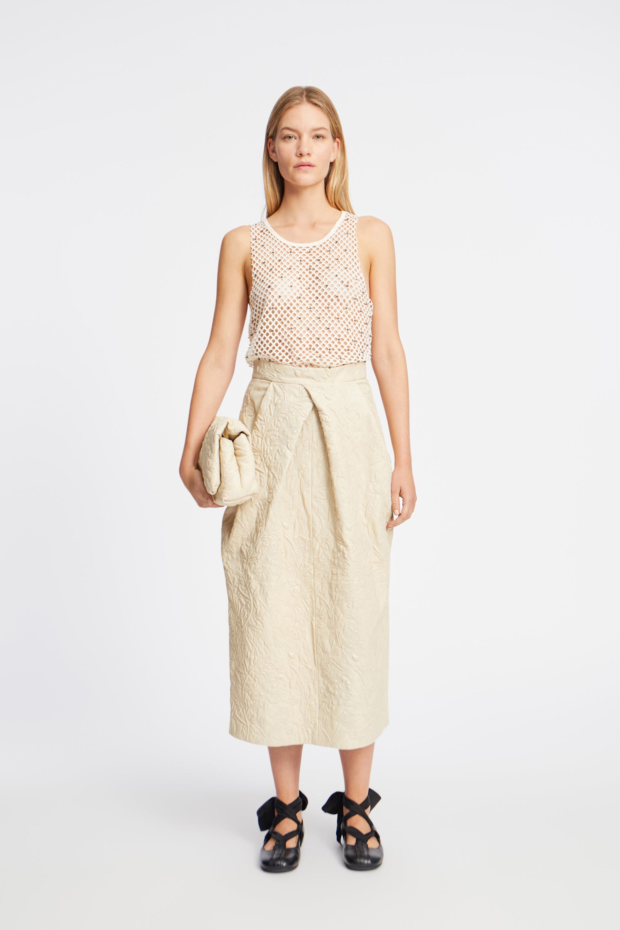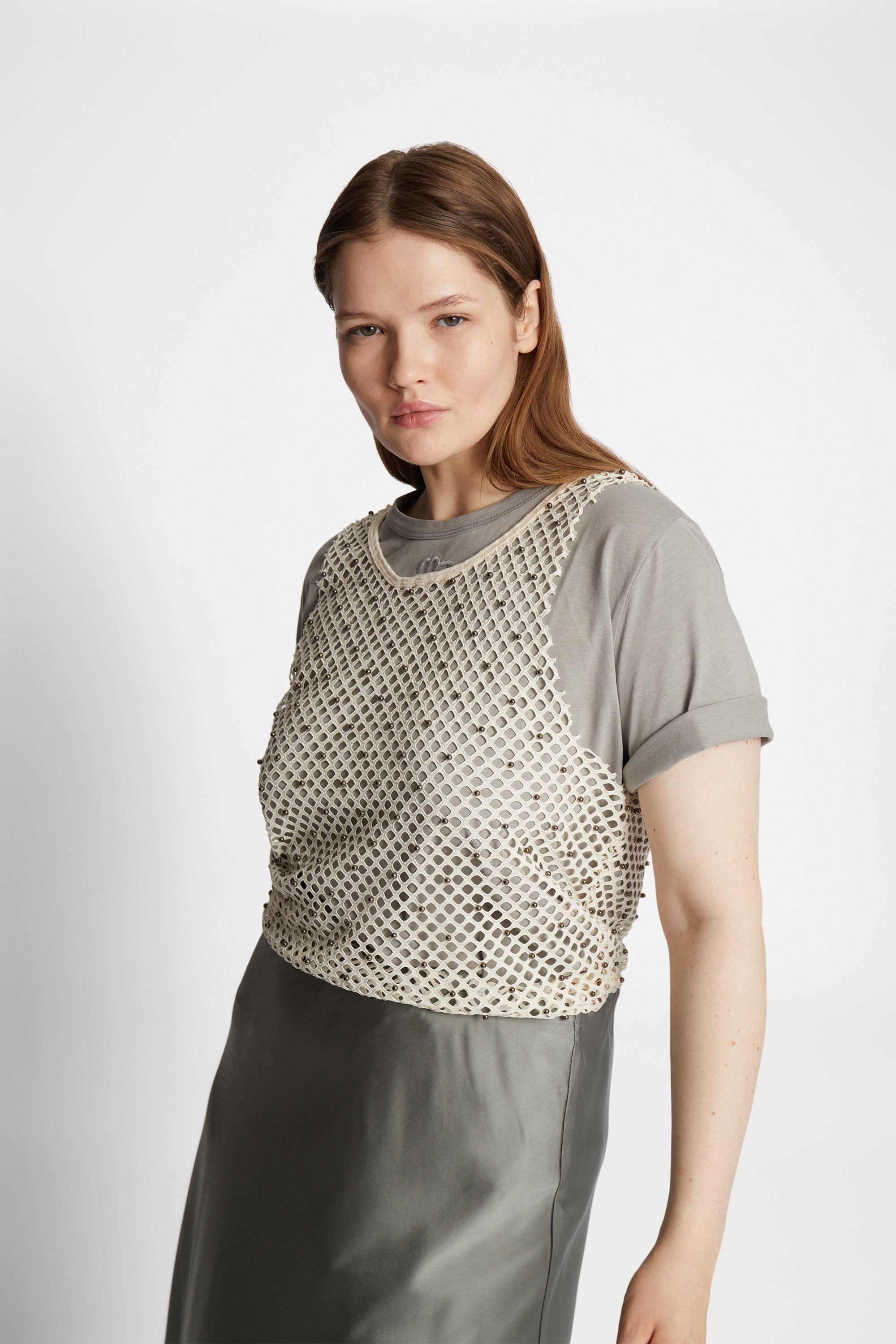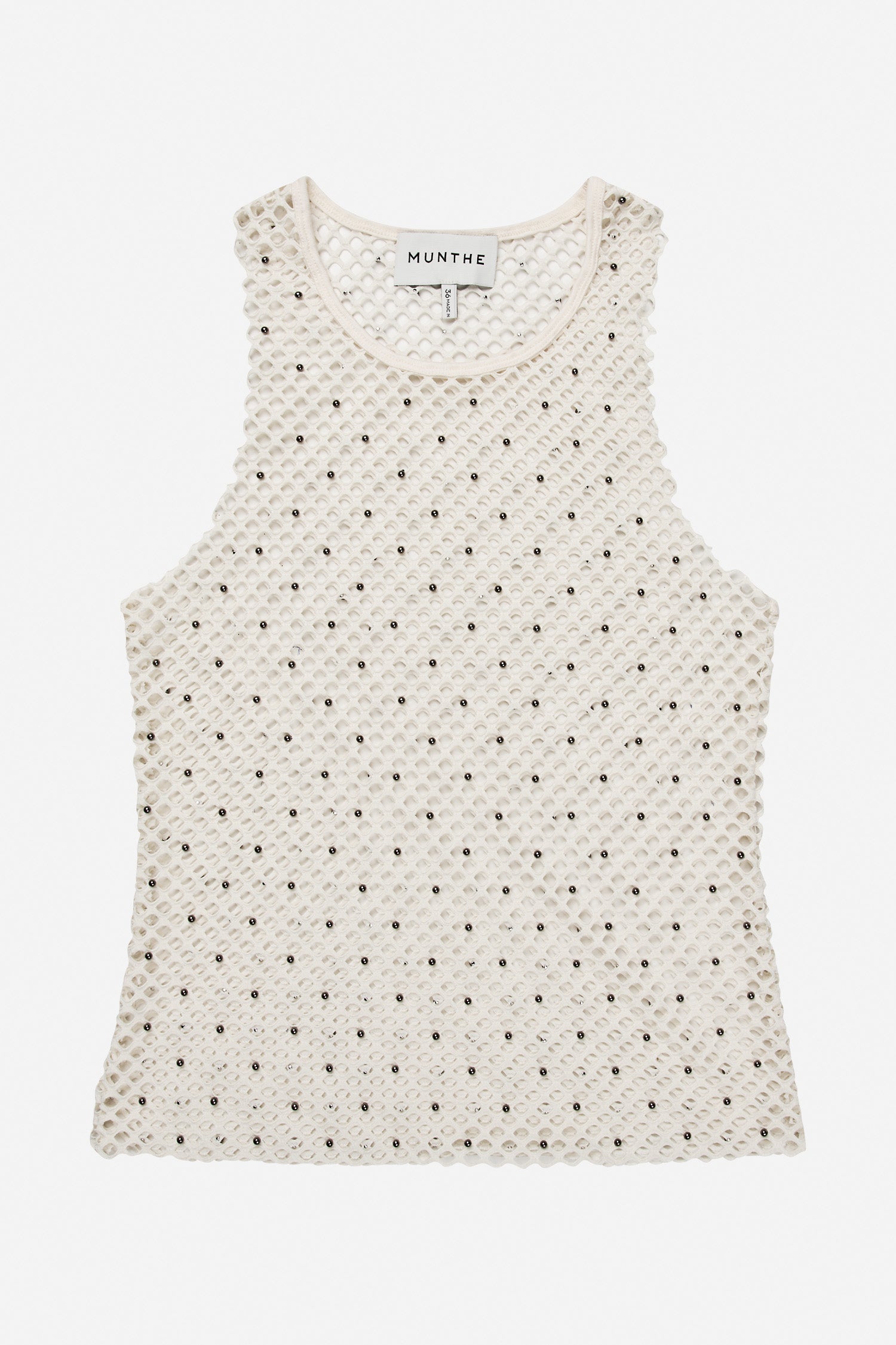 A soft fishnet tank top, elegantly decorated with beads. This tank top is designed with raw edges and a round neckline.