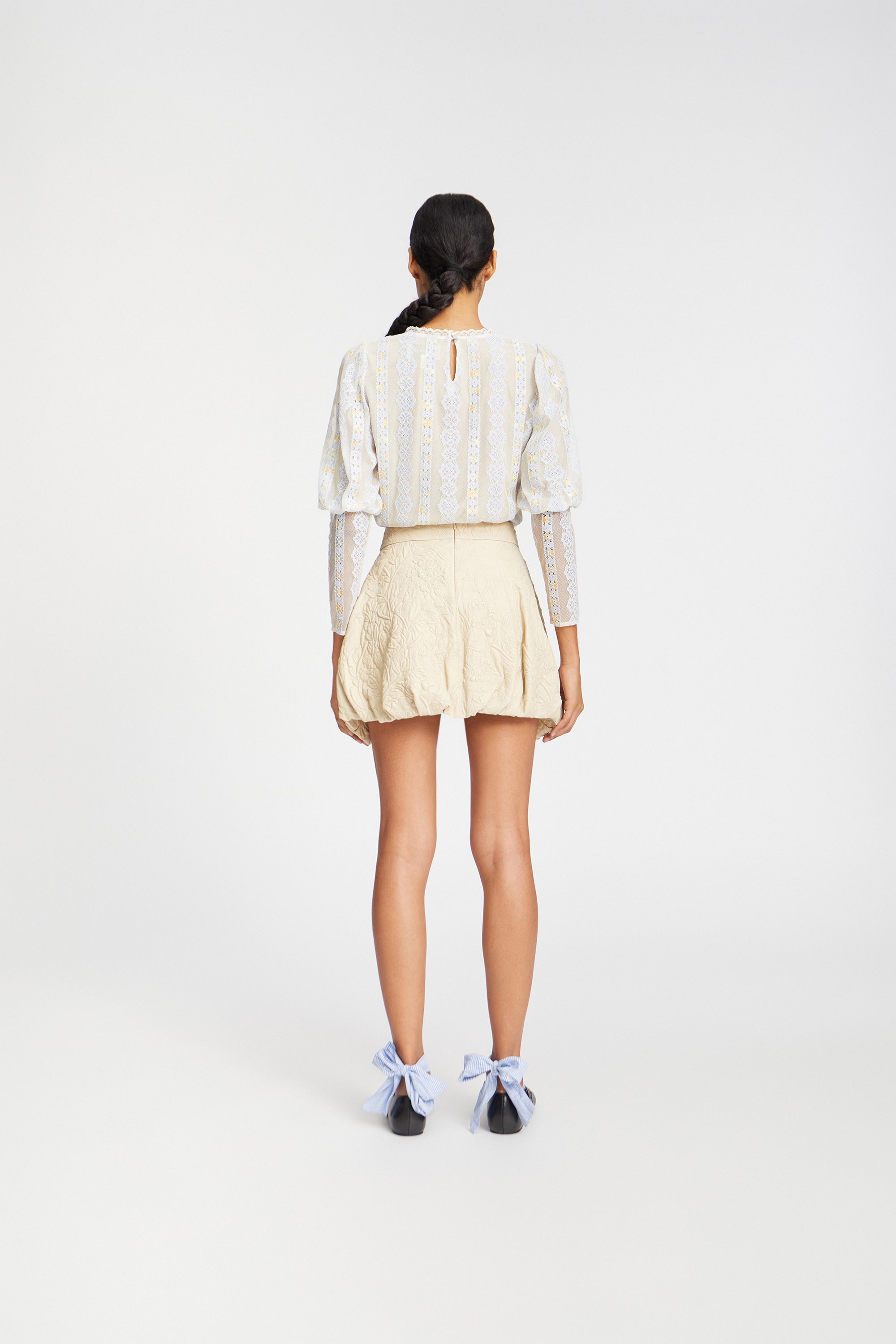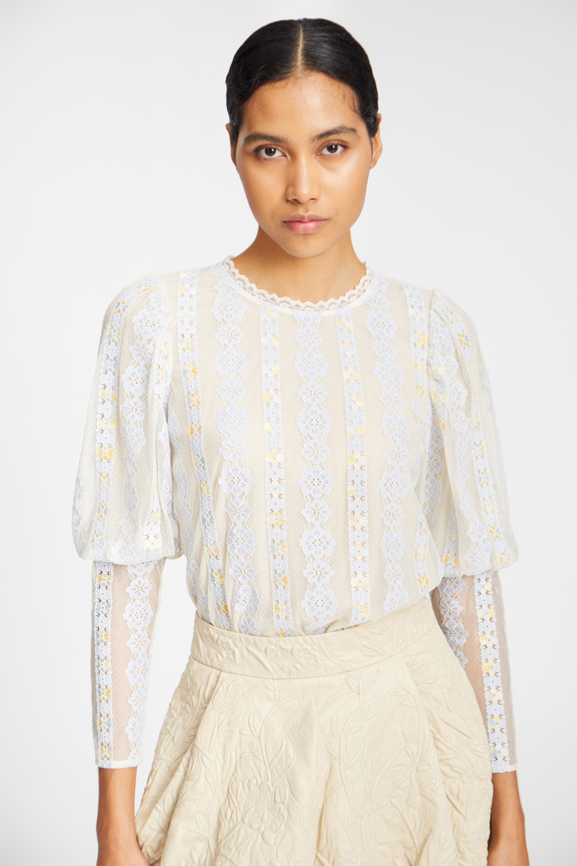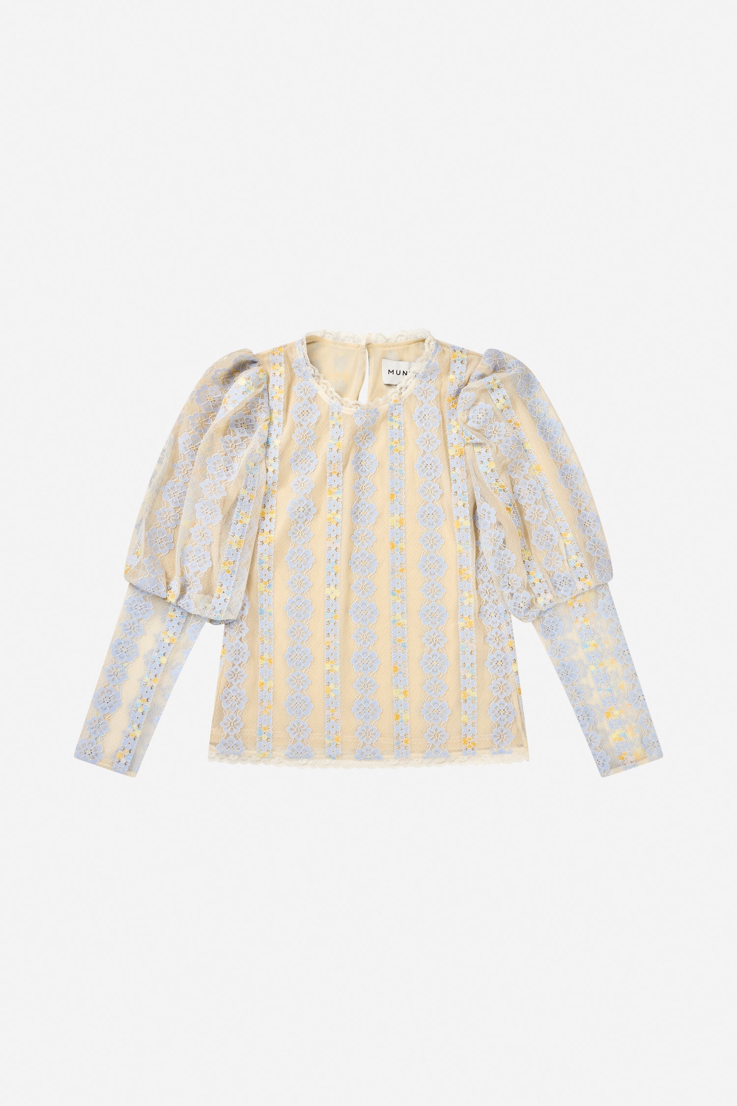 Blouse with a beautiful all-over flower lace. The blouse has sleeves with an elegant puff effect from shoulder to elbow and has a button closure on the back.