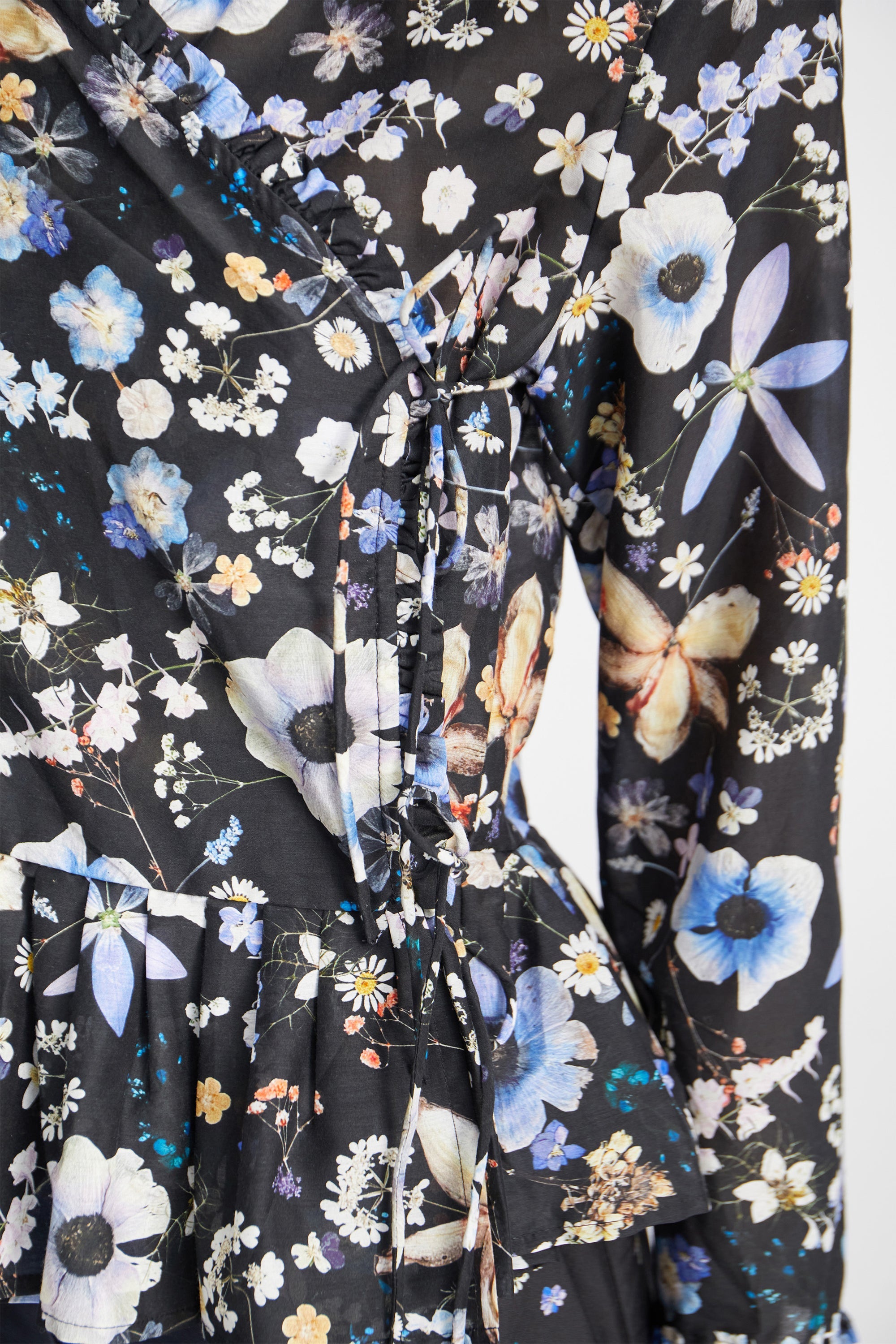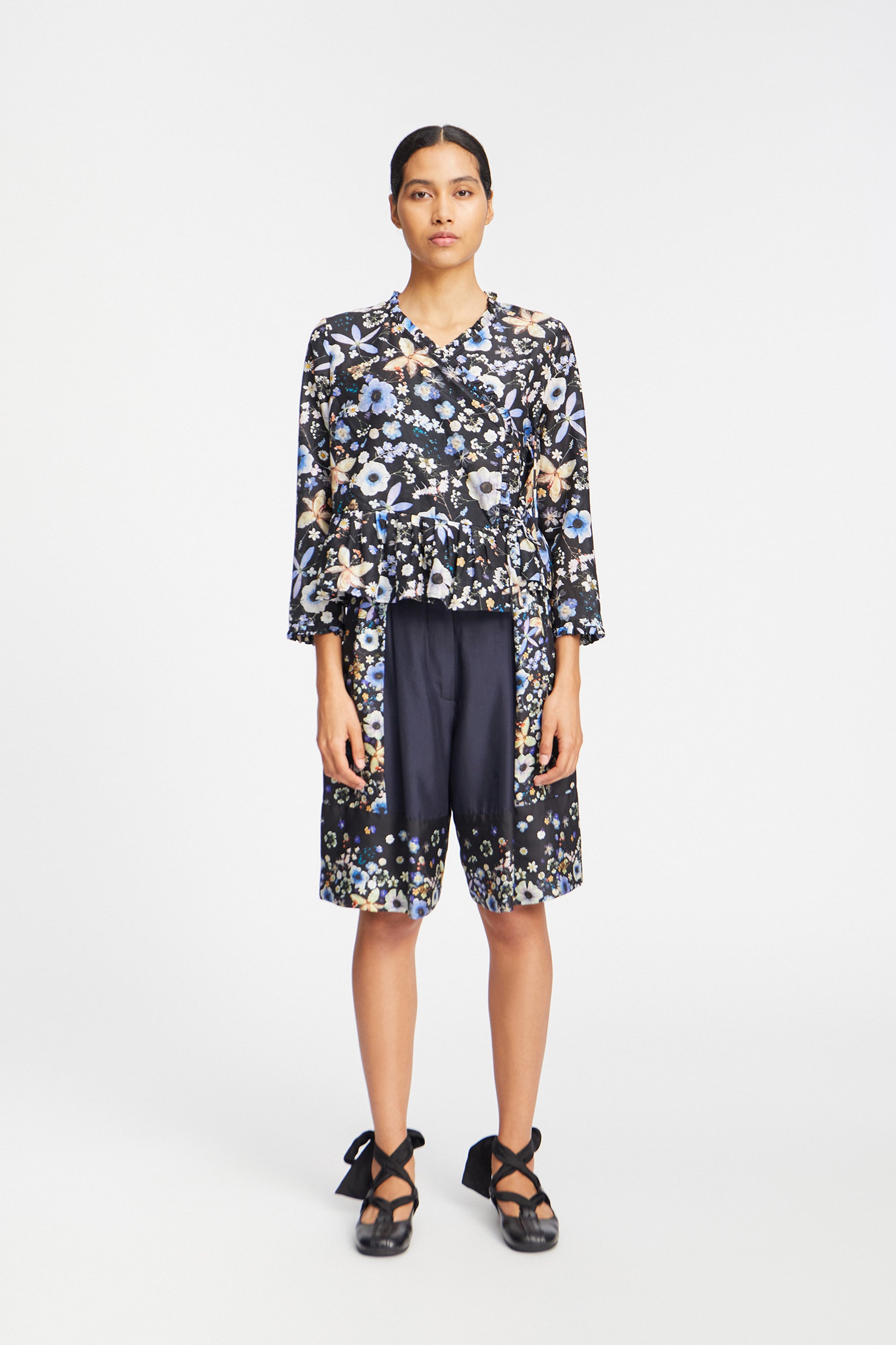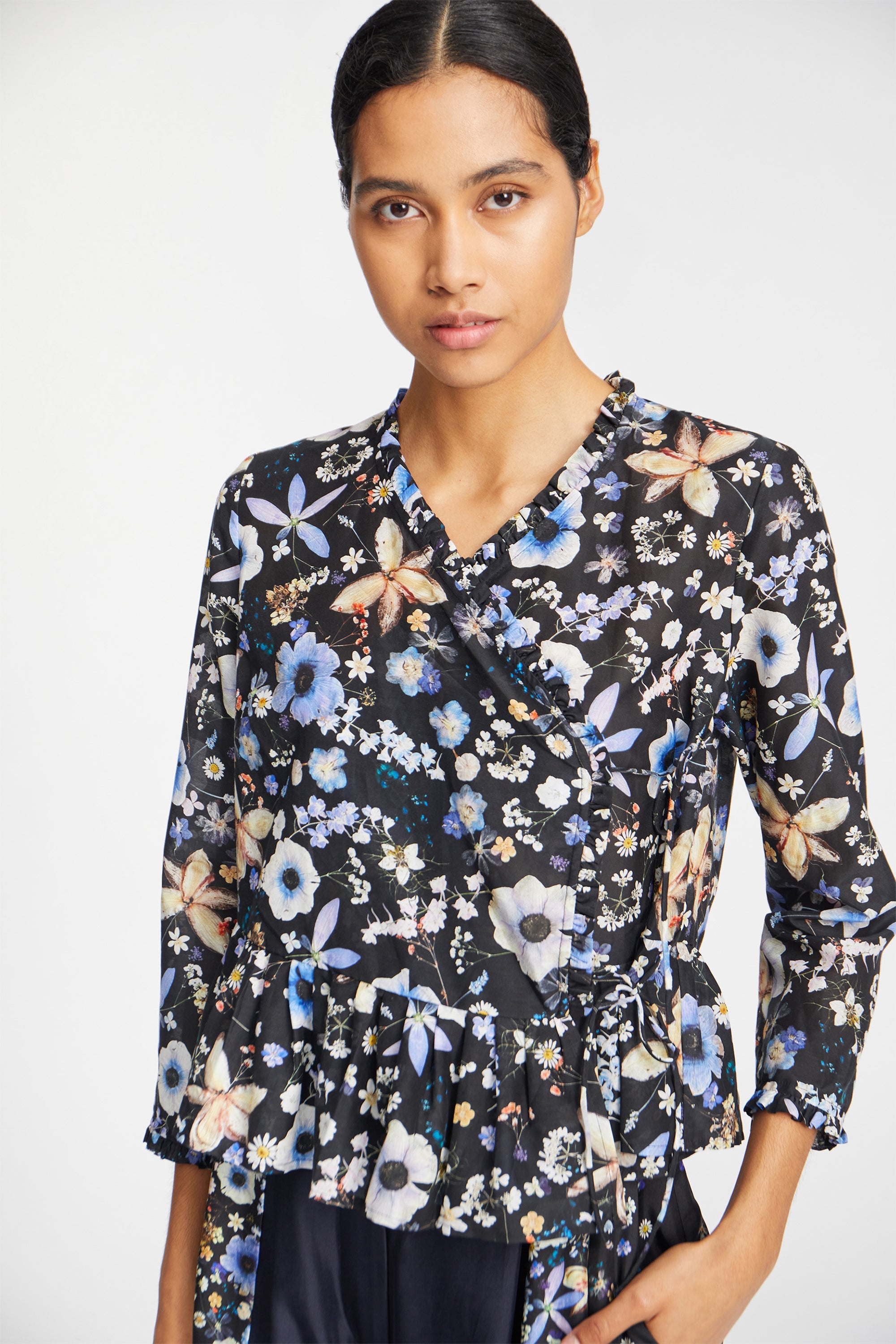 A beautiful wrap blouse featuring an elegant print, made from flowers Naja Munthe planted in her own garden. The shirt has beautiful, detailed edges and an elegant string closing. The blouse is designed with a feminine peplum bottom and is made from a soft silk blend.