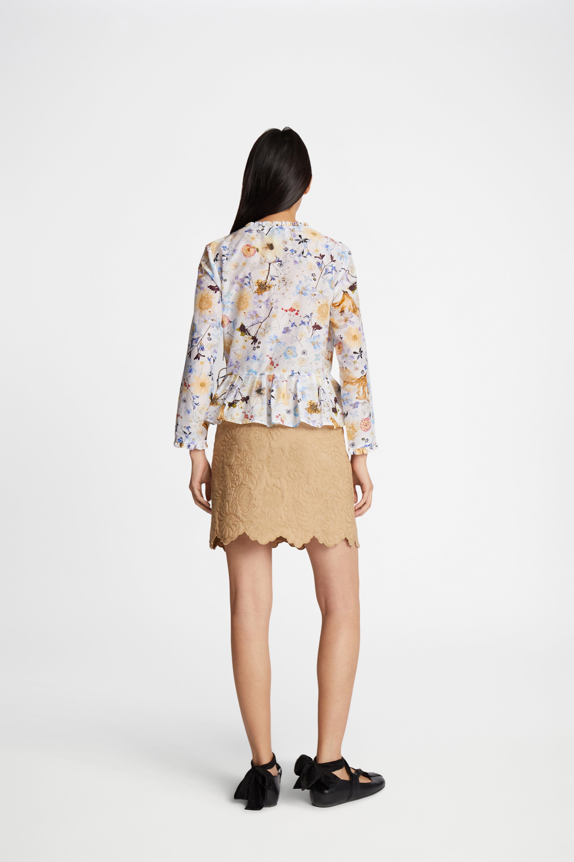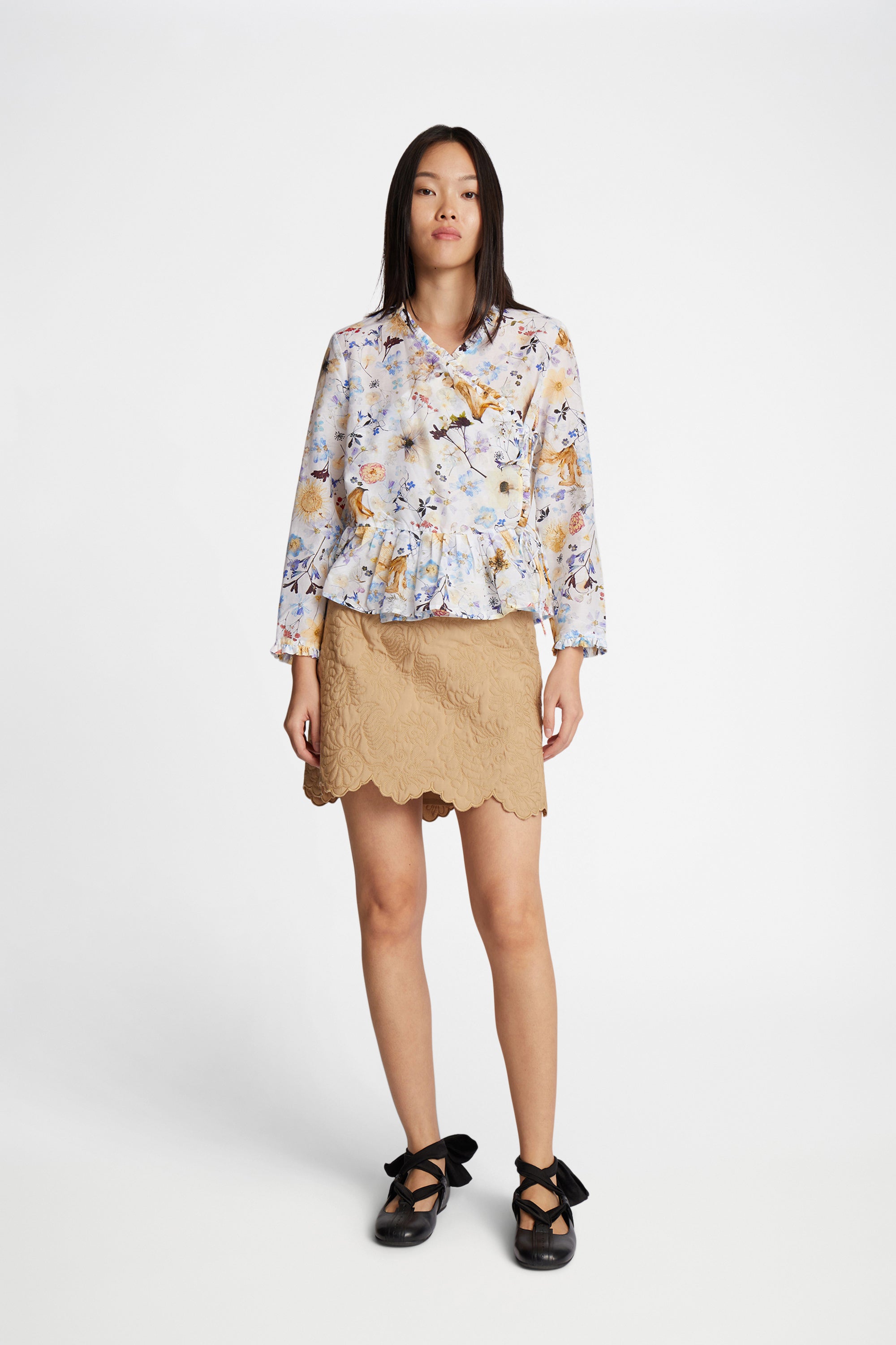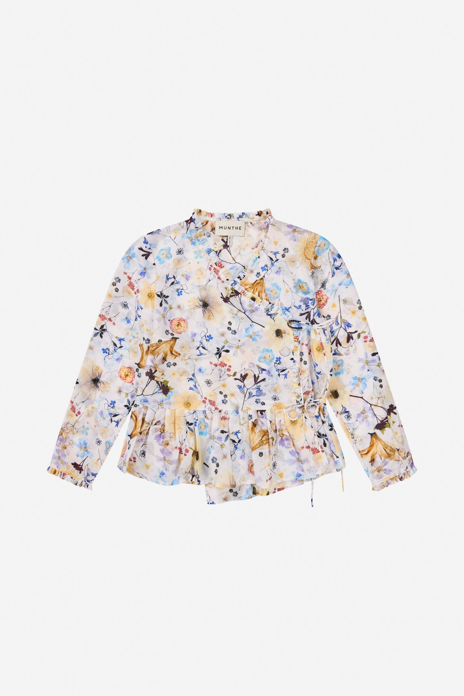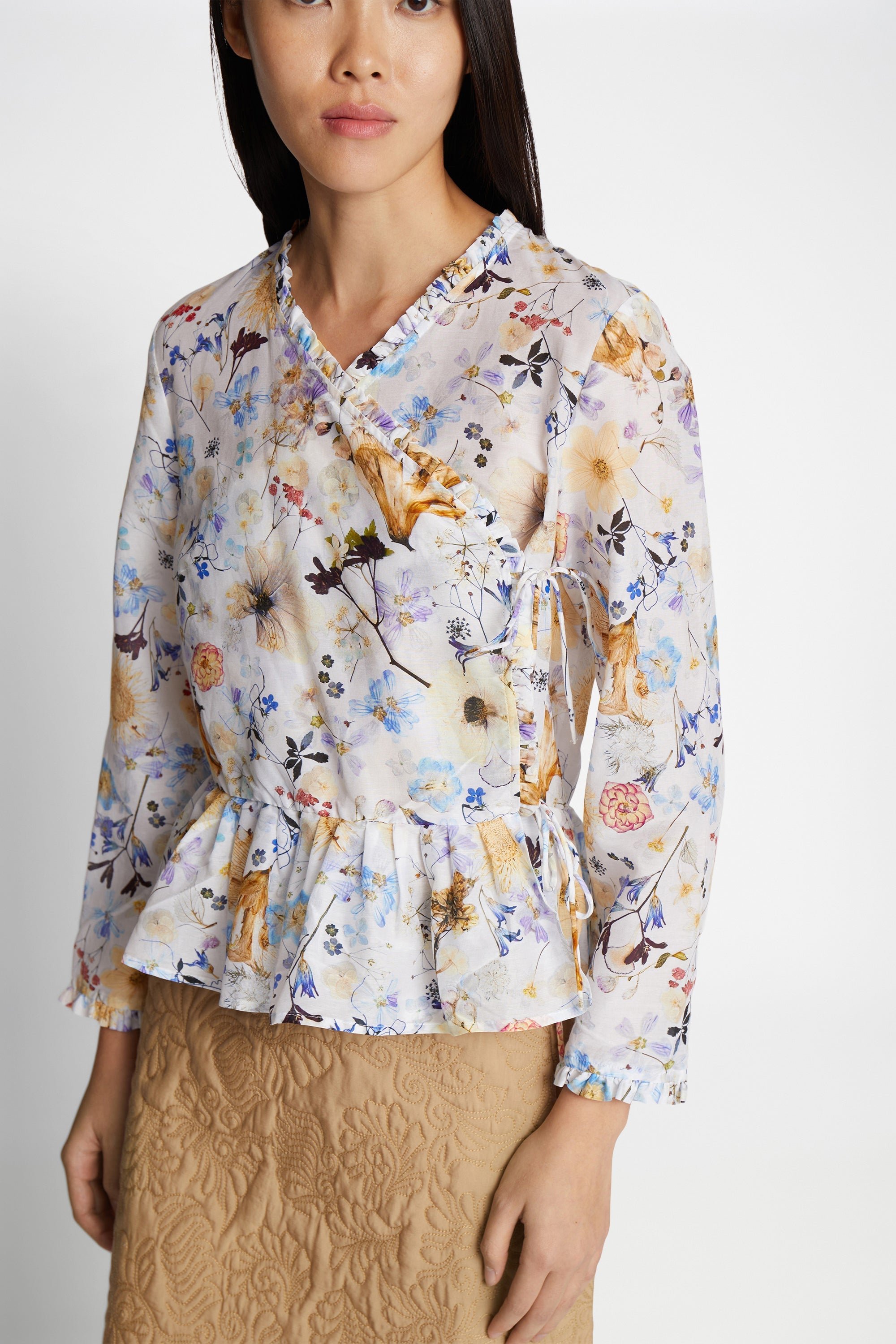 A beautiful wrap blouse featuring an elegant print, made from flowers Naja Munthe planted in her own garden. The shirt has beautiful, detailed edges and an elegant string closing. The blouse is designed with a feminine peplum bottom and is made from a soft silk blend.