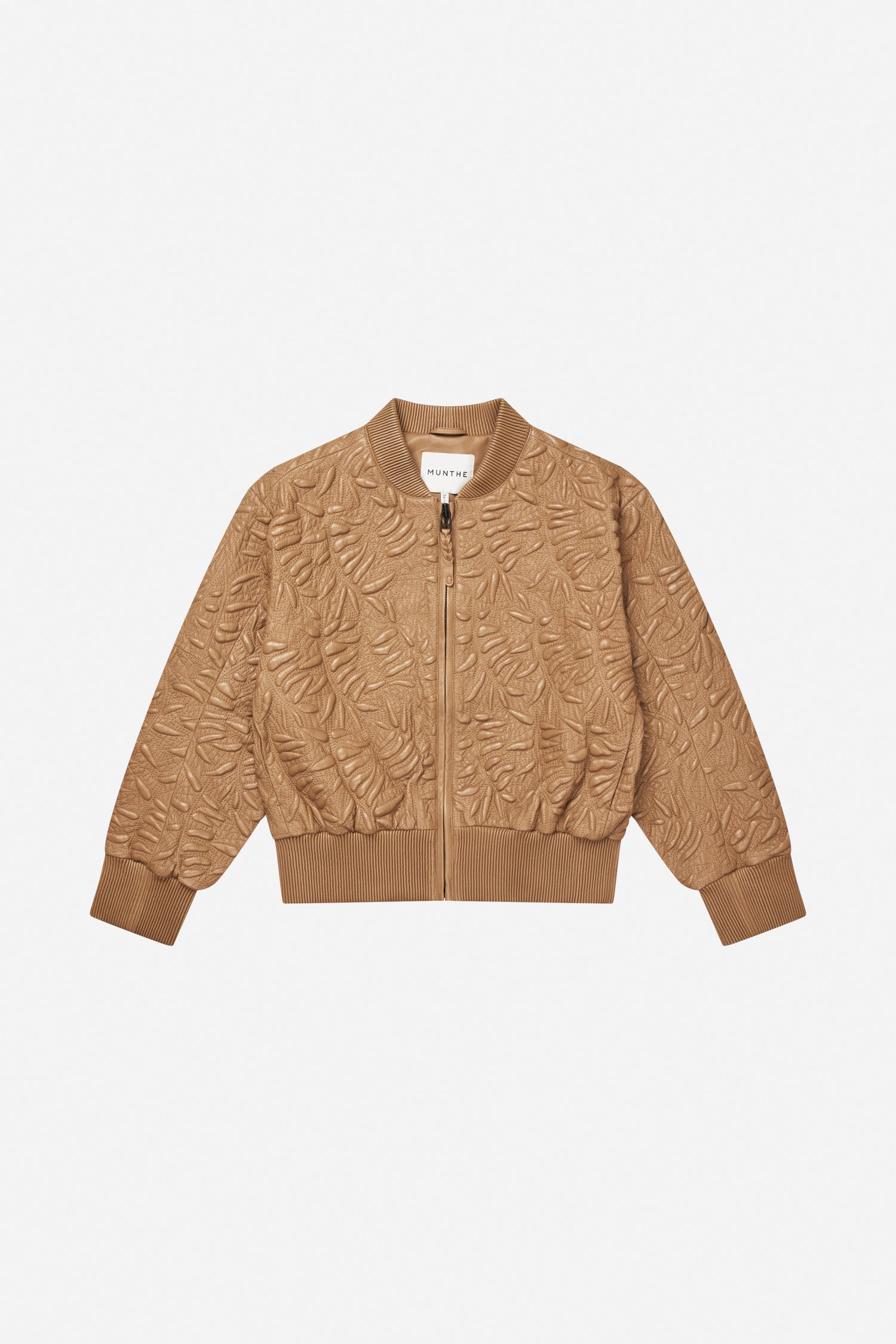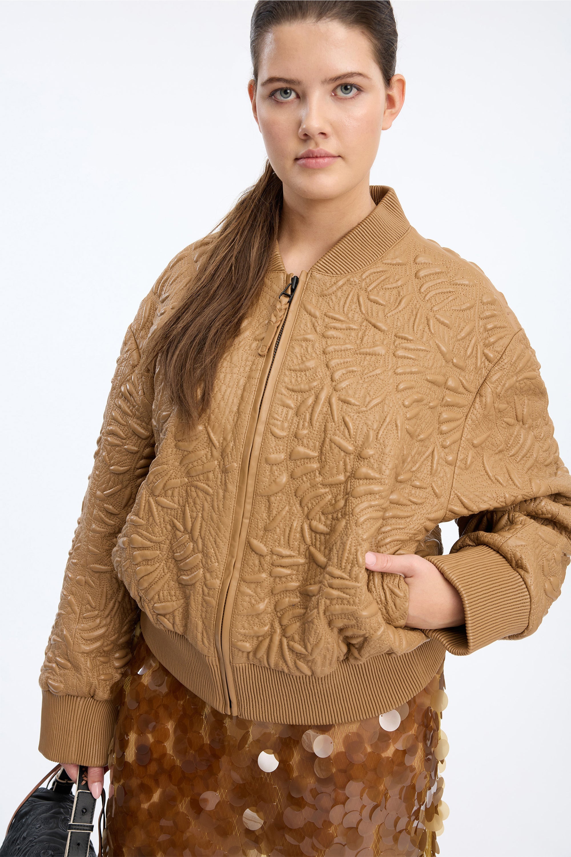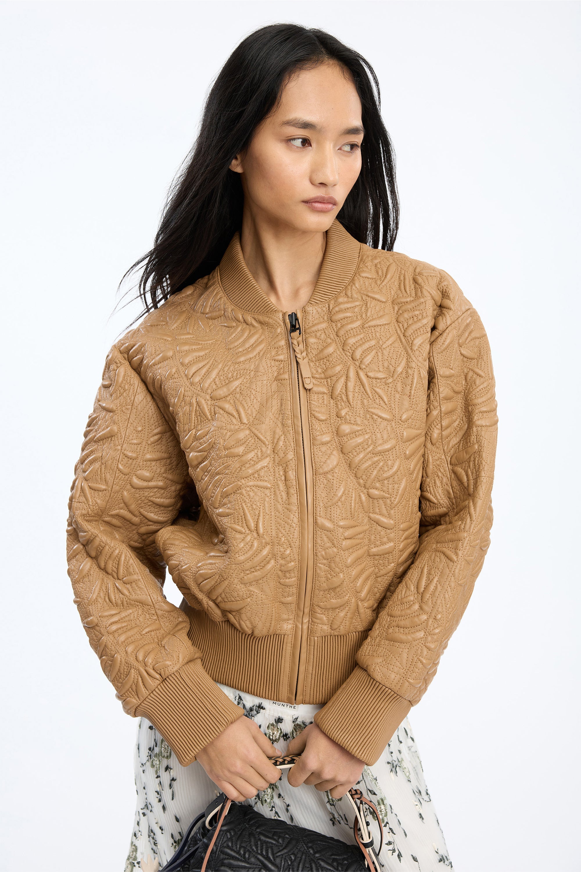 This jacket is crafted from soft leather and in a textured quality with a subtle leaf pattern. Designed in a bomber-inspired silhouette with ribbed trims and a front zip, offering a relaxed yet refined look.
