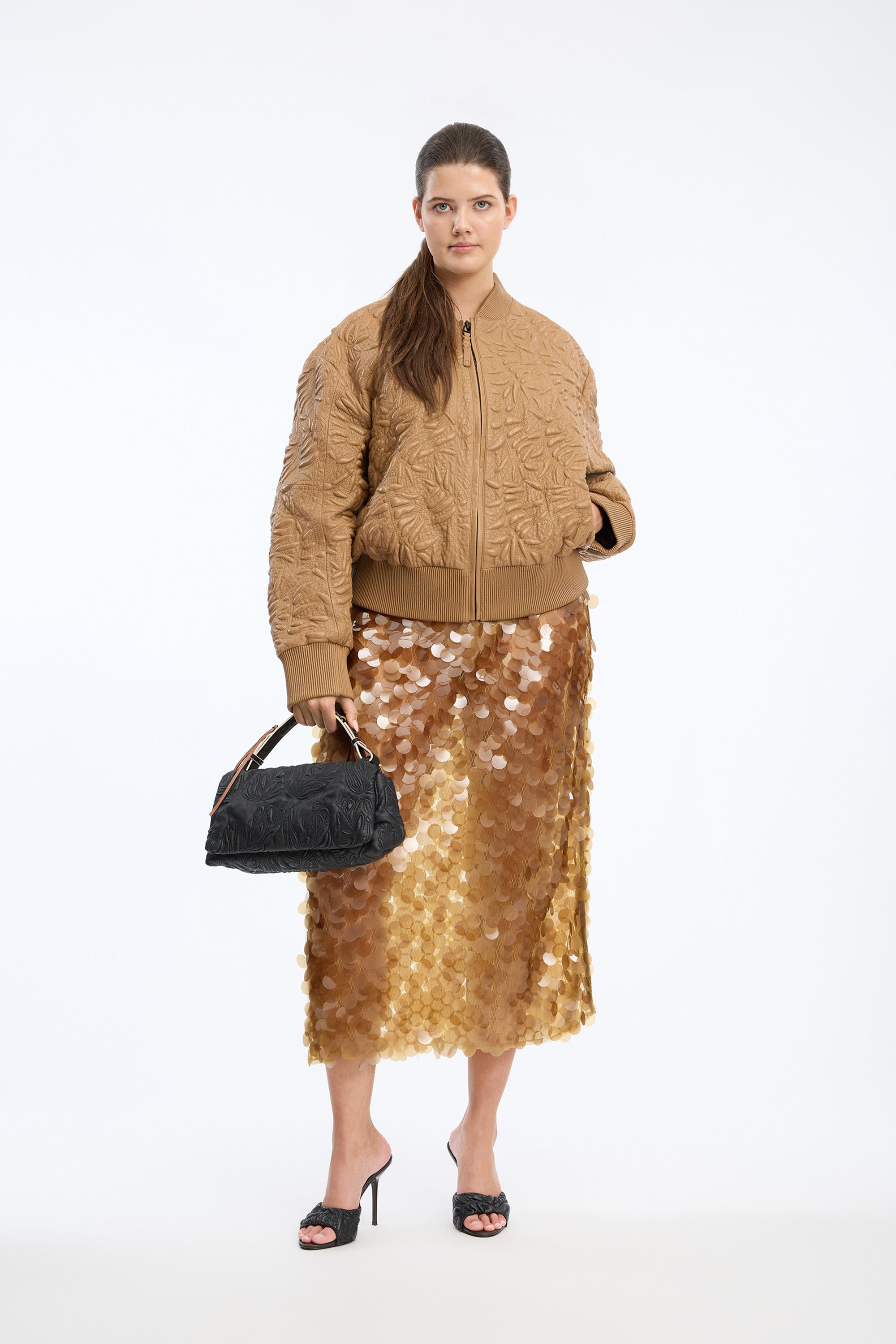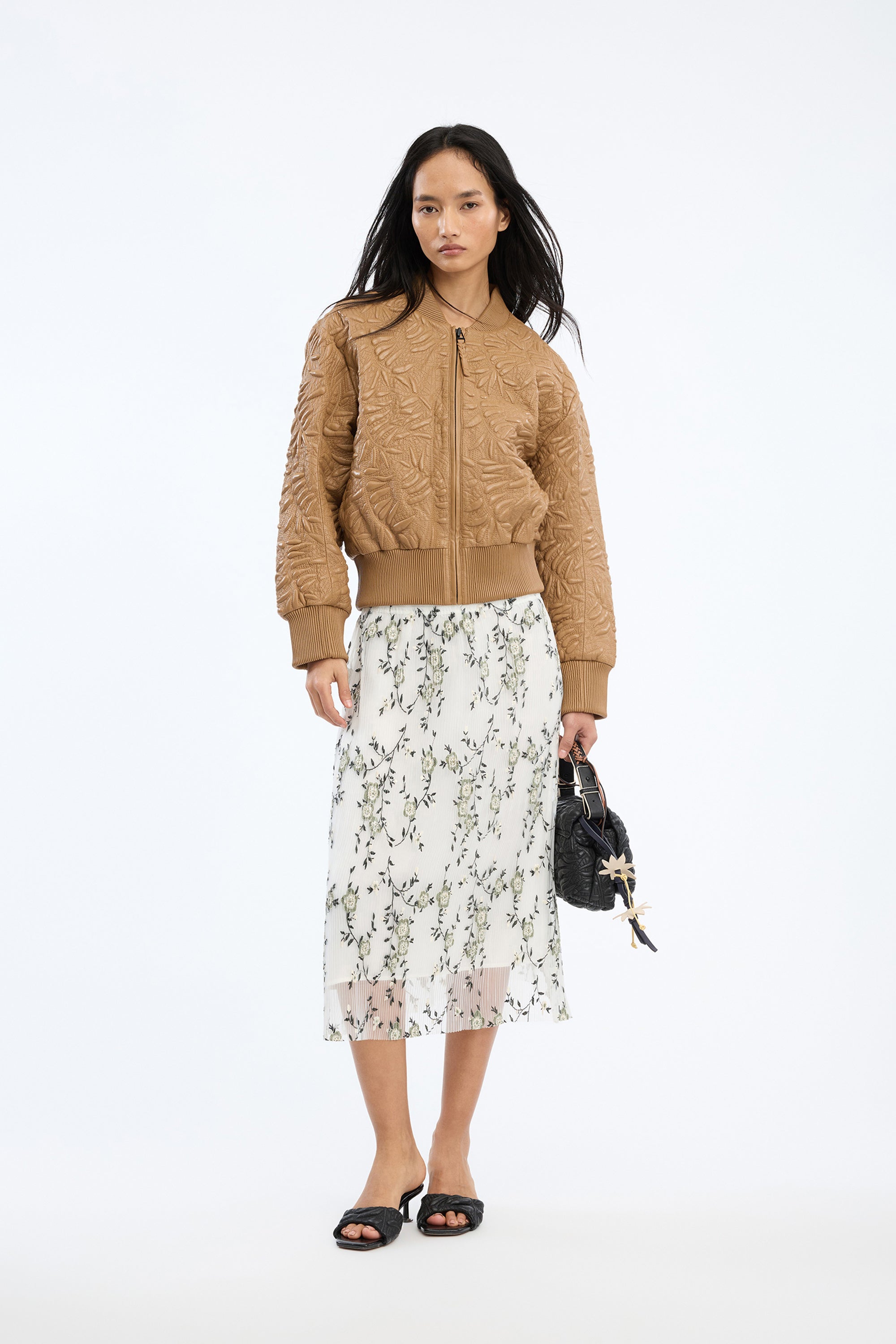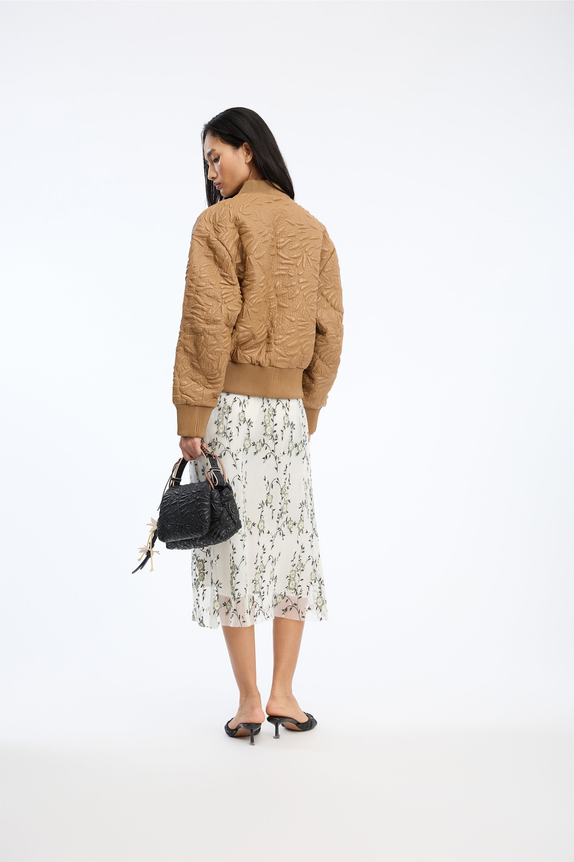 This jacket is crafted from soft leather and in a textured quality with a subtle leaf pattern. Designed in a bomber-inspired silhouette with ribbed trims and a front zip, offering a relaxed yet refined look.