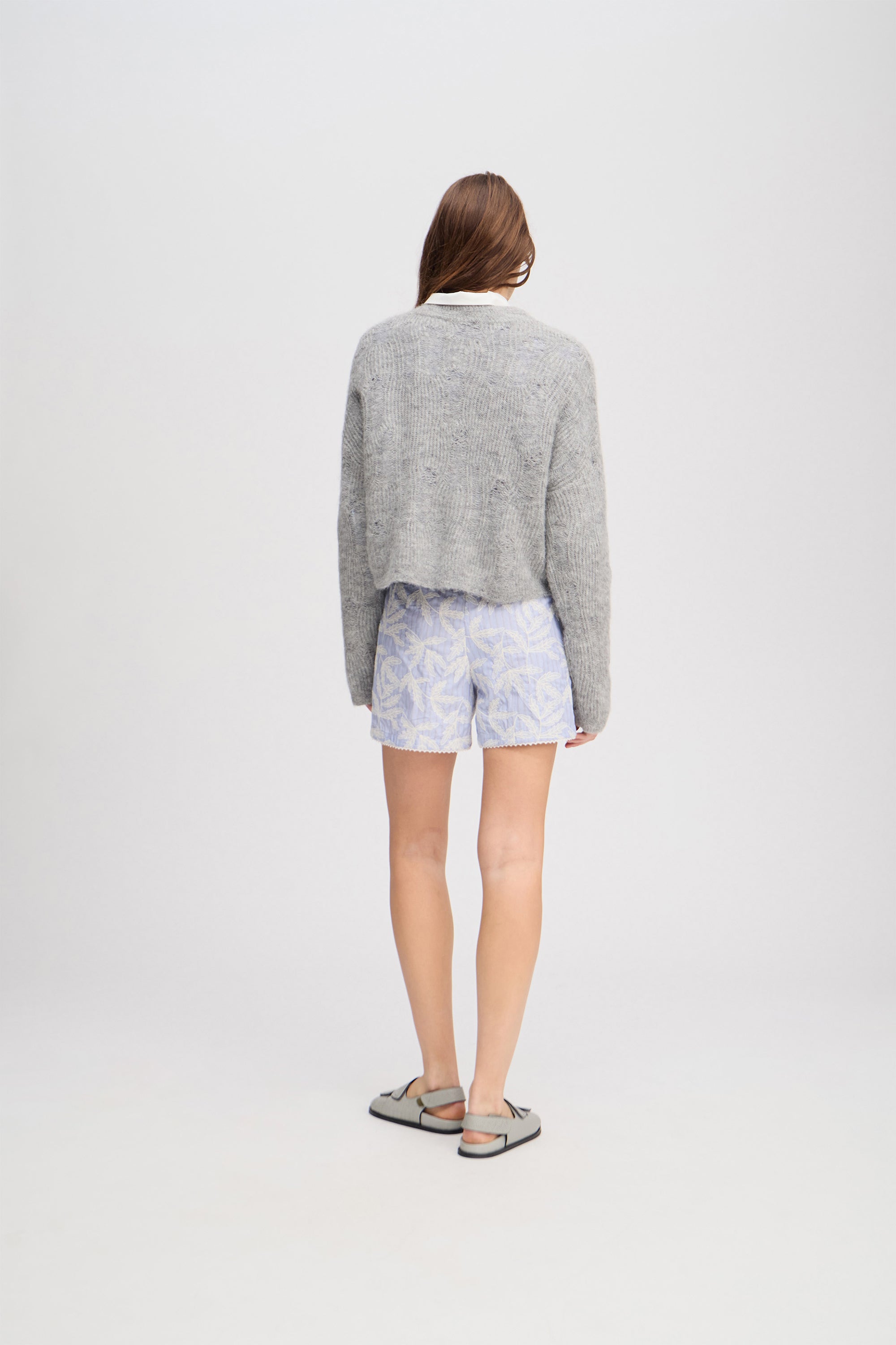 Soft knit with a discrete cable knit pattern. This knit is made from a wool blend, has long sleeves, and is designed for a loose fit.