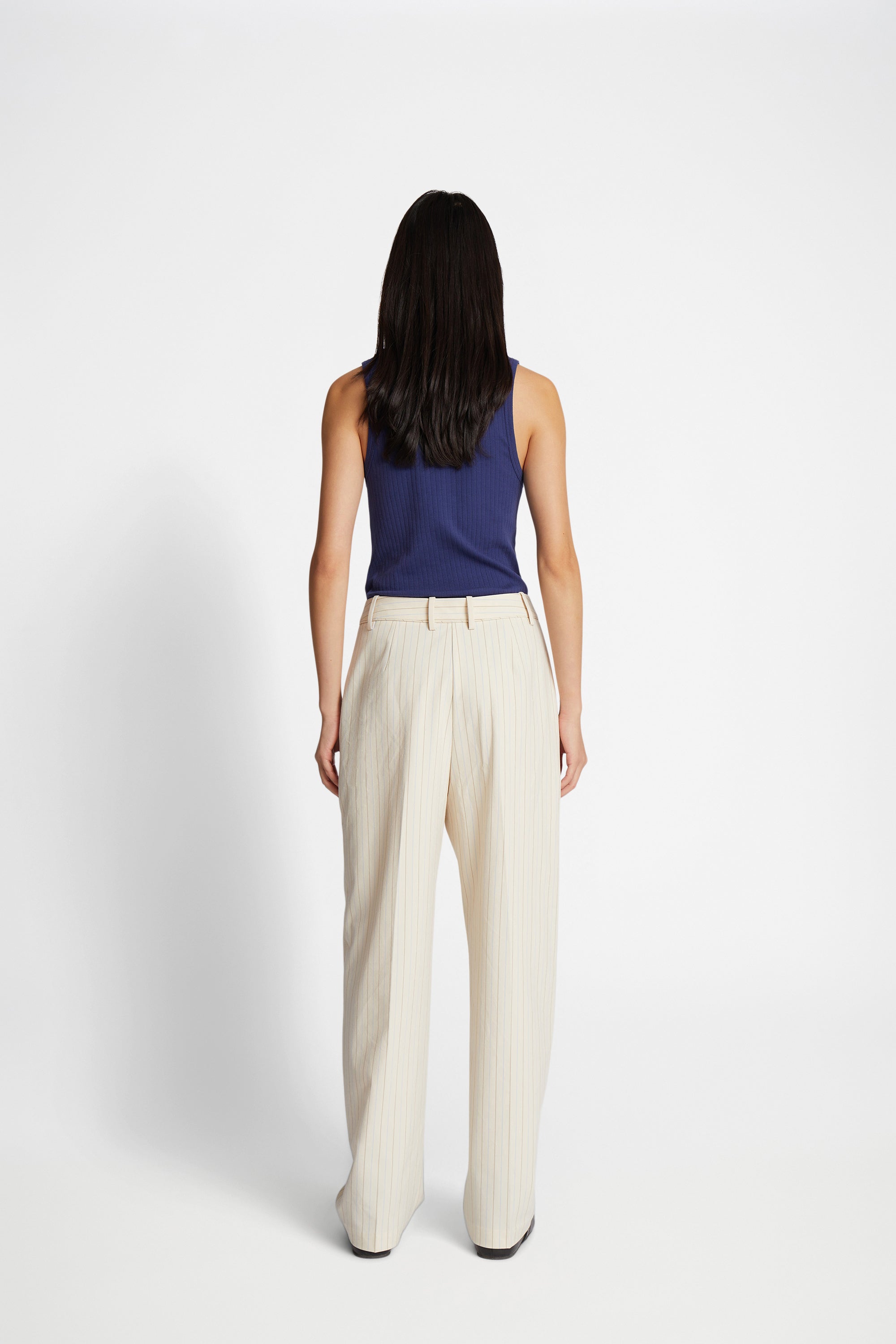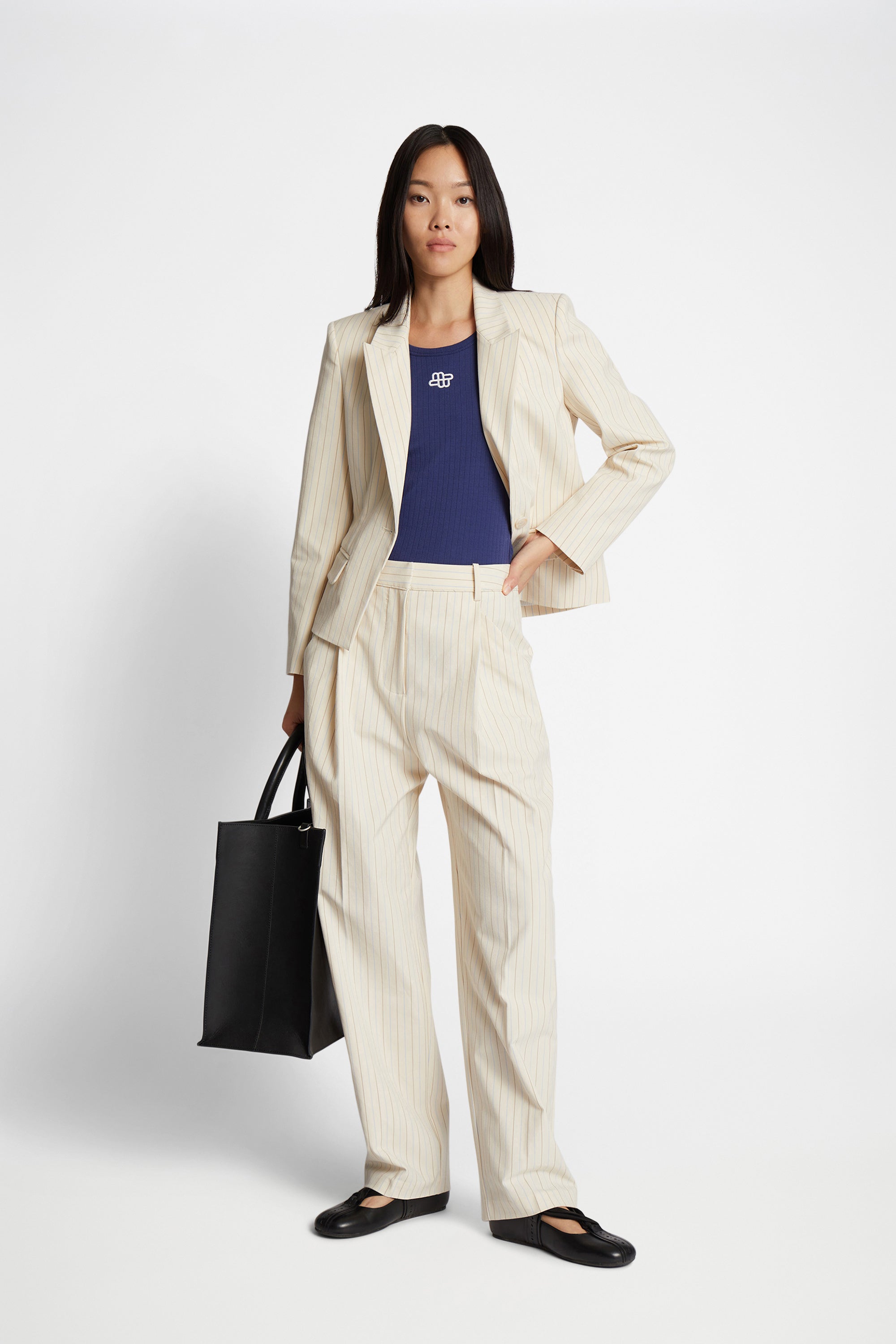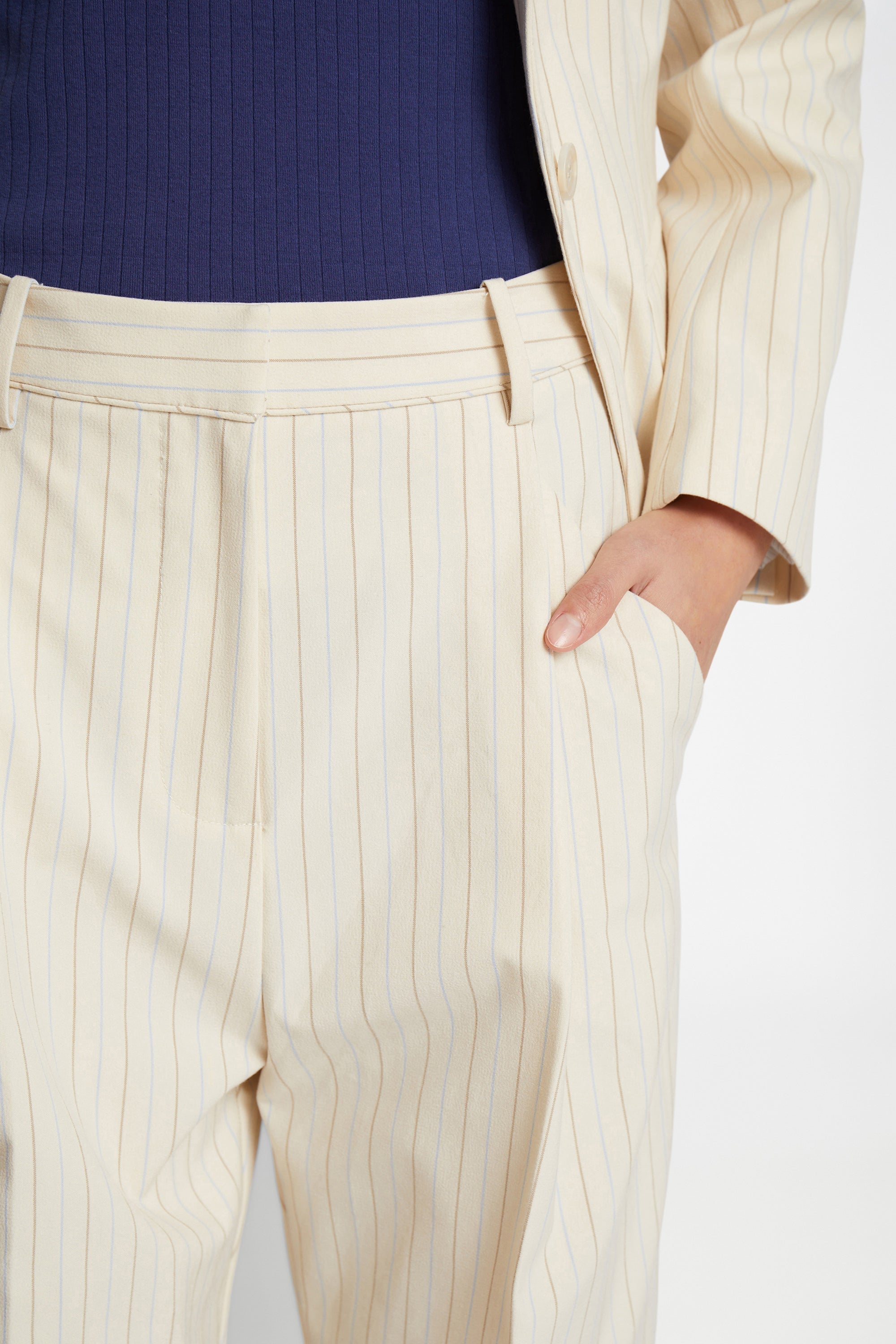 Beautiful pinstriped suit pants, with elegant details like press pleats and pockets on the sides. These pants have a zip closure at the front.