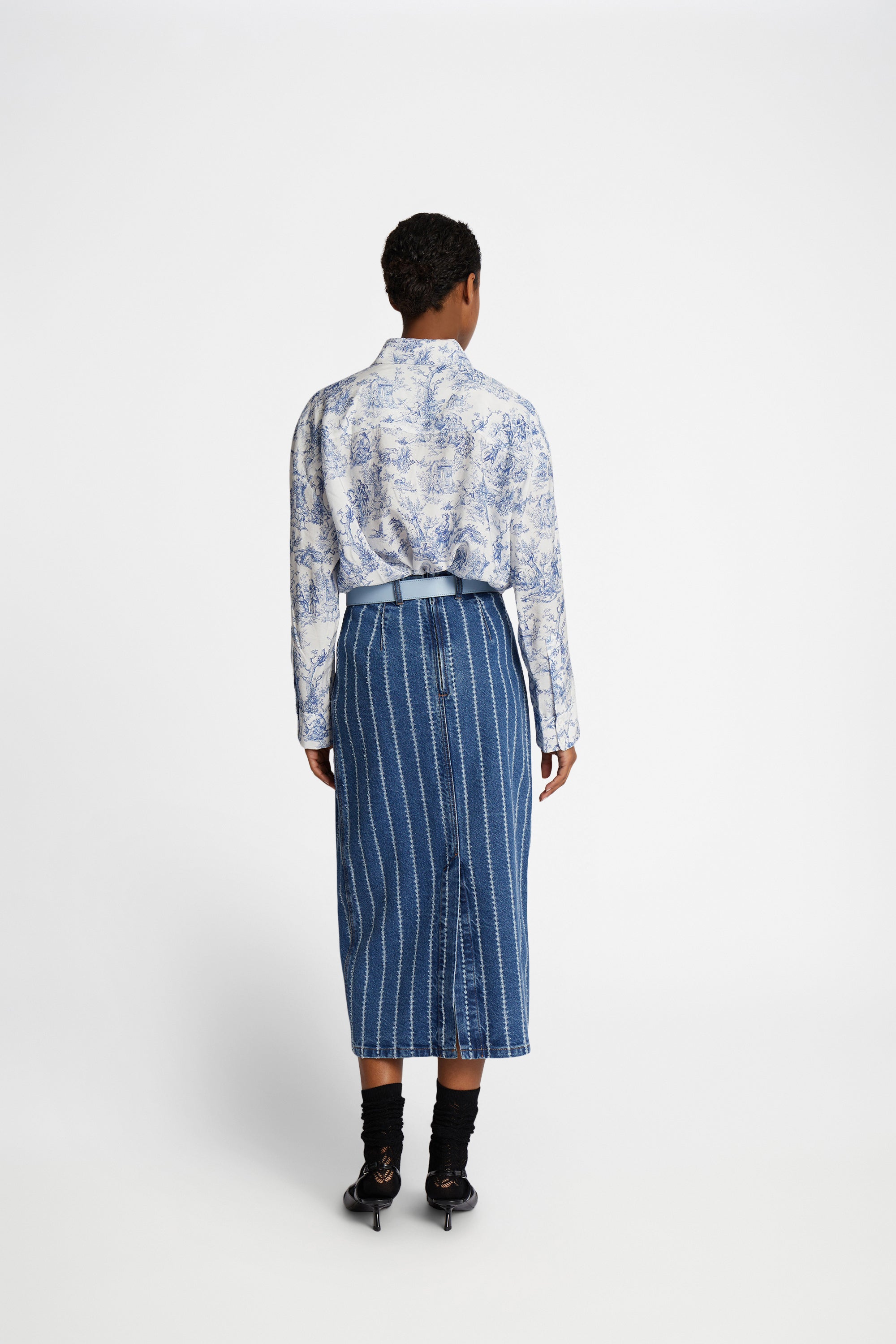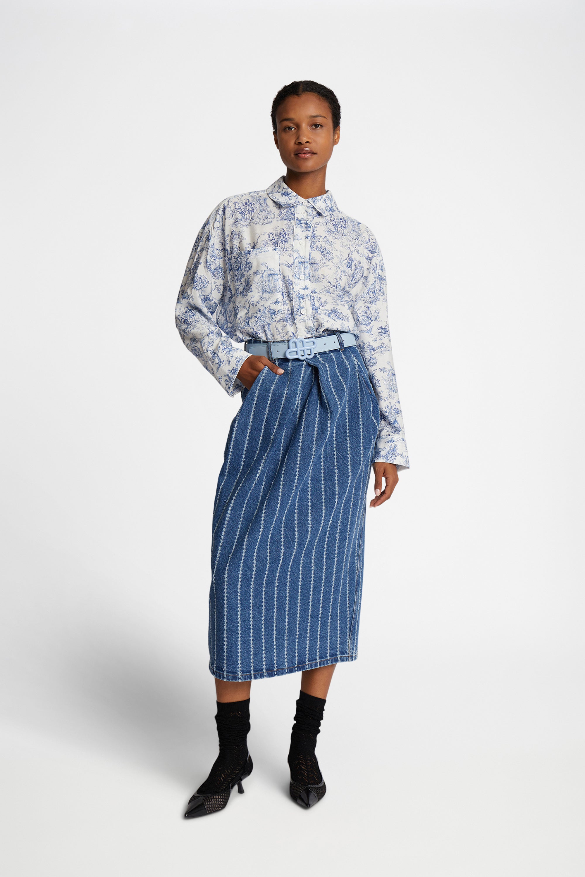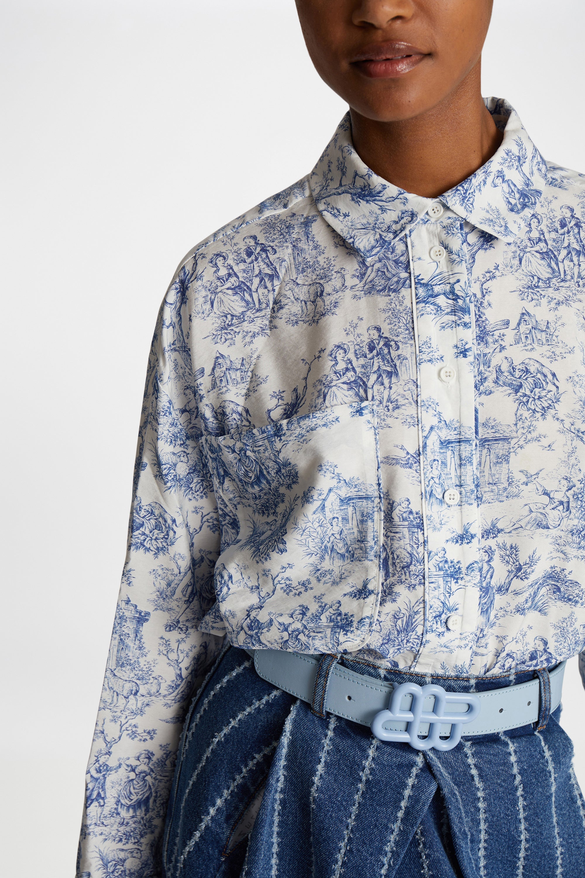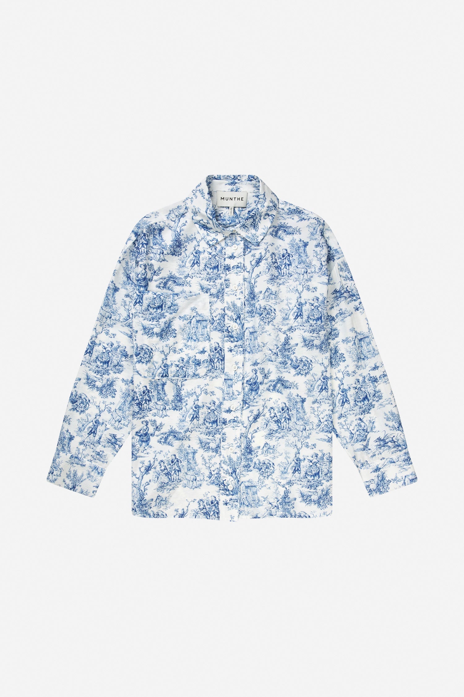 Shirt designed with an elegant print with elements of nostalgic charm. This shirt has a slightly oversize chest pocket, beautiful cuffs and a collar. The pocket and the button closure have a small, elegant border detail. The shirt is designed for a loose fit.