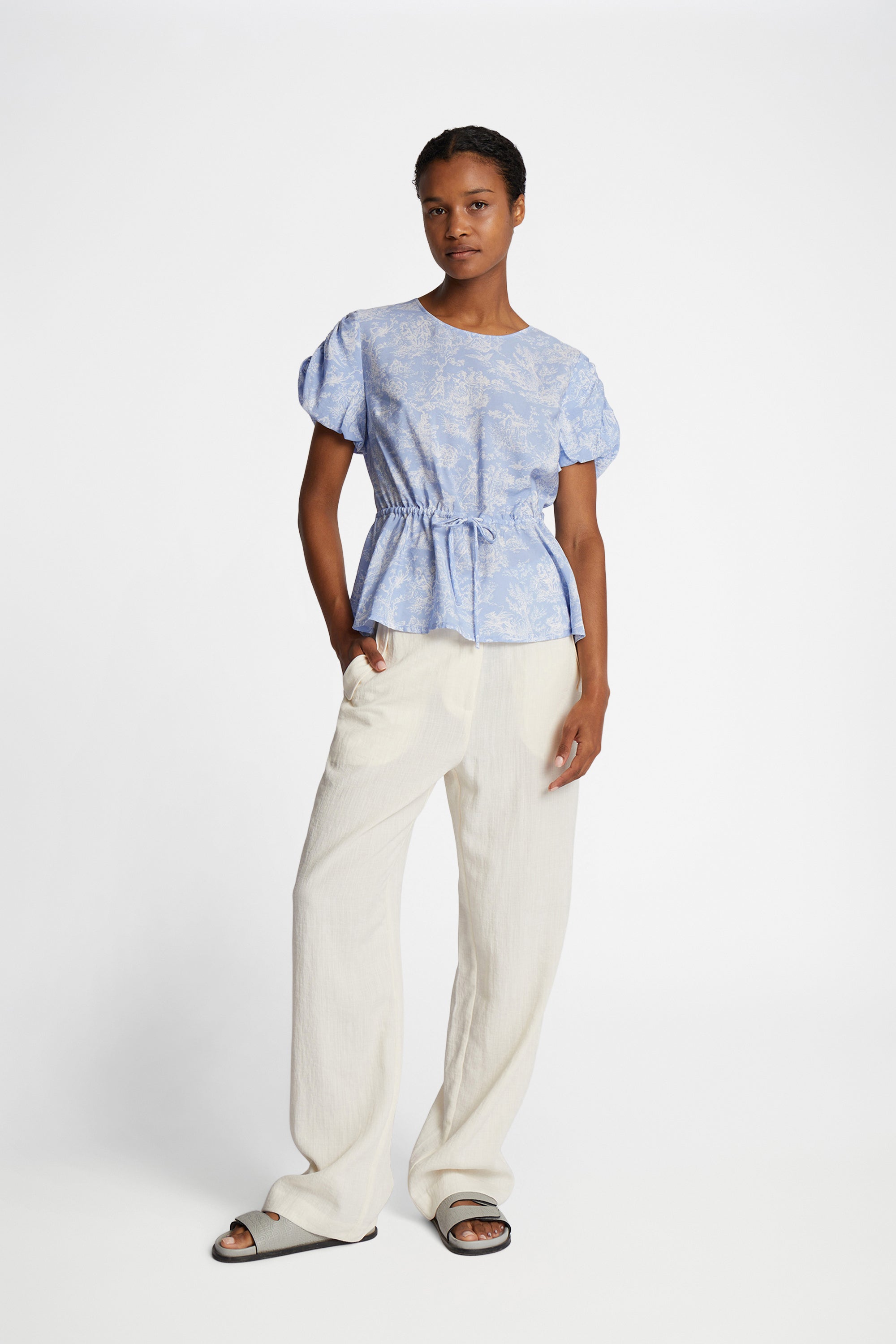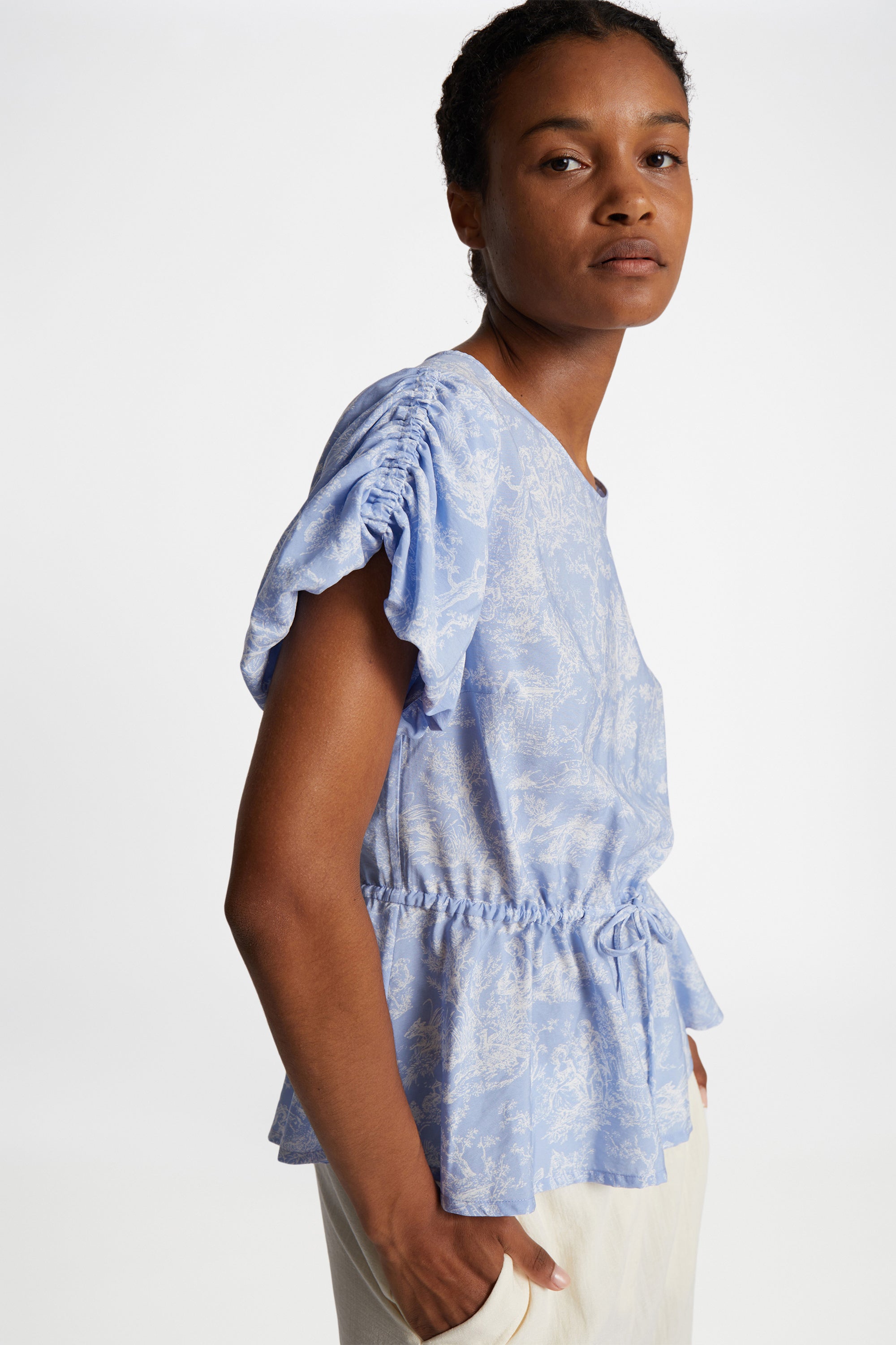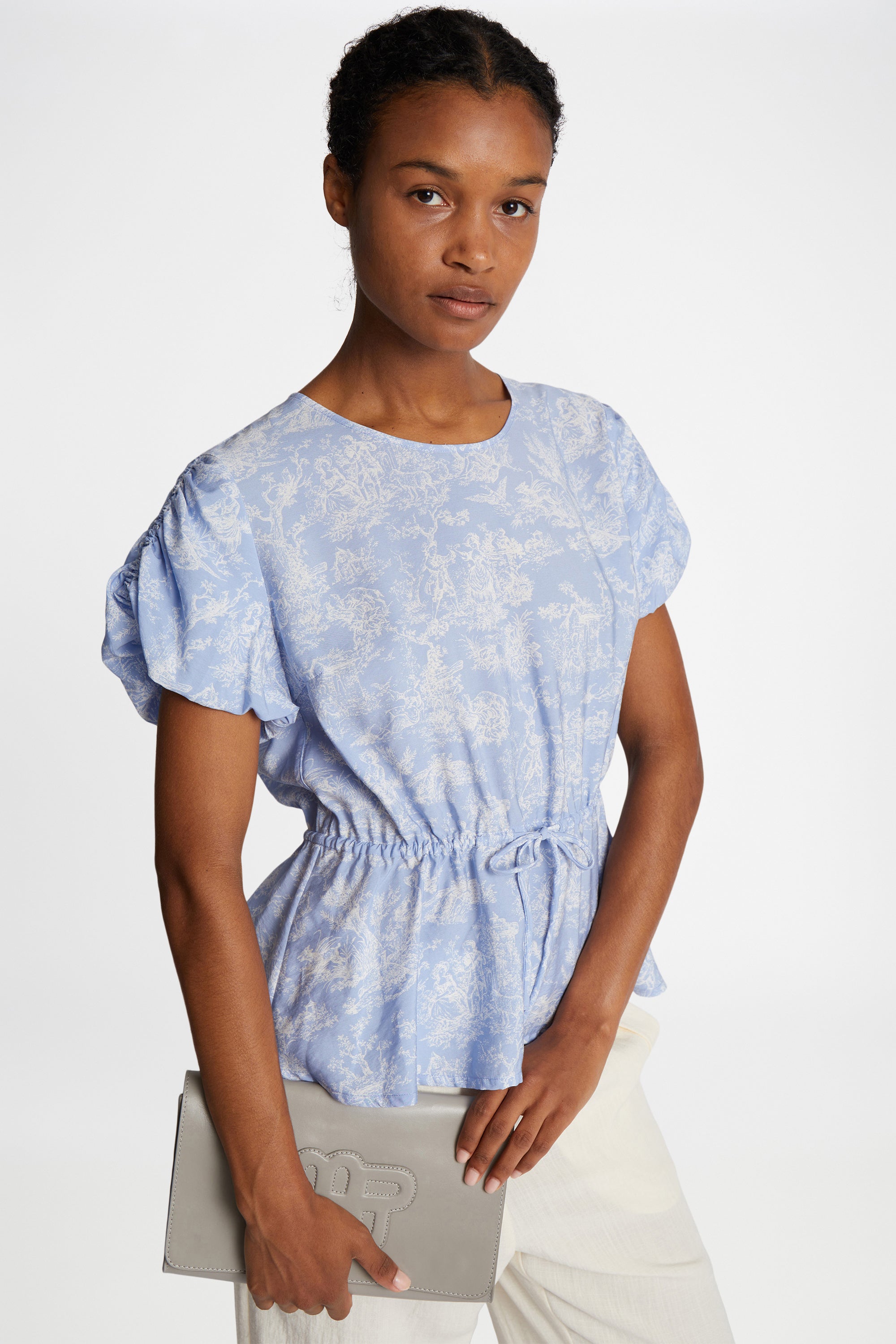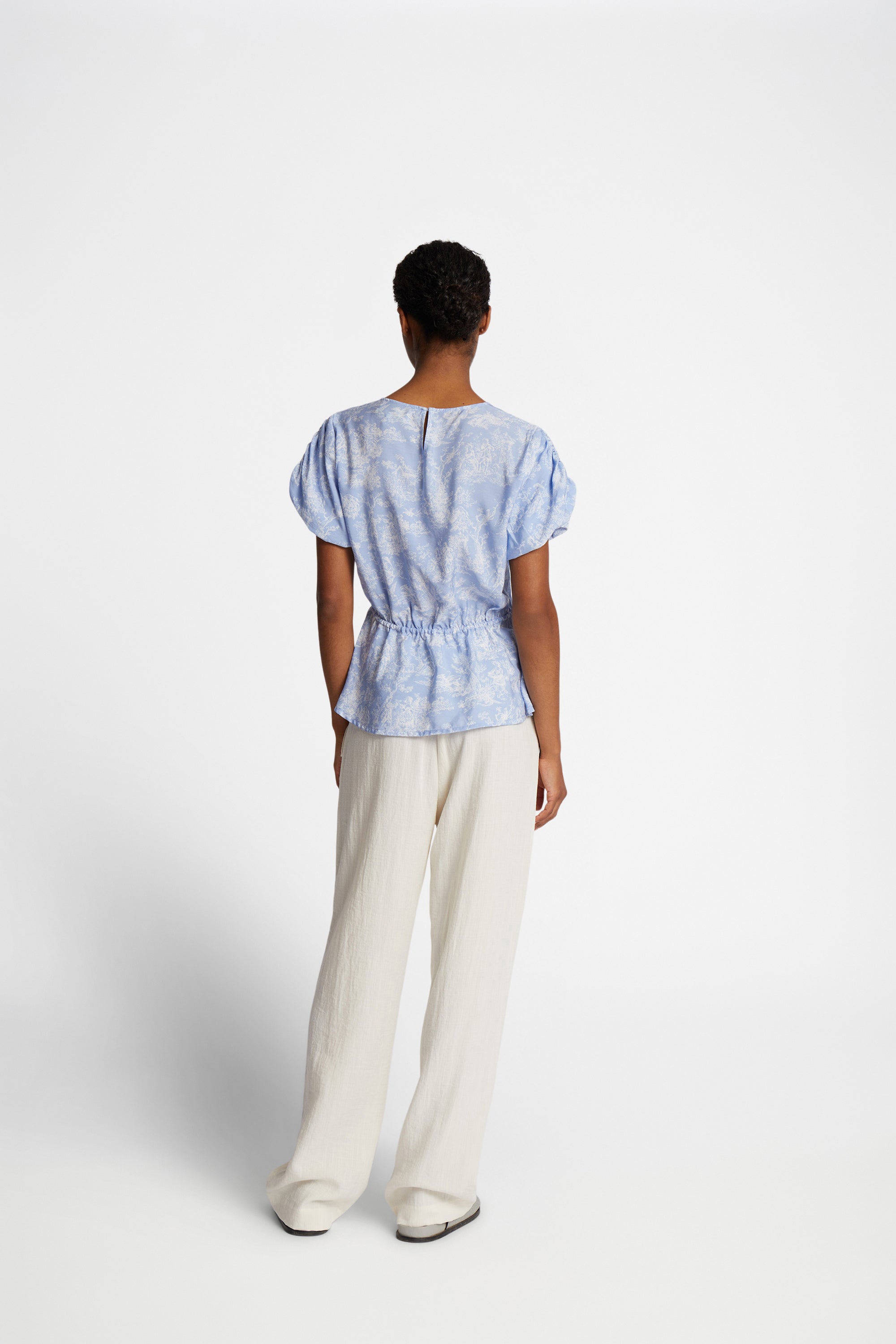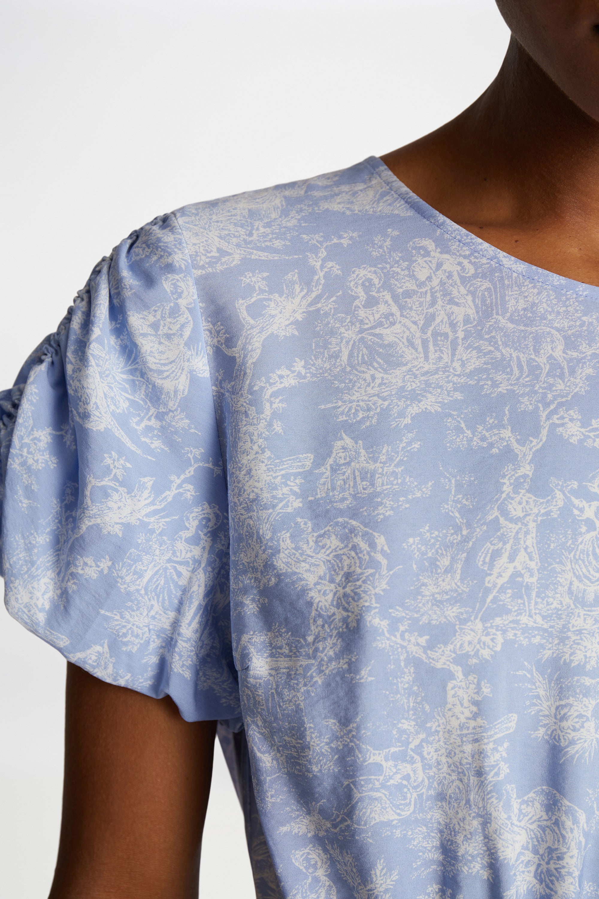Blouse designed with an elegant print, with elements of nostalgic charm. This blouse has beautiful ruched details on the shoulder and at the waist. The blouse is designed with short balloon sleeves and a small, elegant button closure at the neck.