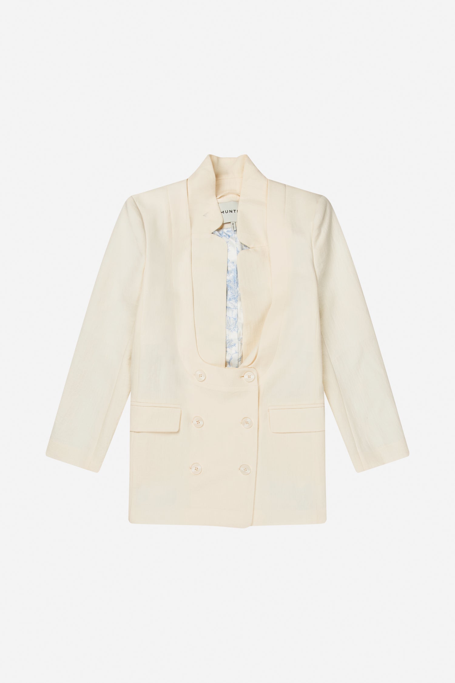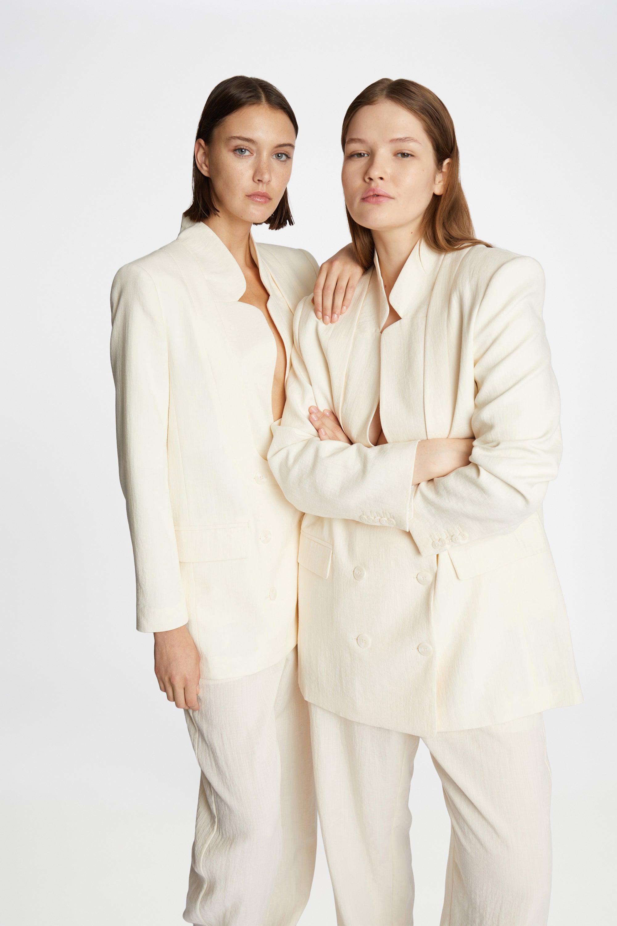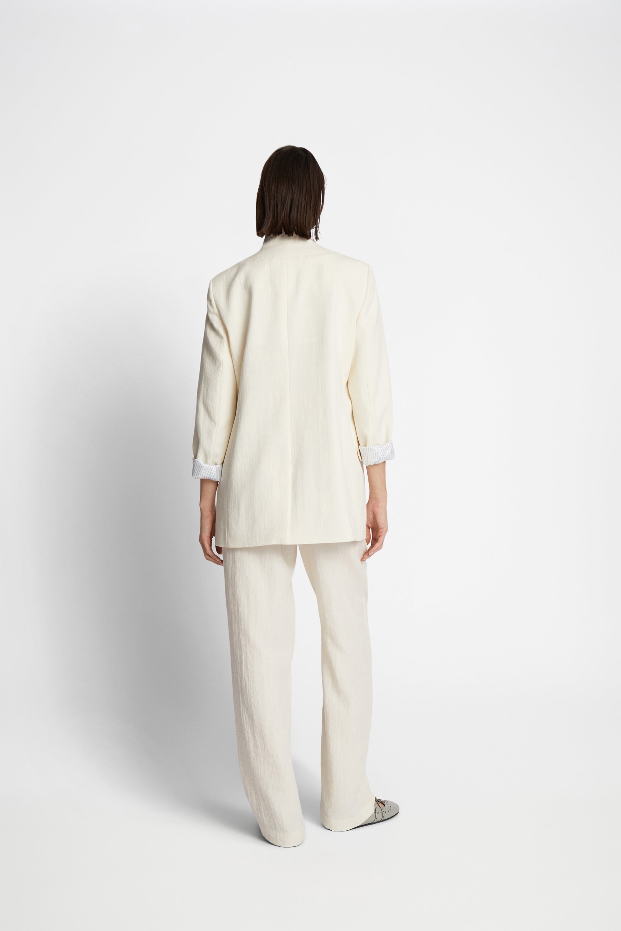 Beautiful jacket with an elegant long collar and a double row closing. The jacket has pockets, long sleeves and a beautiful pinstriped lining.