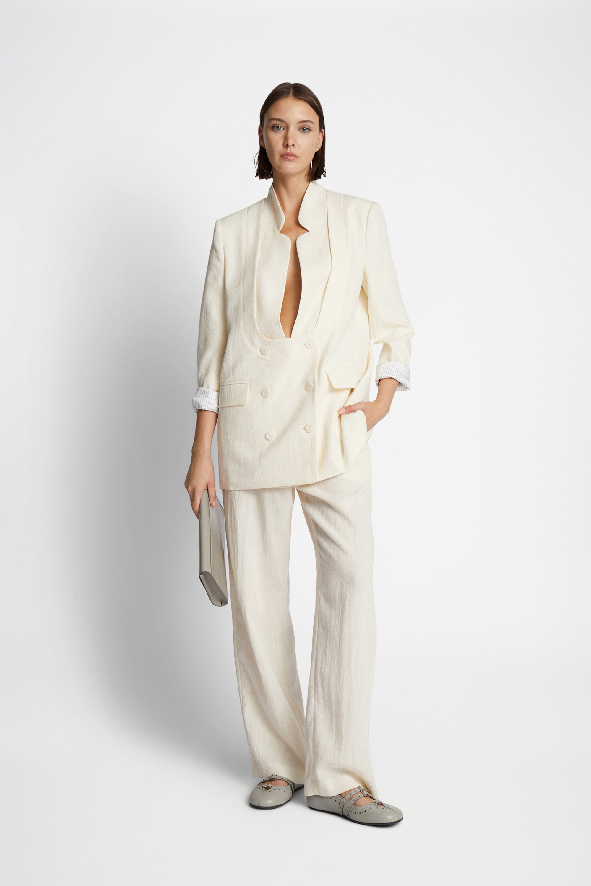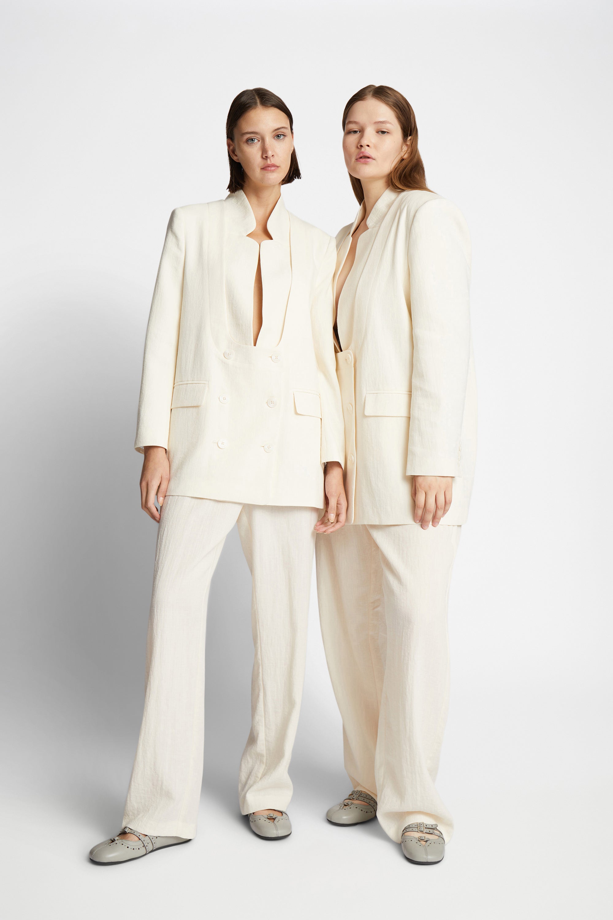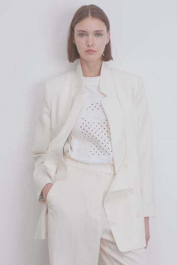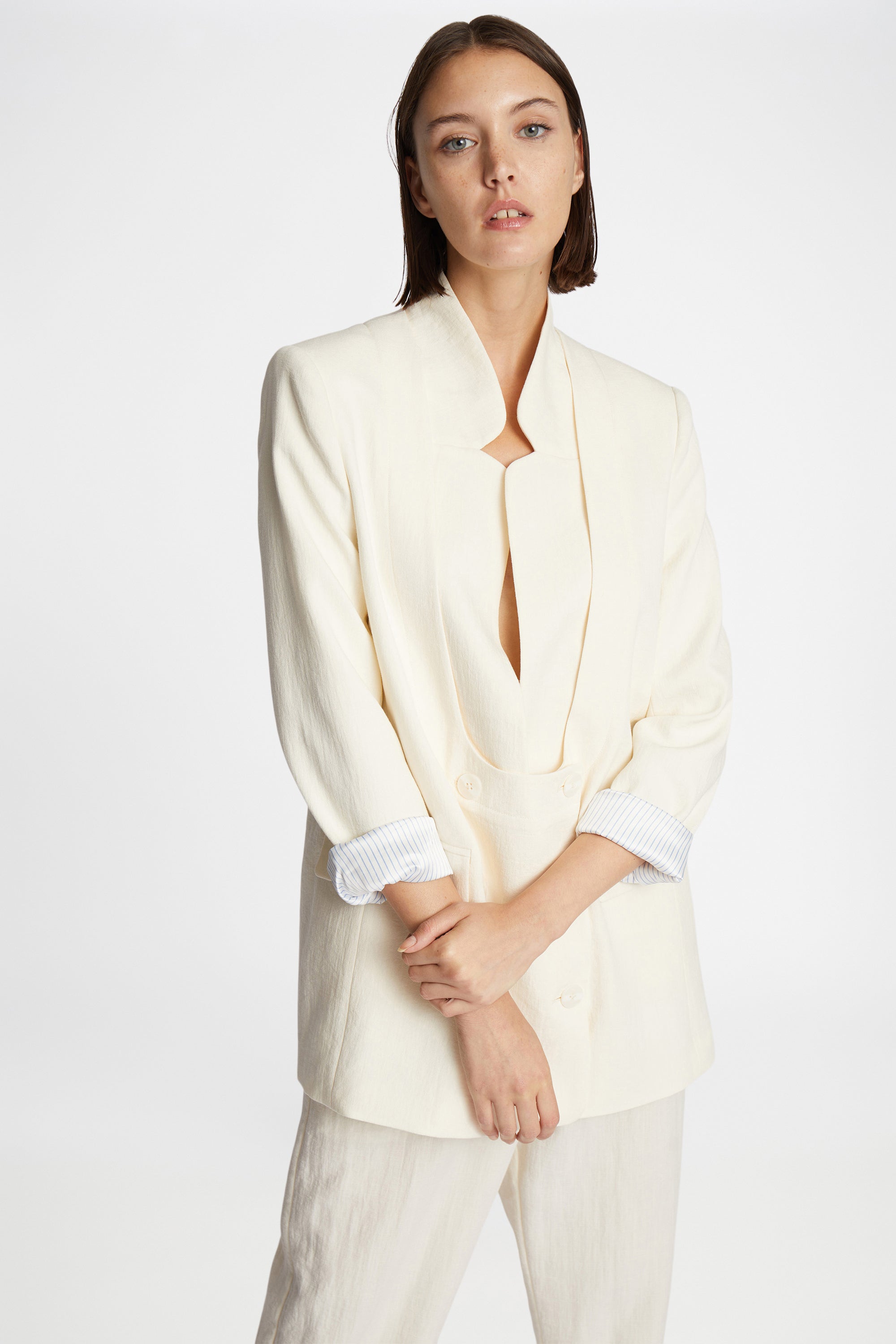 Beautiful jacket with an elegant long collar and a double row closing. The jacket has pockets, long sleeves and a beautiful pinstriped lining.
