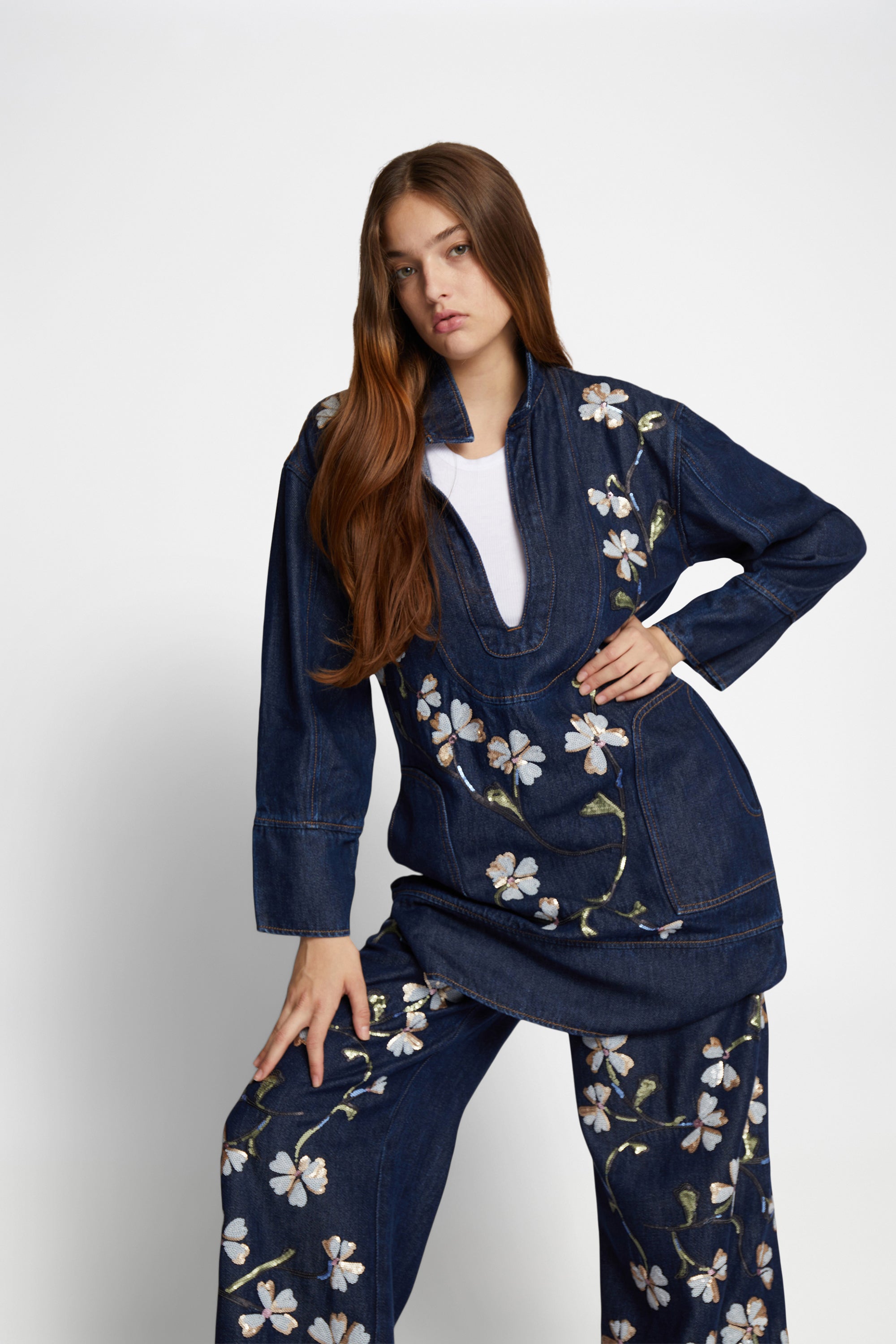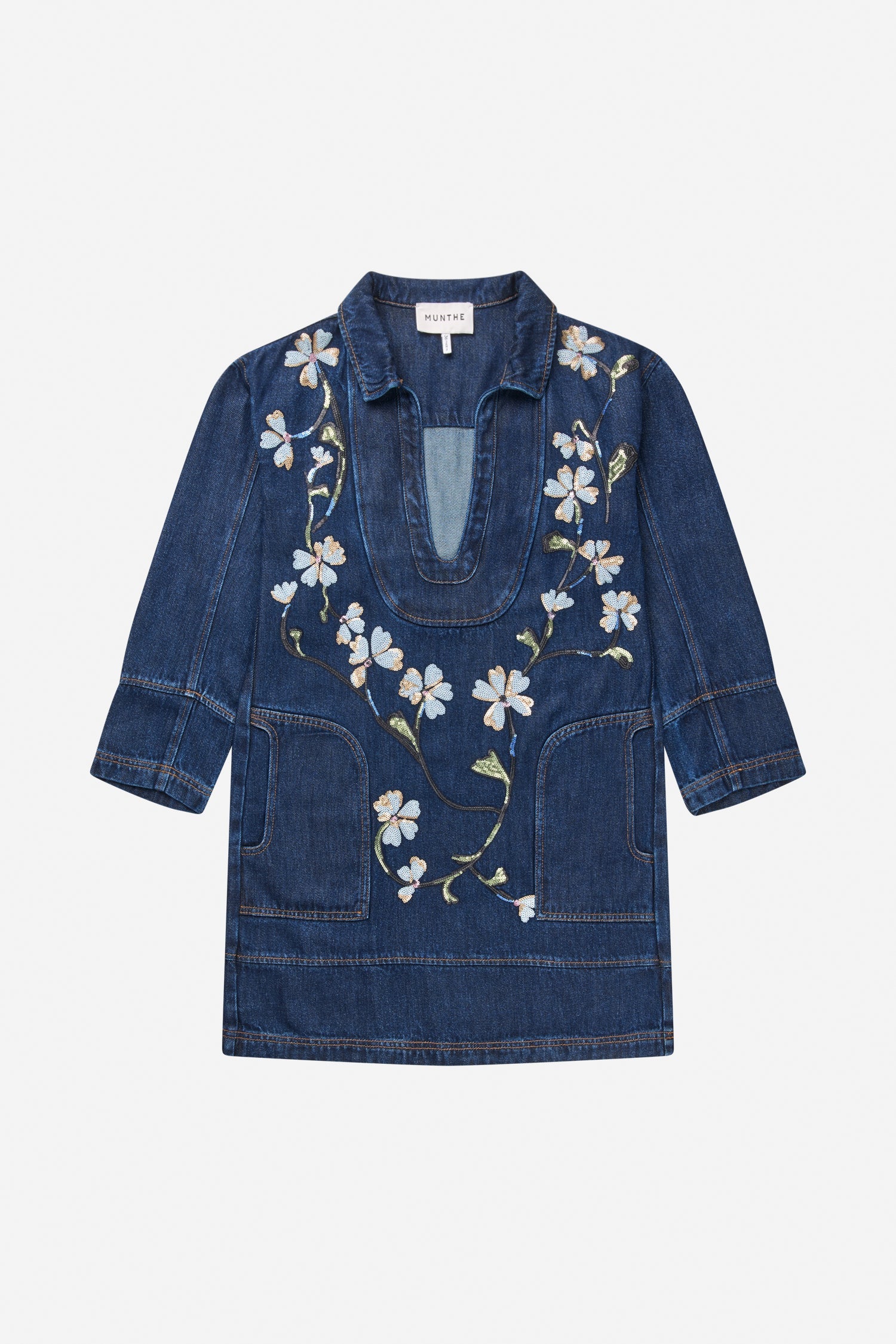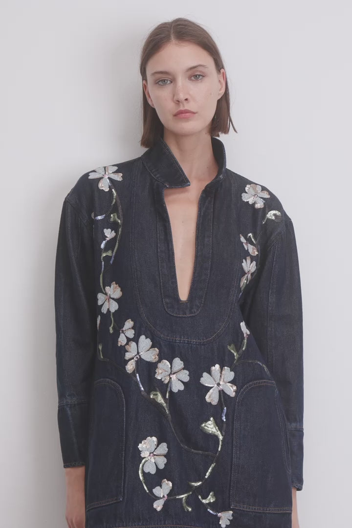 An elegant denim dress with a beautiful sequins flower pattern. This dress has a deep v-neck, and is designed with large side pockets and small slits on each side of the dress.