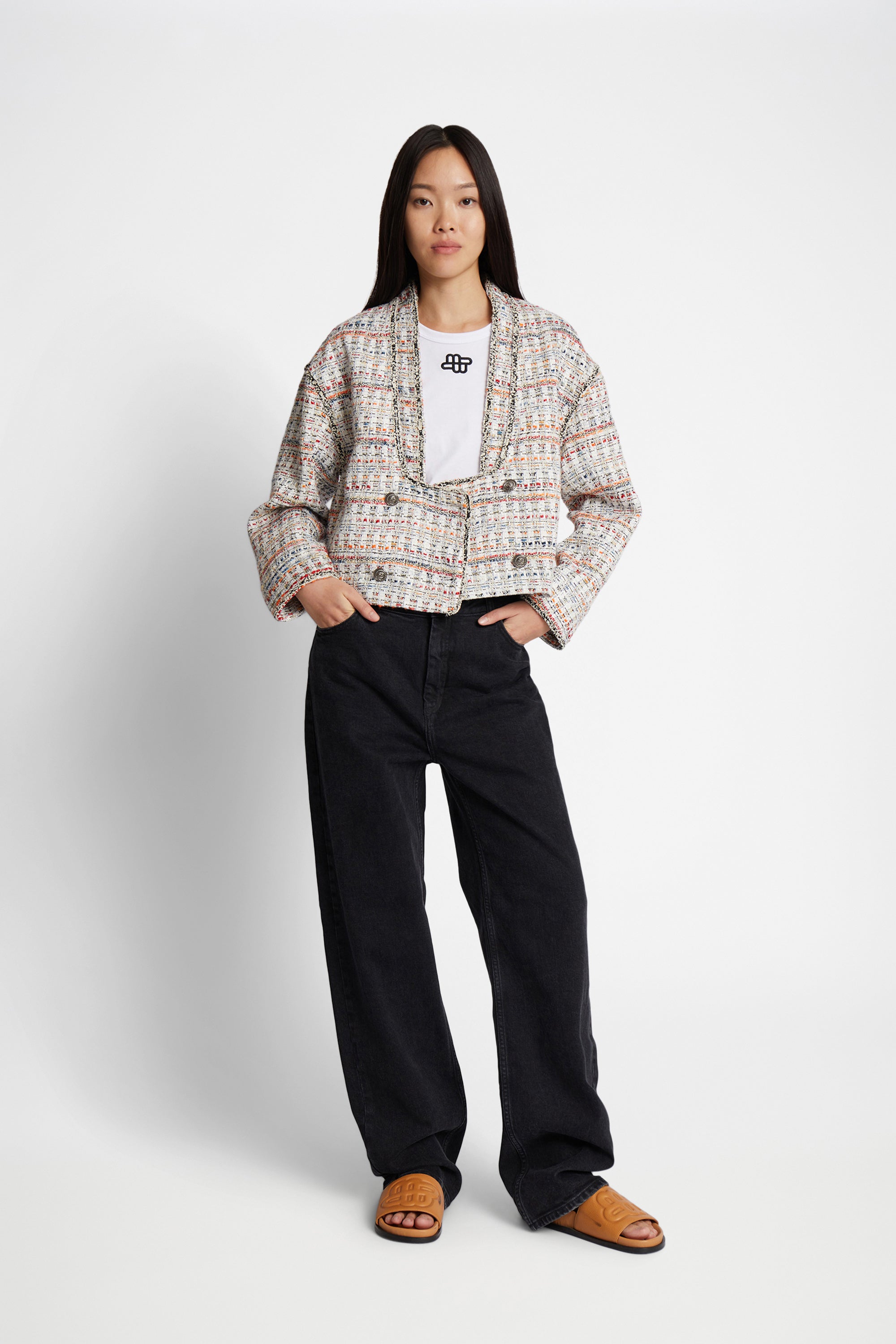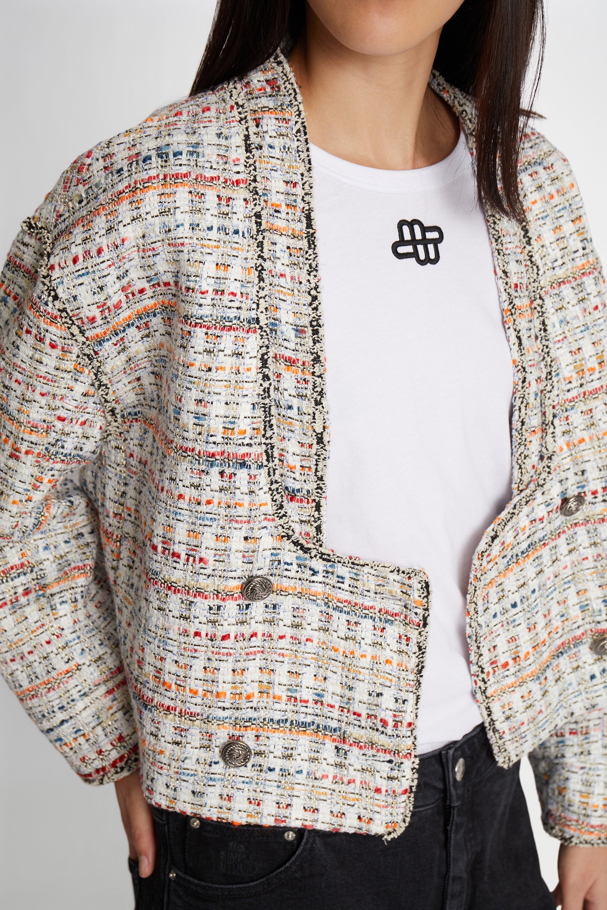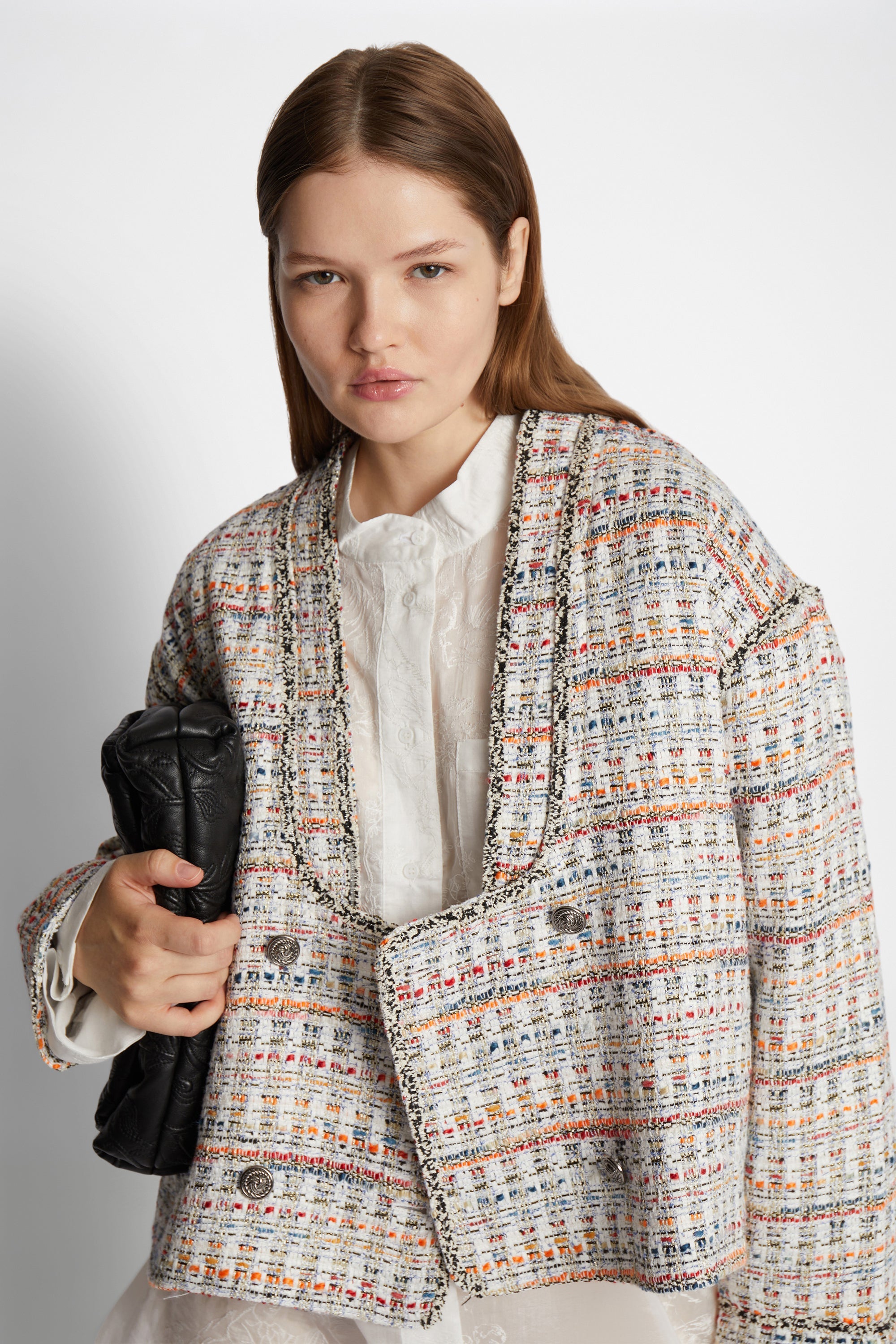 A short, beautiful bouclé jacket with an elegant long collar and a double row closing. The jacket has drop shoulders and long sleeves.
