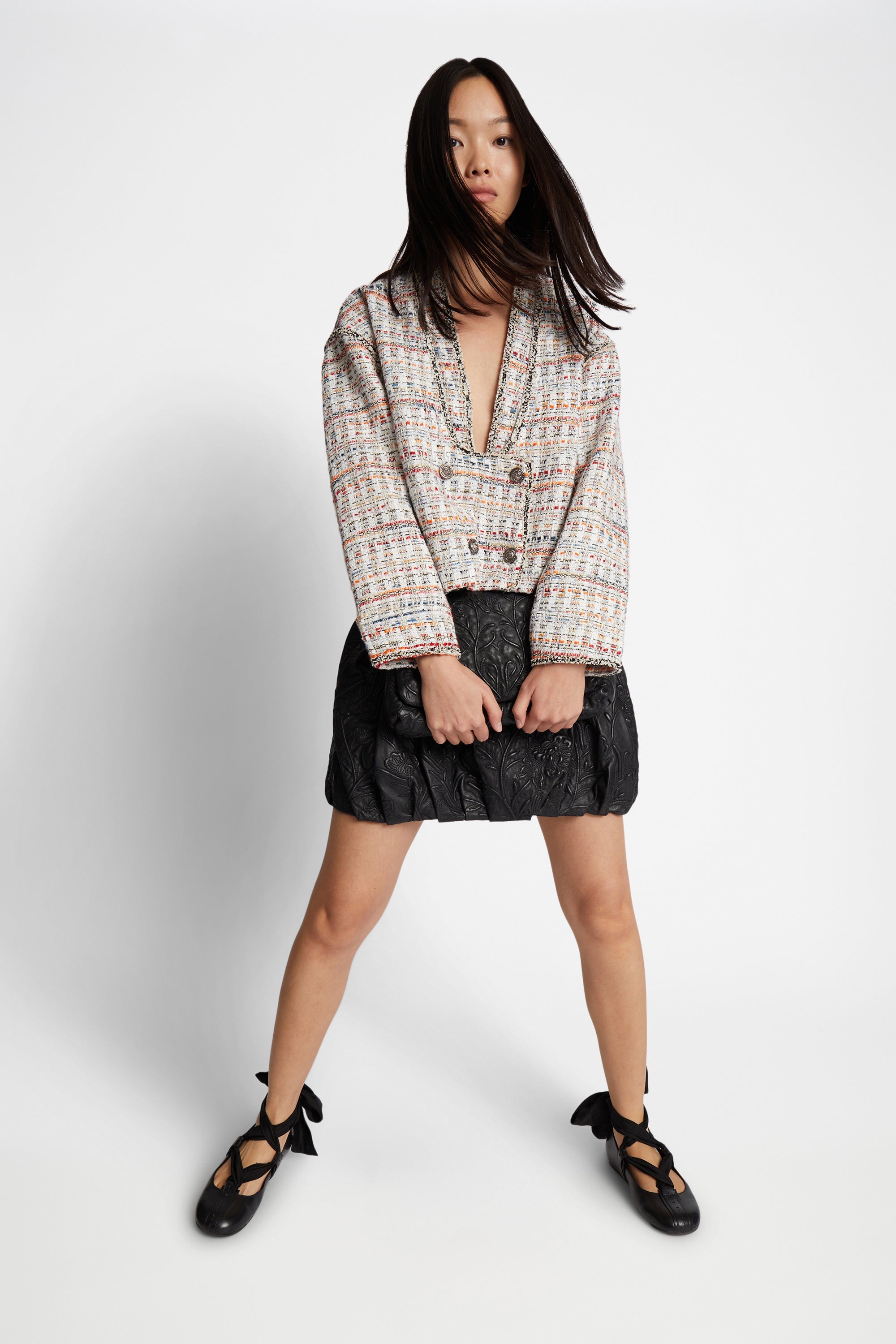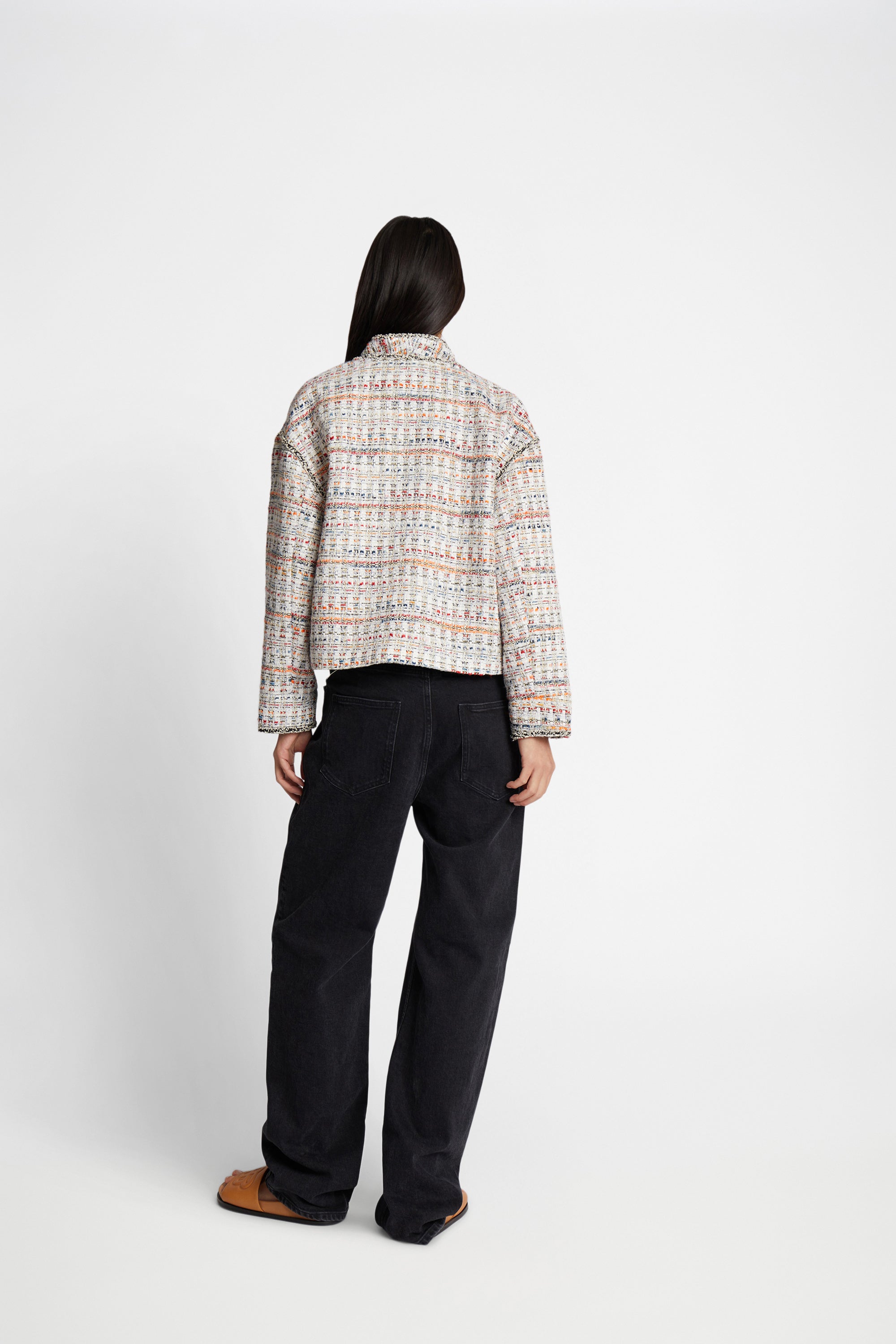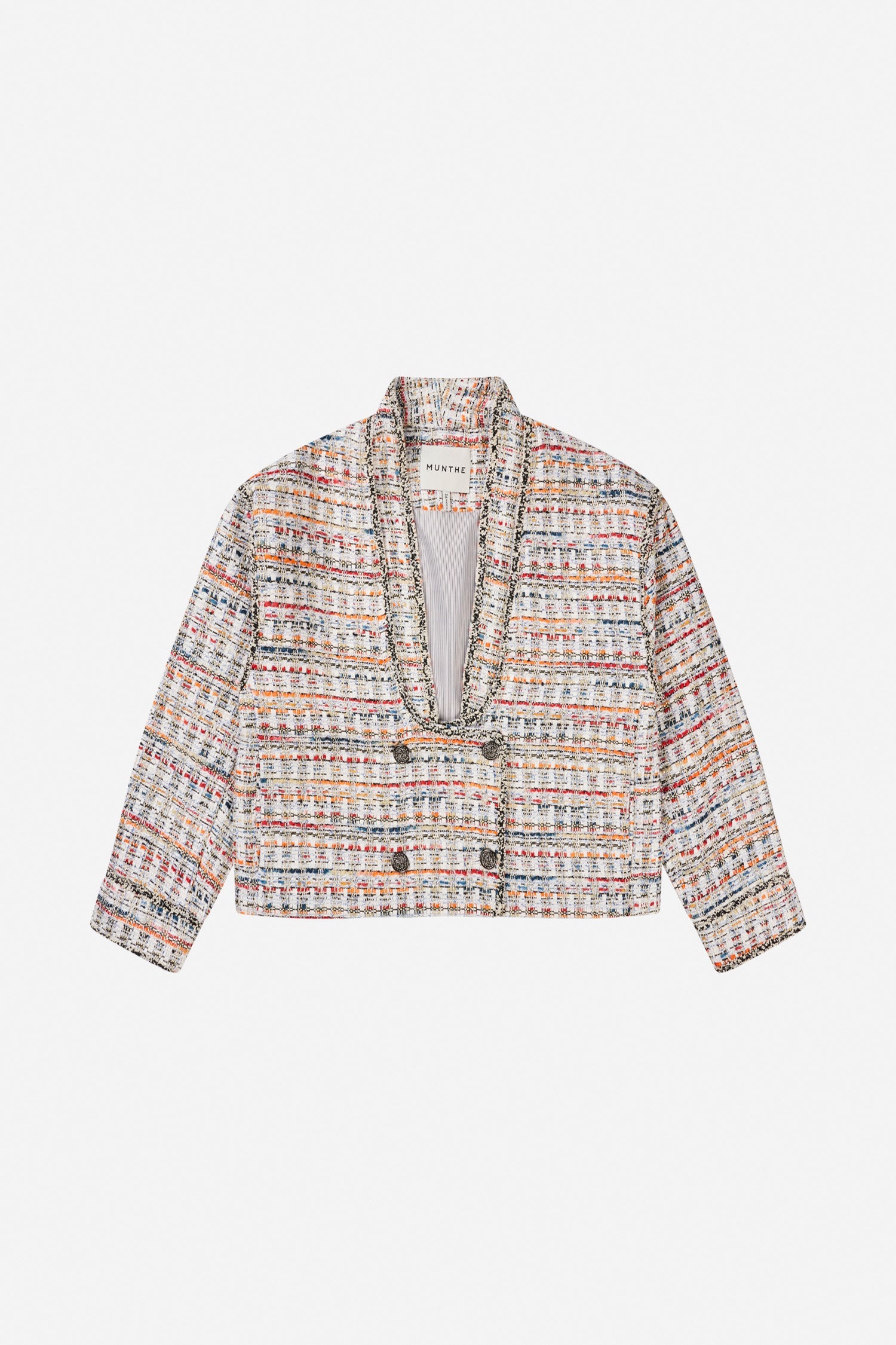 A short, beautiful bouclé jacket with an elegant long collar and a double row closing. The jacket has drop shoulders and long sleeves.