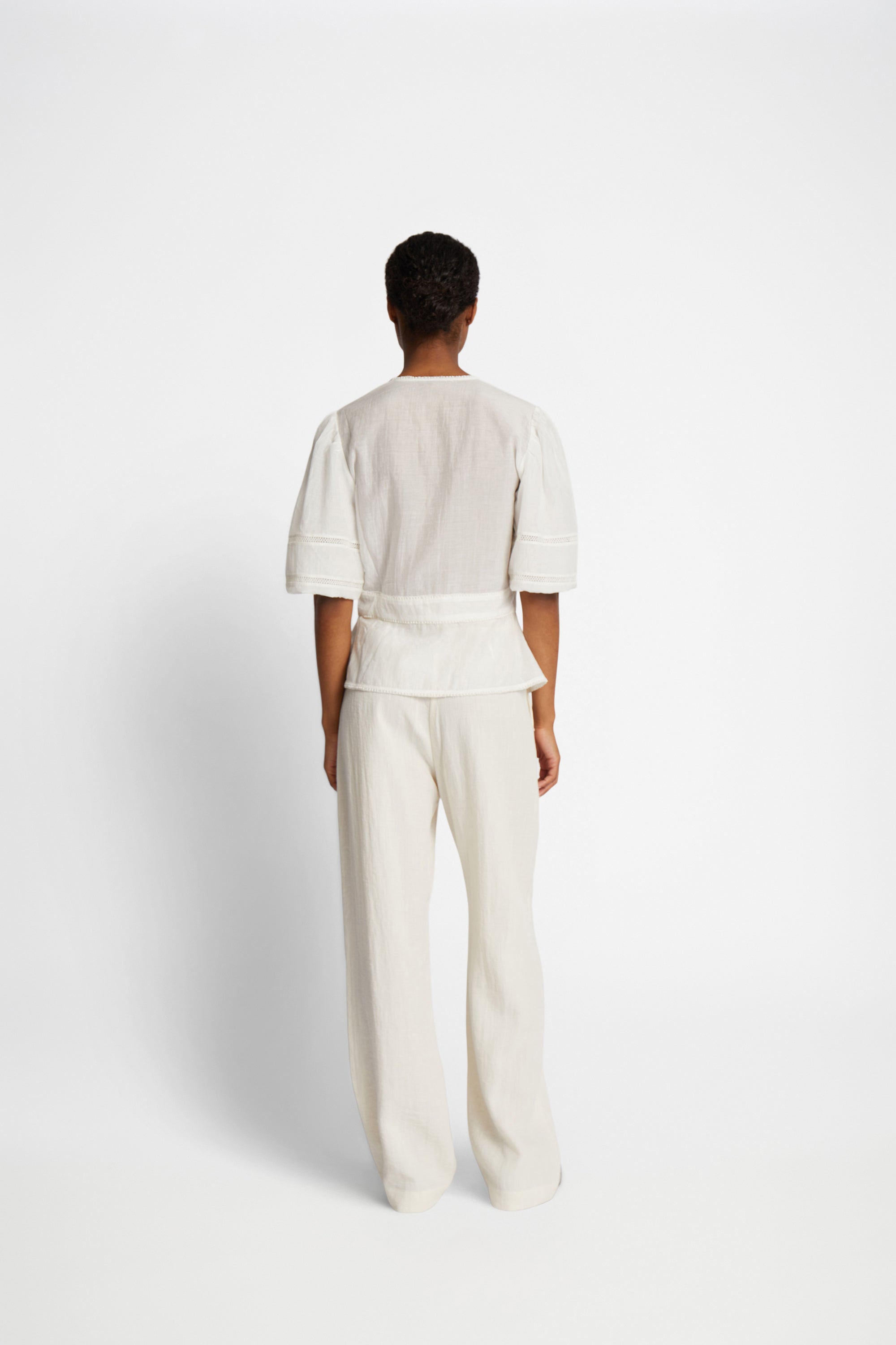Blouse with beautiful see-through details, and an elegant waistband. This blouse is designed with a deep v-neck and made from an organic cotton blend.